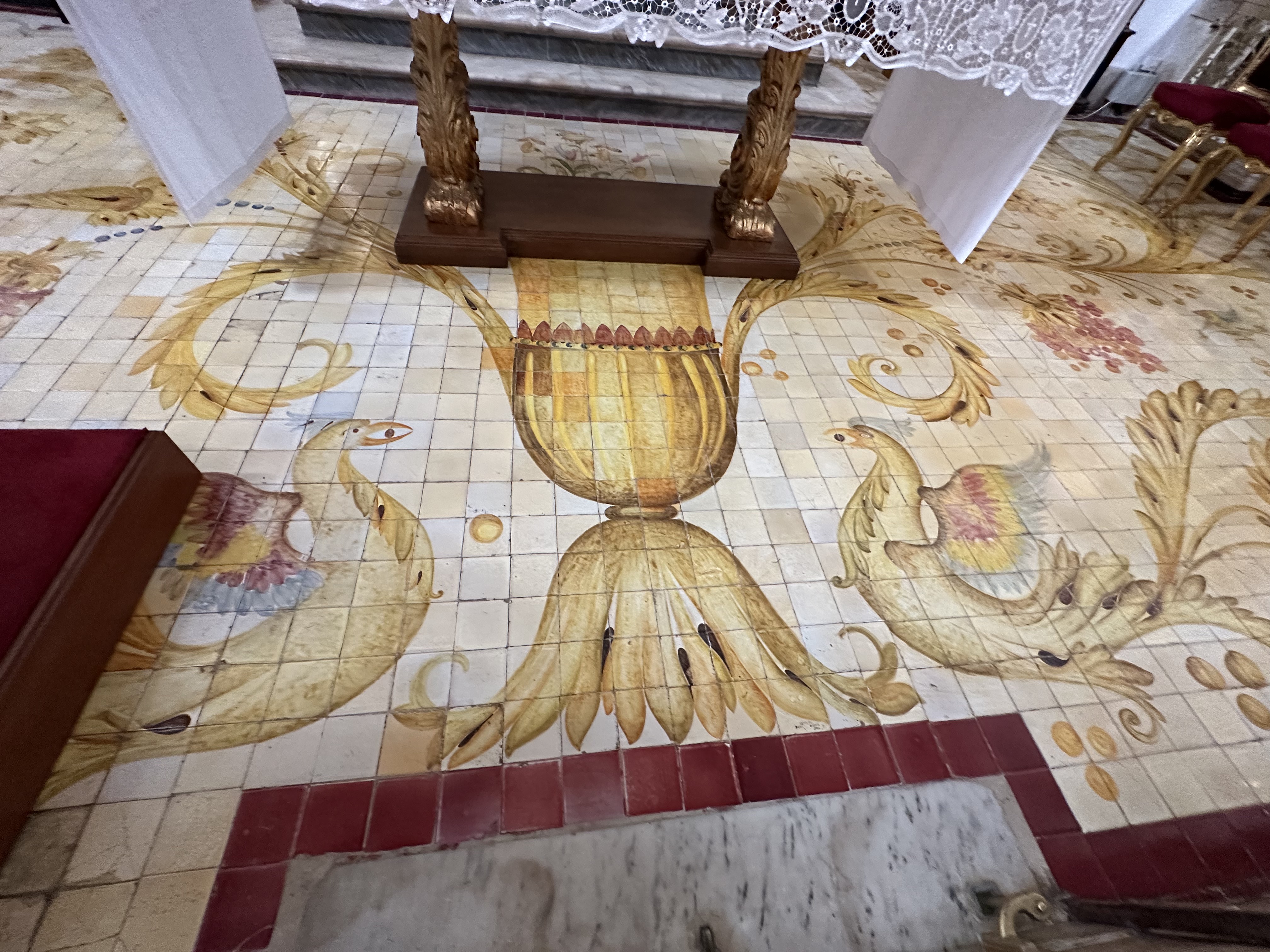 The Church of St Maria di Asunti. Medieval exteriorThe real marble alter and gilded wooden choir are from 1700’sCeramic Rococo tile floor under the altarPolignano city streetA colorful shop The fancy organ above the entrance doorEntrance gate to Polignano is 1600’s Renaissance.Garden stairs Houses with more exterior stairs
