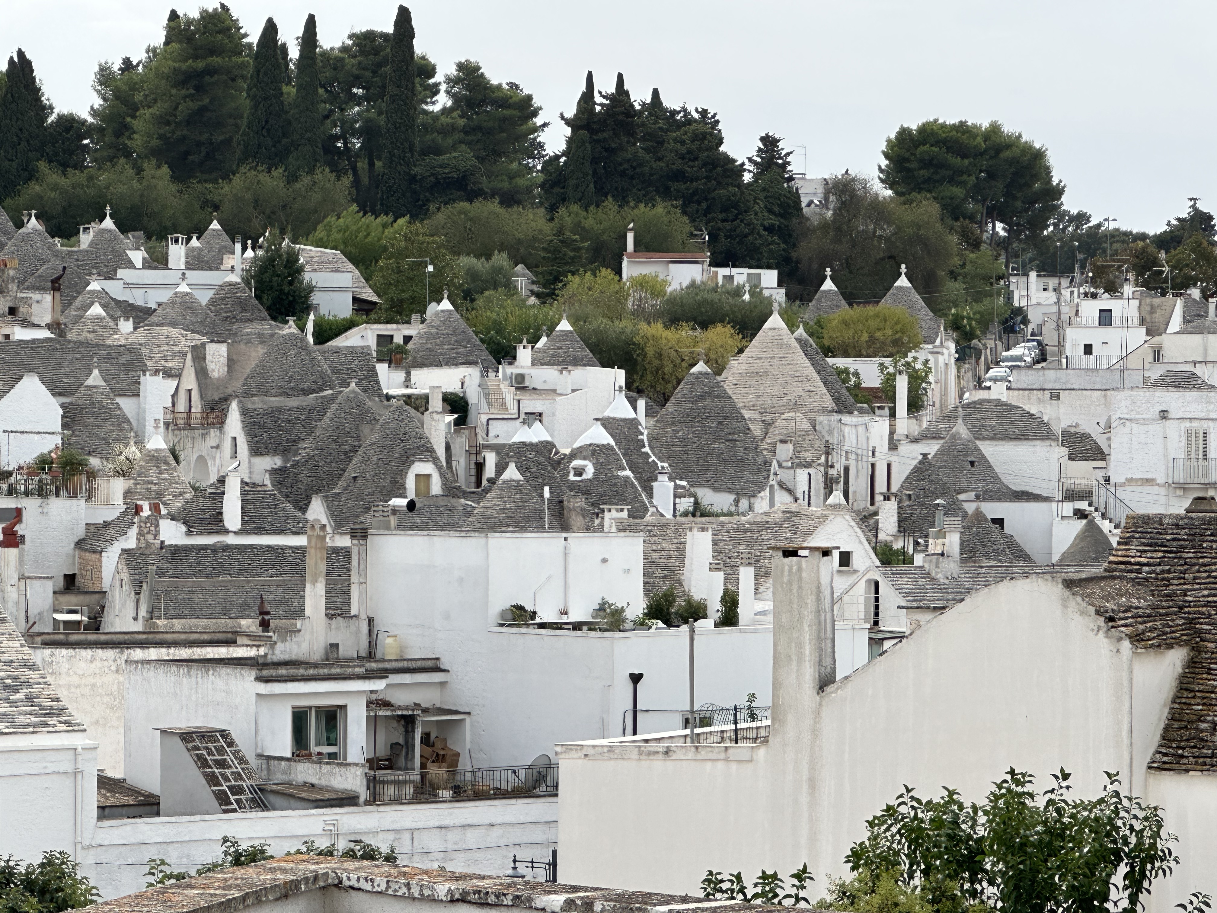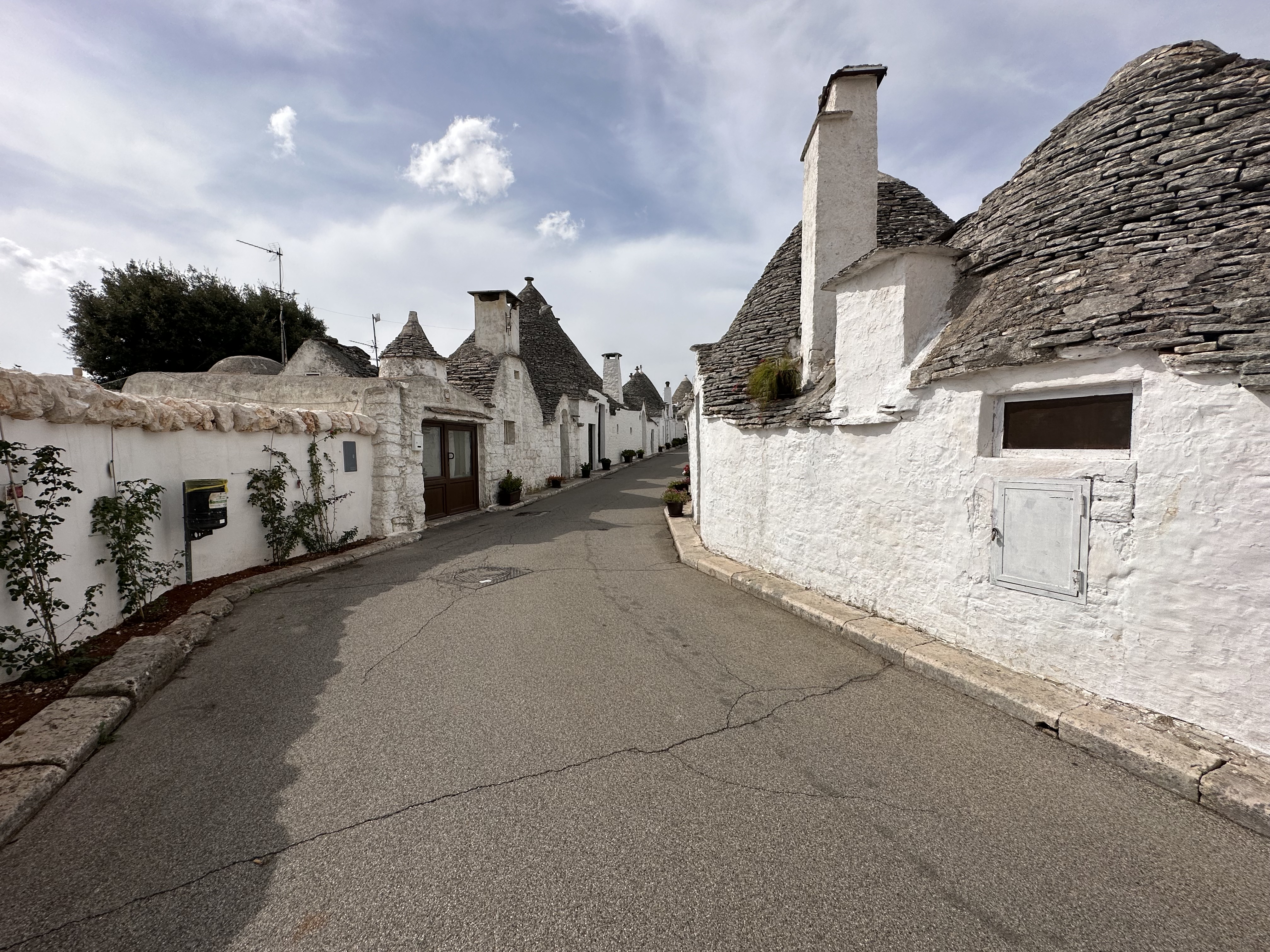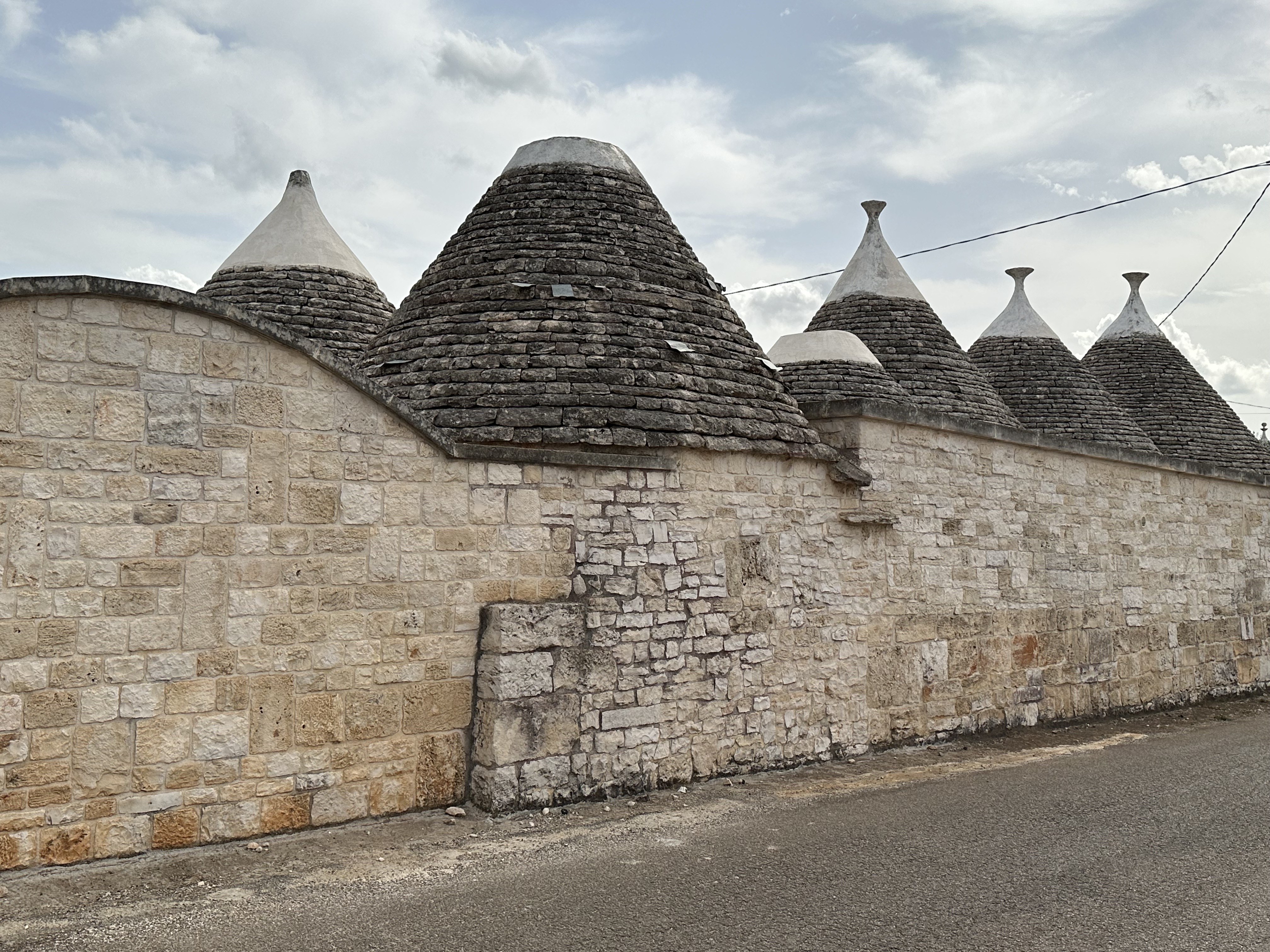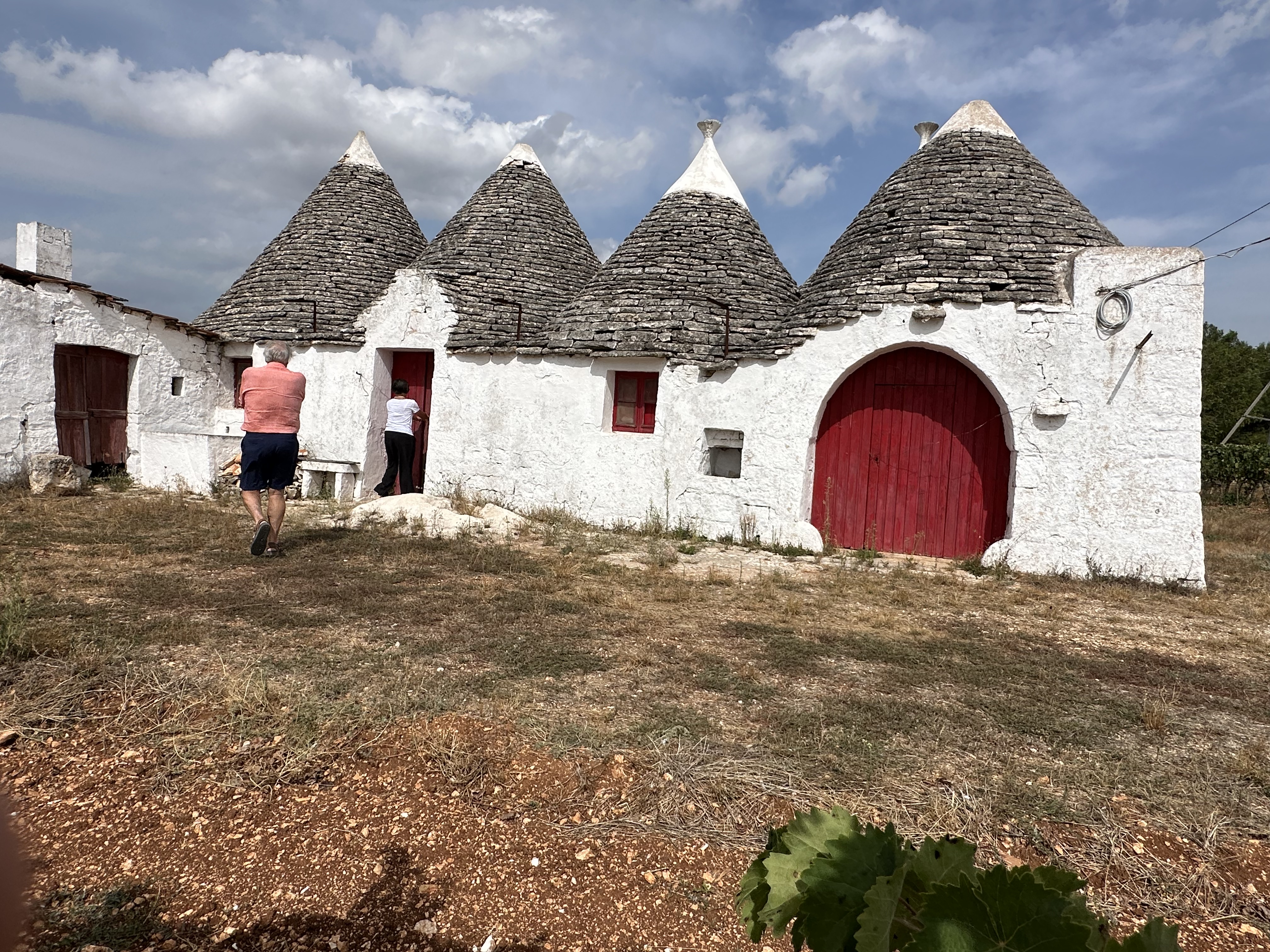 We spent our last full day in Puglia with Silvia visiting 2 more towns in the Valle d’Itria and watching a cheese maker create his specialities of mozzarella and burrata cheeses.. The landscape consists of karst Murgia hills and large caves covered in dense vegetation and a cultivated plateau with red terrain that extends to the sea. The countryside is dotted with conical, white stone structures called trulli.