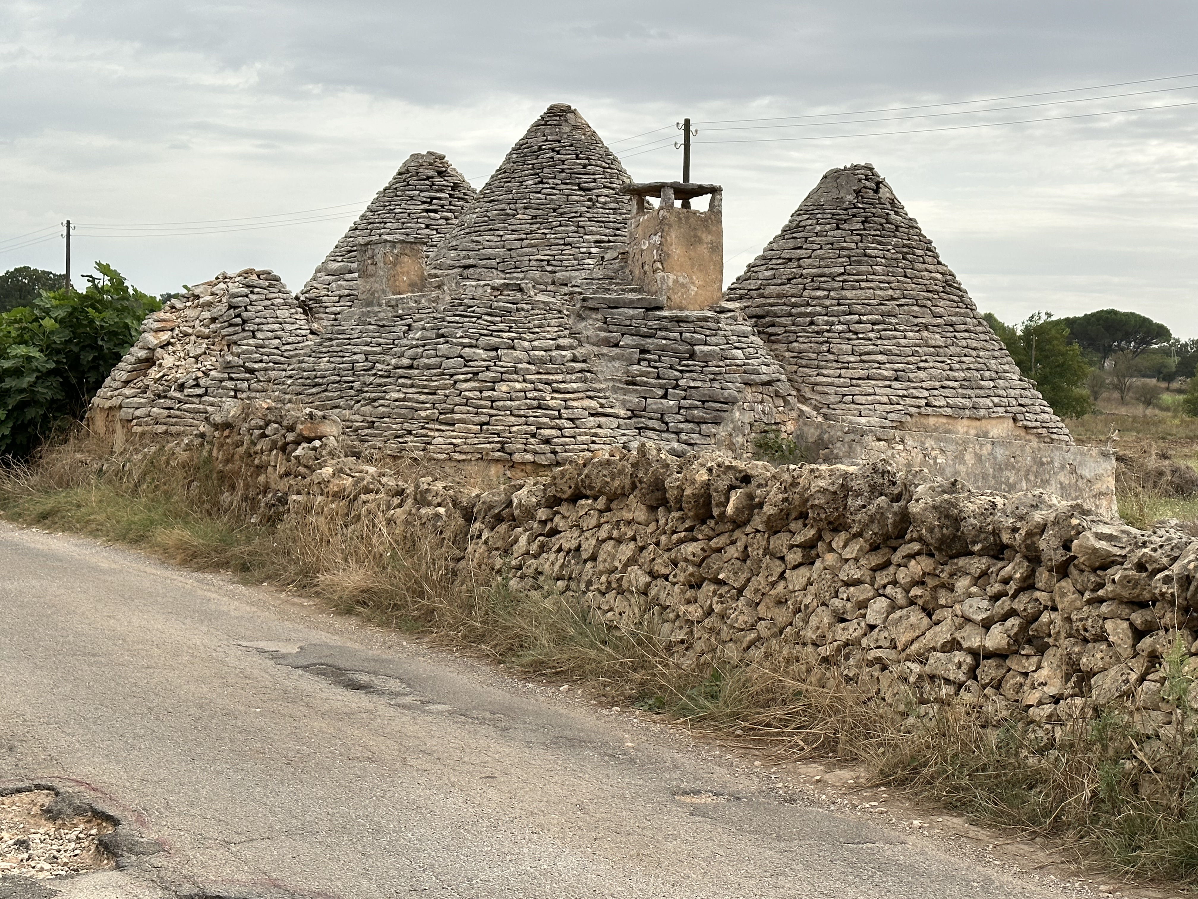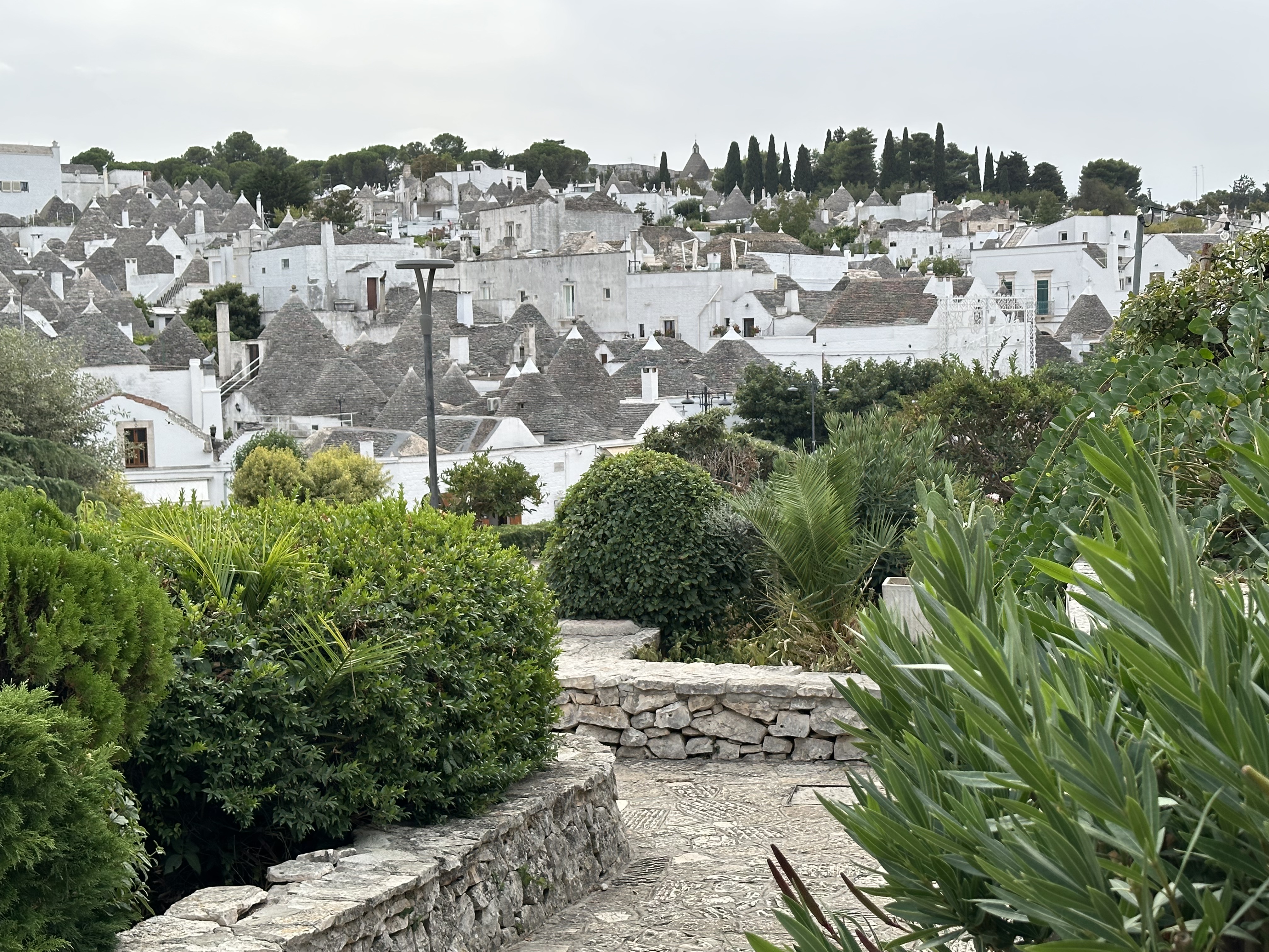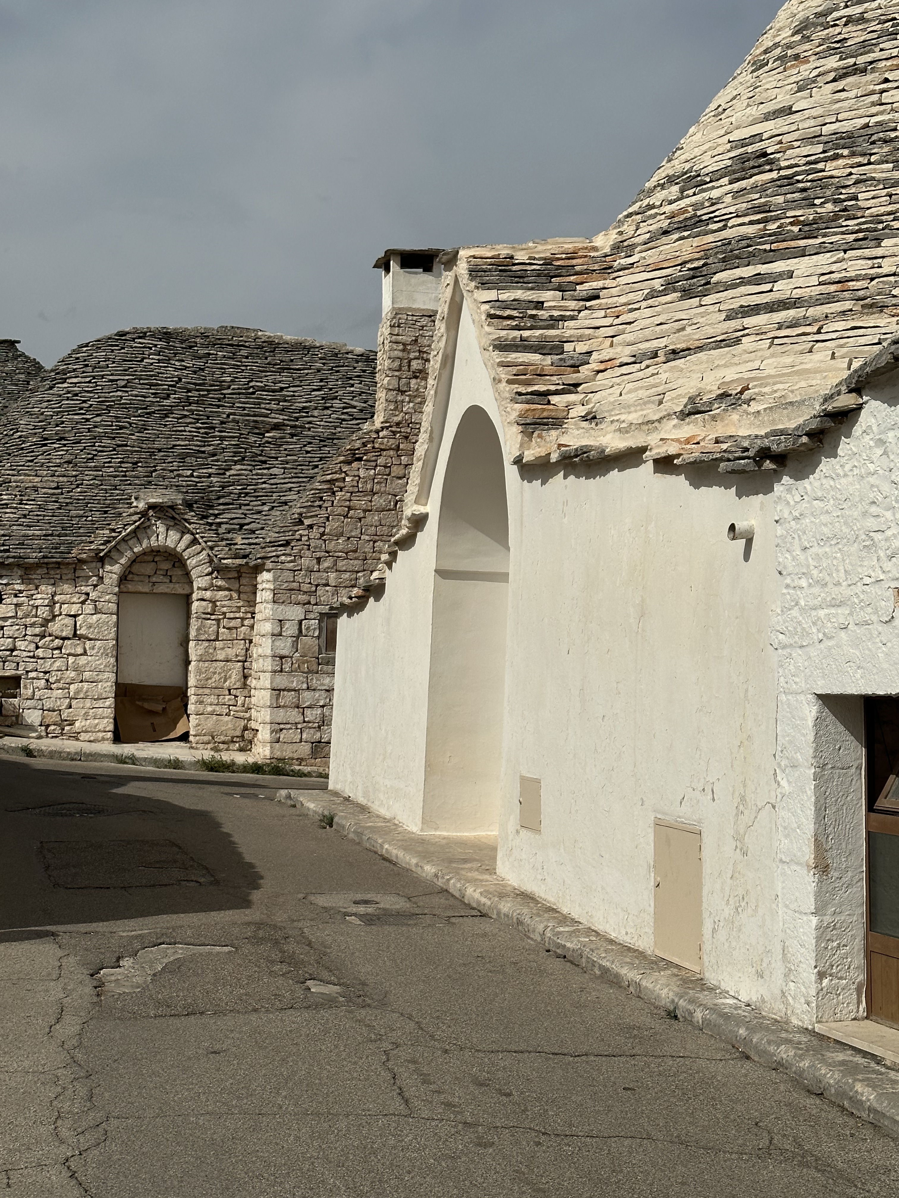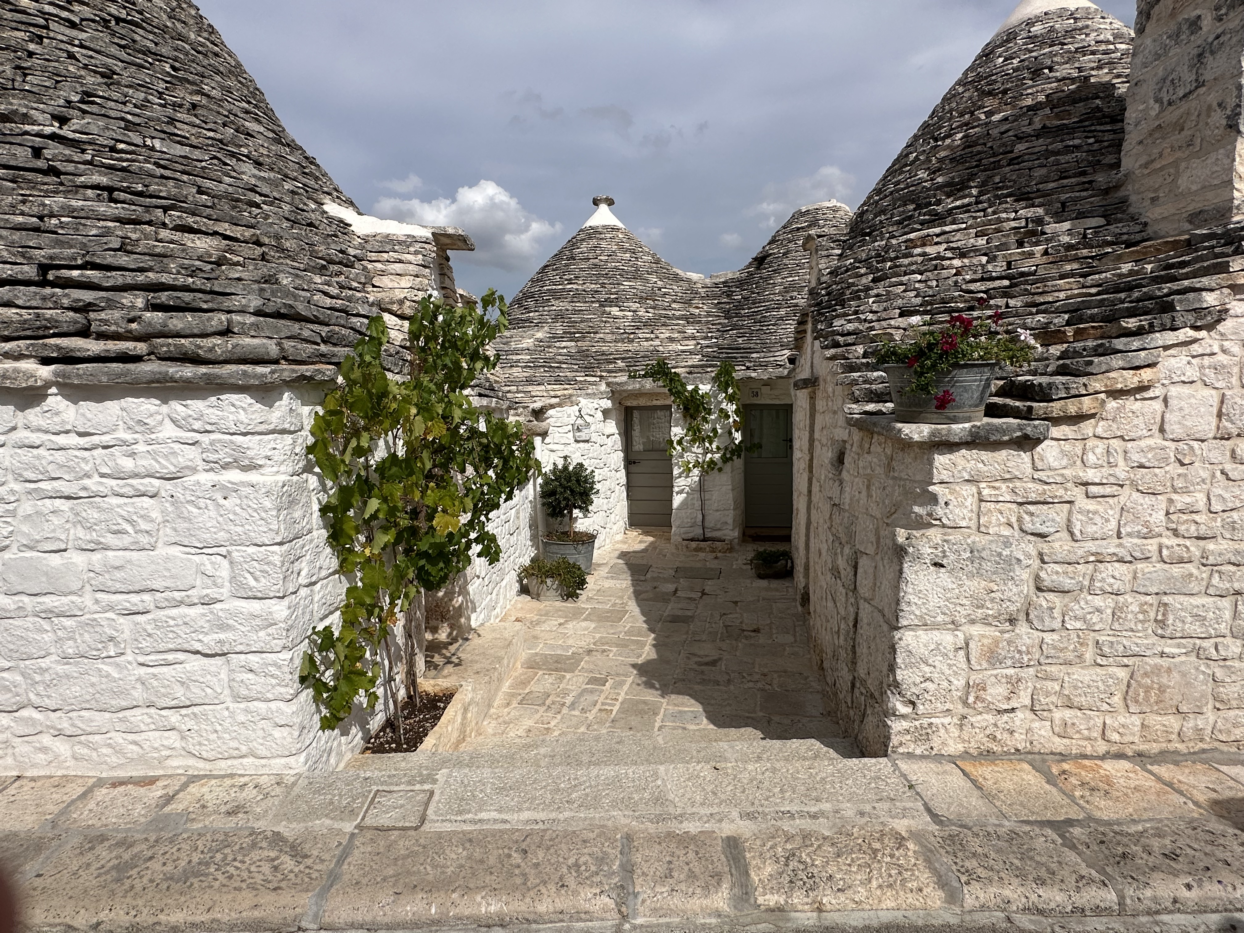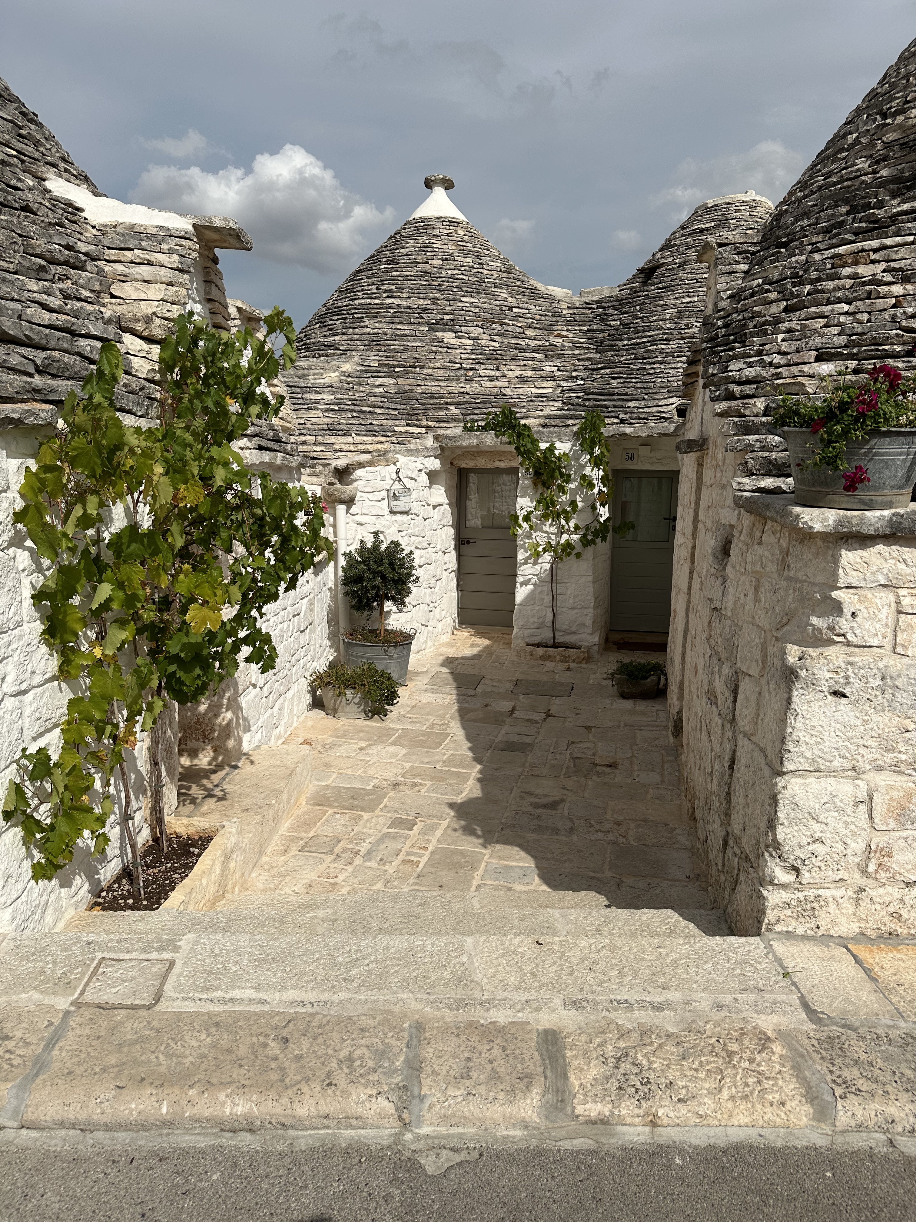 We spent our last full day in Puglia with Silvia visiting 2 more towns in the Valle d’Itria and watching a cheese maker create his specialities of mozzarella and burrata cheeses.. The landscape consists of karst Murgia hills and large caves covered in dense vegetation and a cultivated plateau with red terrain that extends to the sea. The countryside is dotted with conical, white stone structures called trulli.