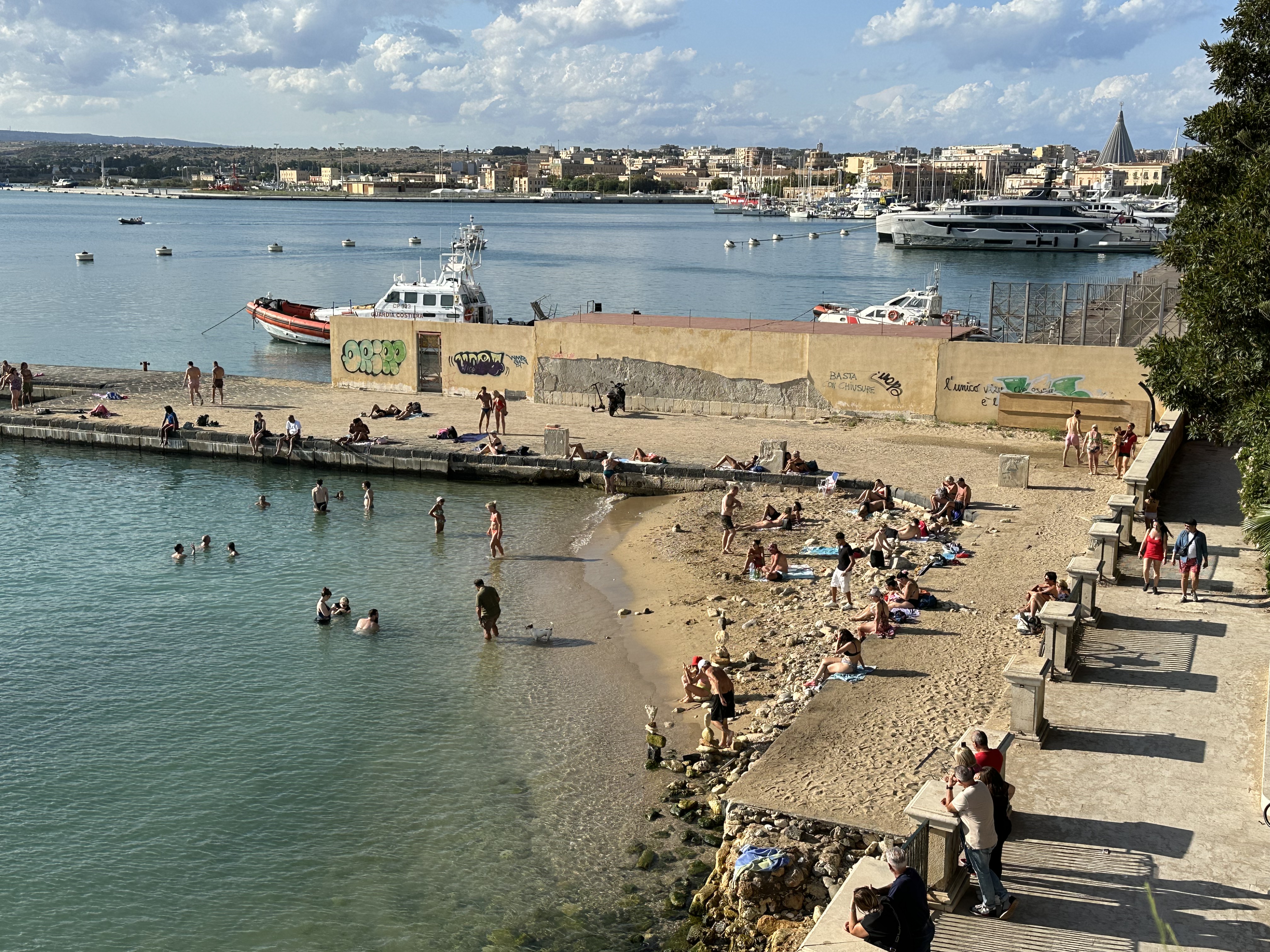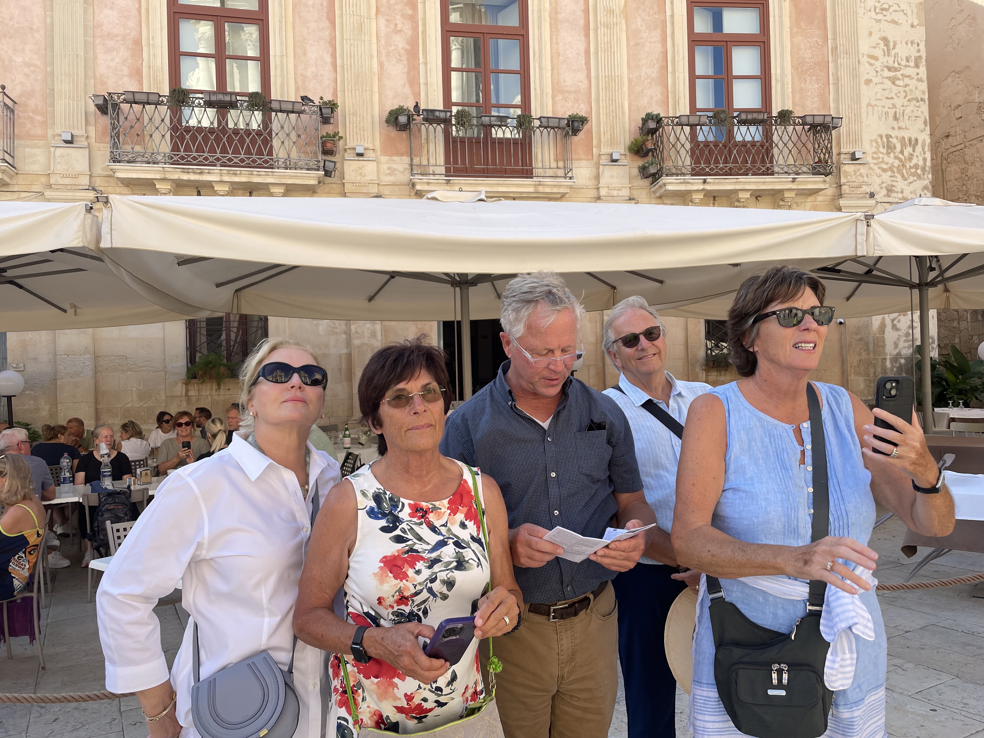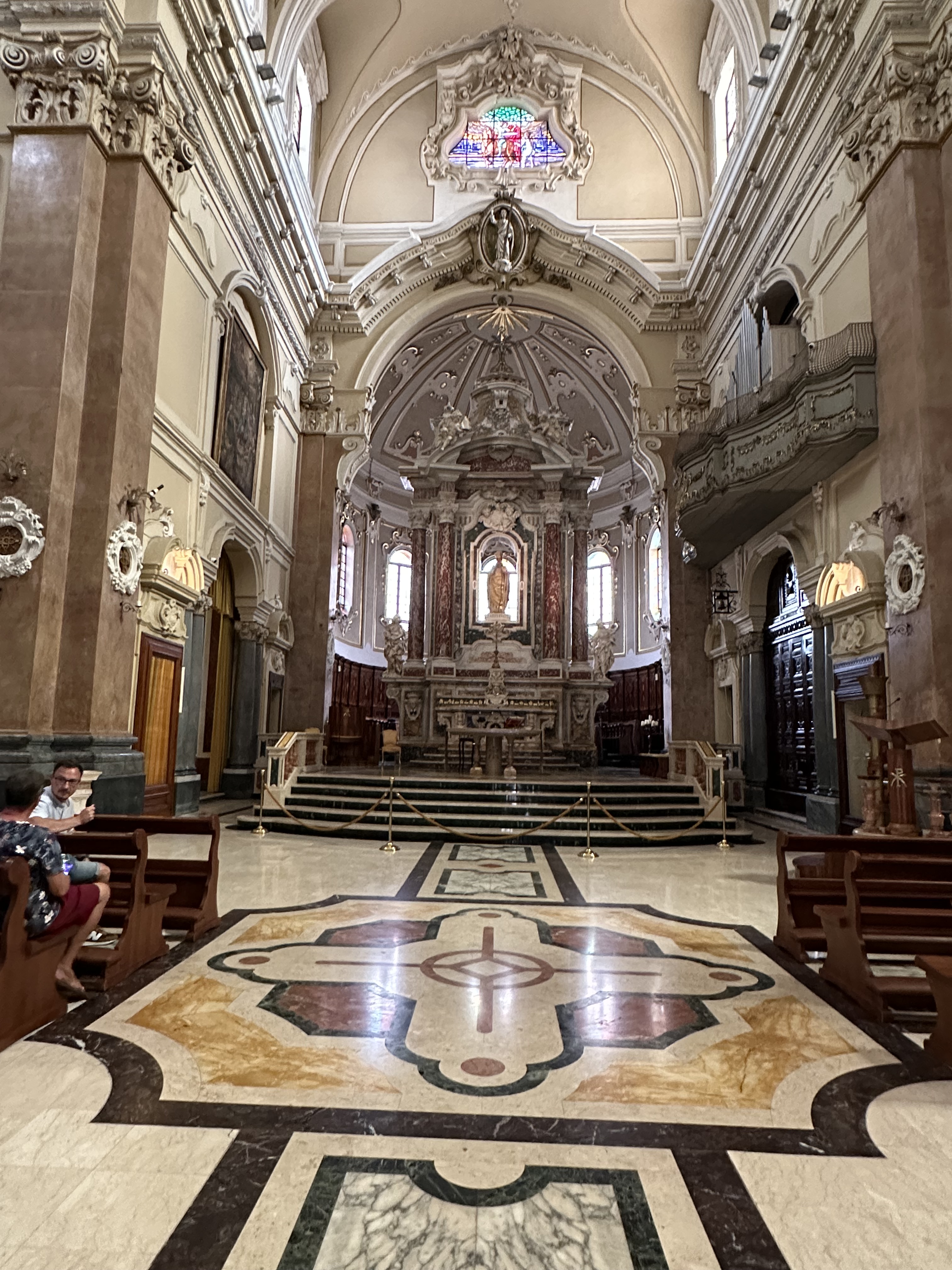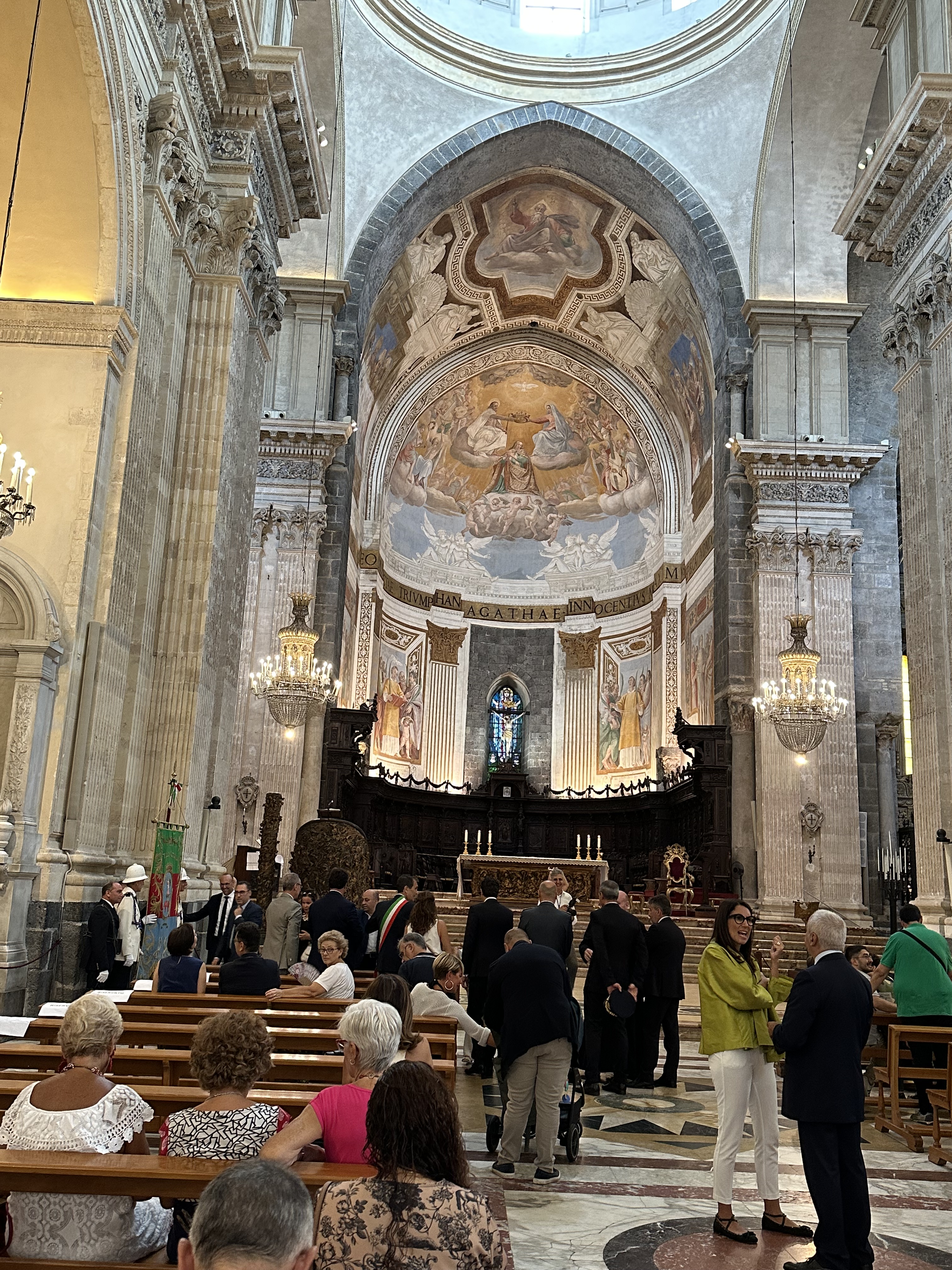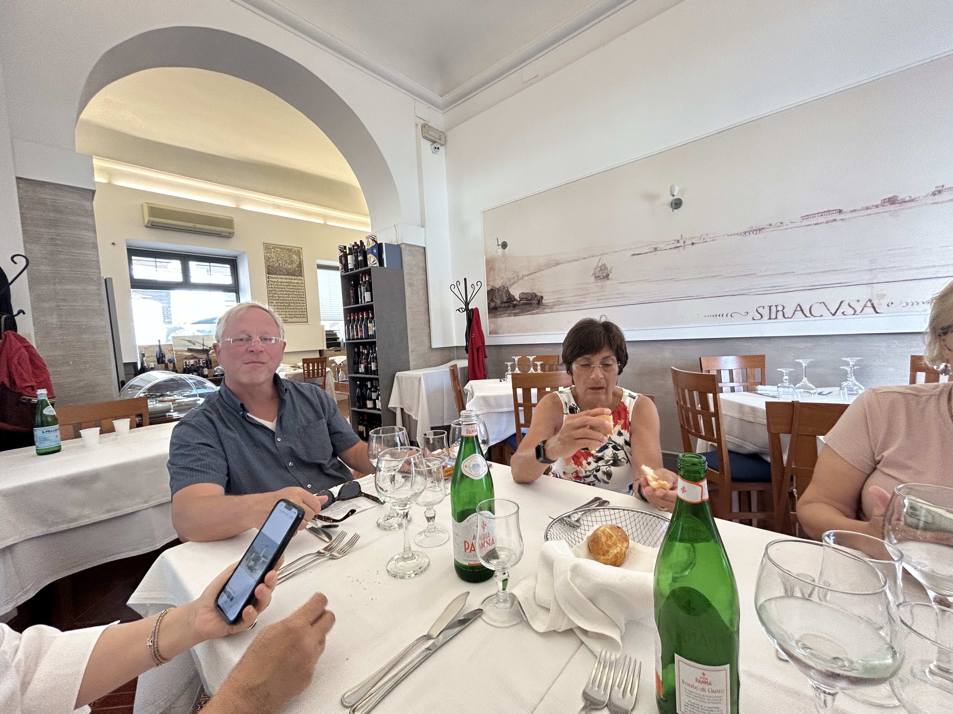 We changed, ate a fast lunch and drove in several cars to Syracuse for a walking tour led by Terry. It included Greek antiquities in the middle of the modern city, the ancient city walls, the large and lovely Piazza Duomo and the Cathedral, which had originally been a Greek temple, later replaced by a muslim mosque and finally by the Roman Catholic Church . We attended Mass in the Cathedral at 7pm and dinner at a nearby reserved restaurant at 8pm. The food was terrific. All went as planned by Terry. Love that boy.