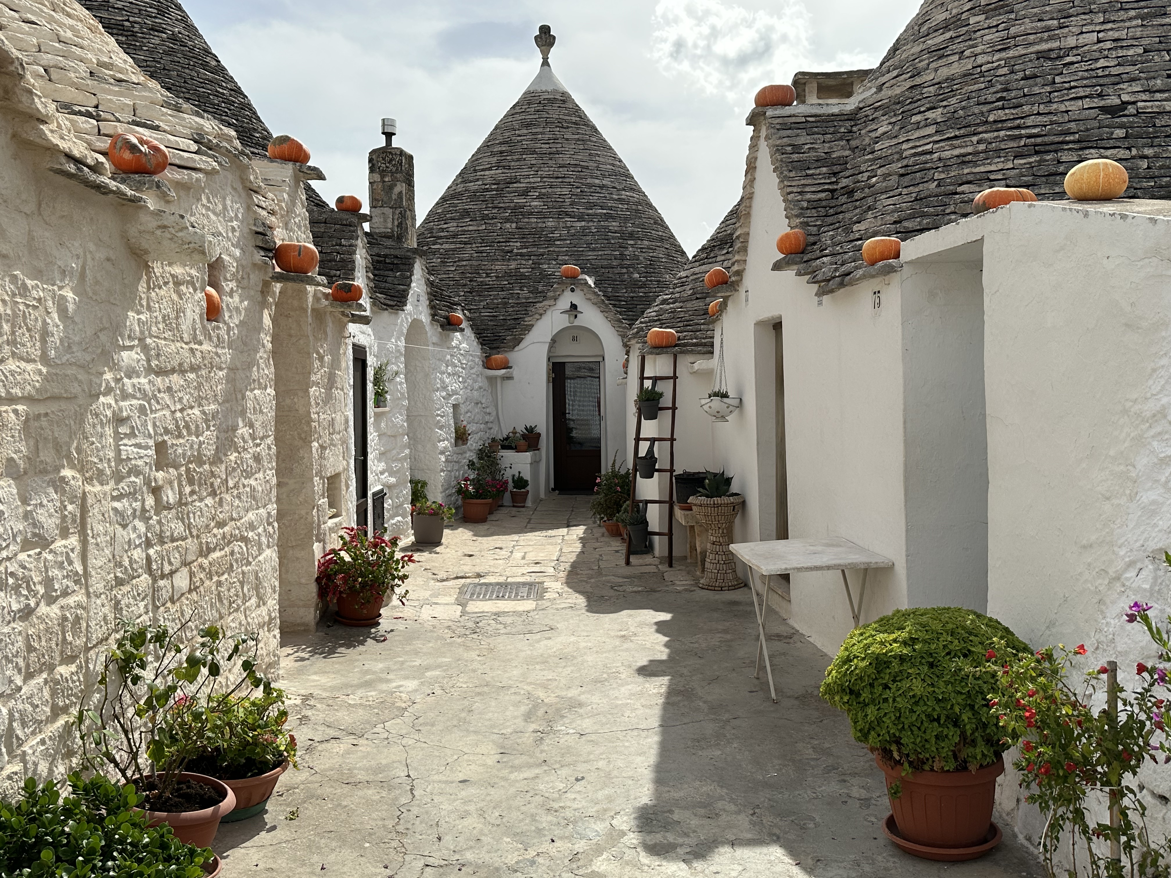 A colorful scene of Martina Franca near the Basilica. From here we headed for the UNESCO Heritage site of Alberabello, which was begun in the 1500’s. The village is the town full of Trulli, round structures with cone shaped roofs that were dry-stacked. Many were whitewashed to protect the walls from crumbling as they built without cement. The people who initiated the structure were the Acquaviva Family. The first house was built in 1428. They paid no taxes because the roof was not permanent. By dry stacking, the owner could remove the roof and no longer have a taxable home, only a stable. As soon as the government taxing authority agreed there was nothing to tax and departed, the owner put the roof back on the building. The concept became popular. The town, having no taxable buildings, had no name either and was known as a ghost town.
