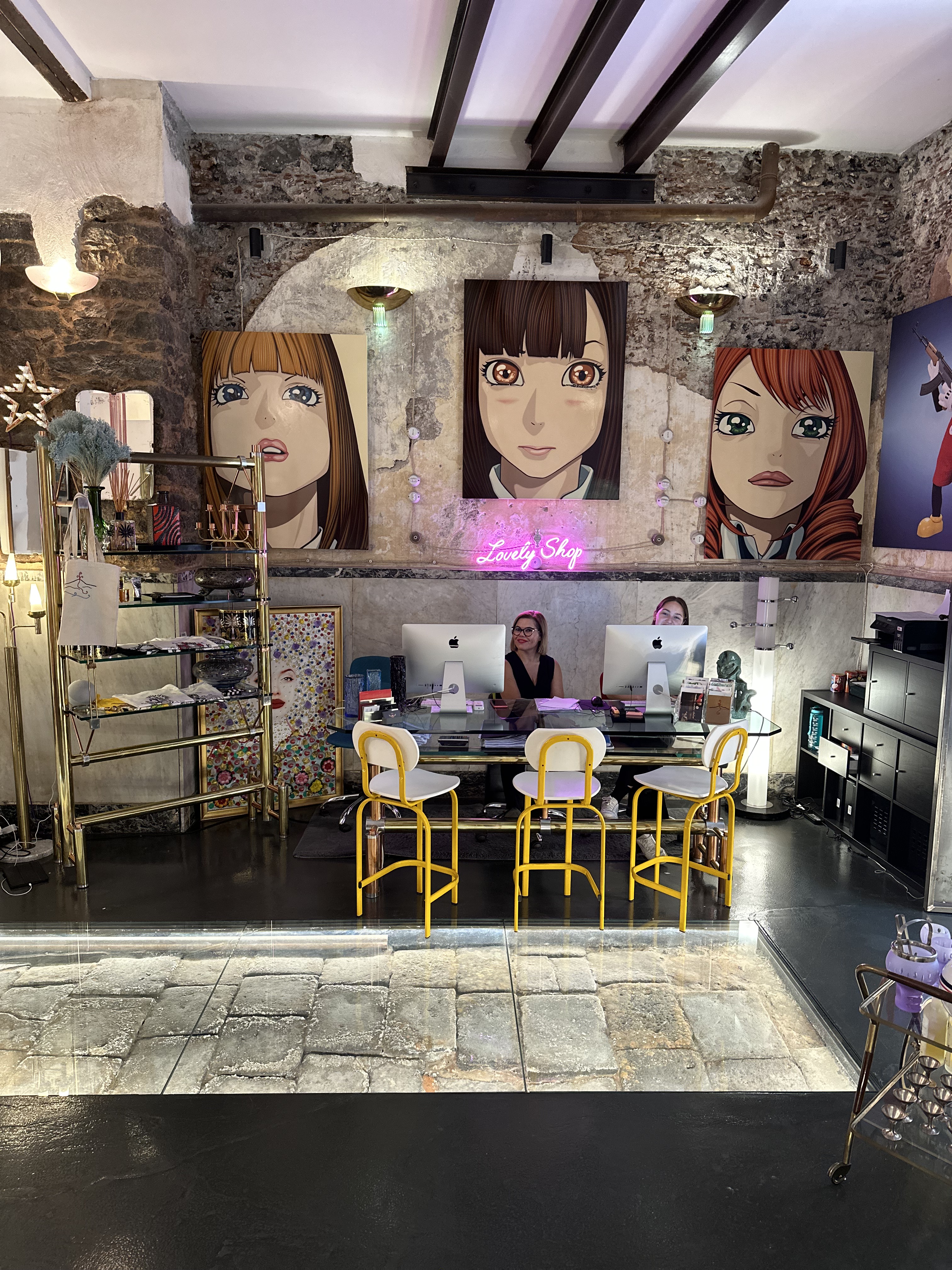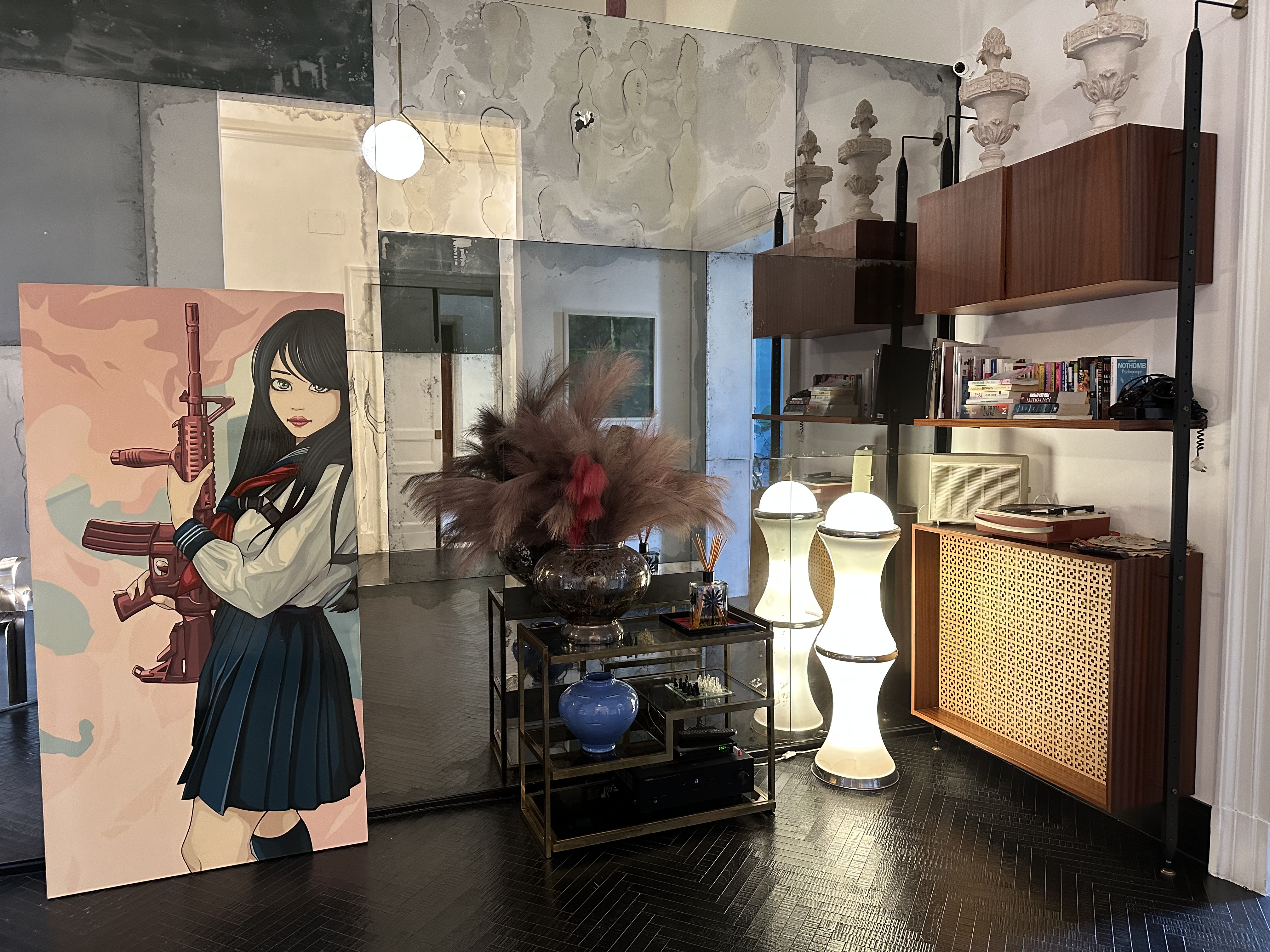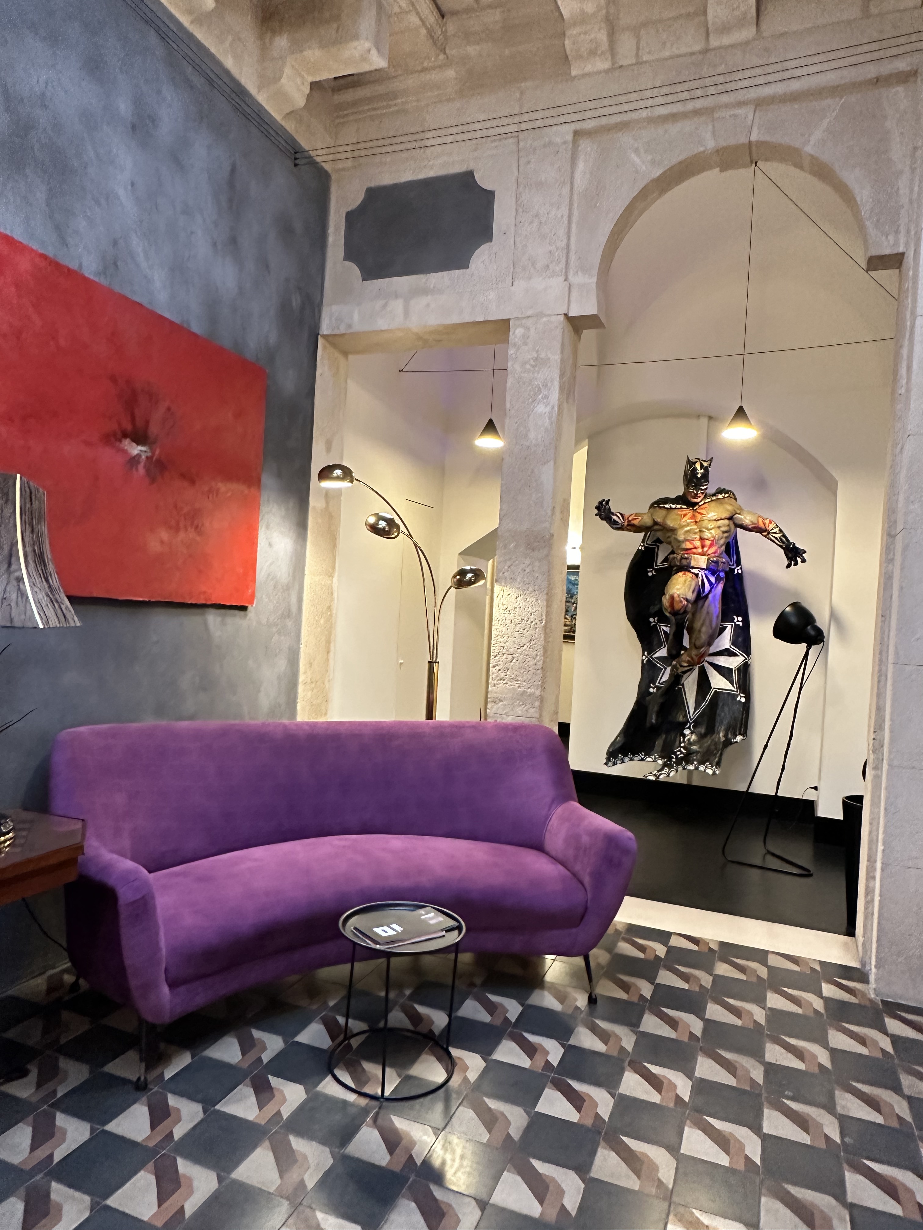 It was the most outlandish accommodation we have experienced as well as the most humorous and appealing. For starters, there was a huge, ceramic black foot in the middle of our room, not to mention the life-size ceramic sculpture of Spiderman outside our door, as if standing guard. There was pop art in all the public rooms and on every shelf and wall space. We wandered around smiling at everything. The hotel was on a pedestrian only street with several restaurants. We selected one and had a delicious meal of fresh fish and pasta. We were joined by the first of our selected group to arrive, Jayna and Craig Ashcraft, Ken and Julie Zuckerman and Jean Creasey. They had all arrived early for our group gathering and we were happy to have them join us for dinner. We were all giddy to finally be together in Sicily after a year and a half of planning. We lingered over dinner a long time umtil we were all getting sleepy. We crawled into bed giggling about the foot at tne end of our bed.