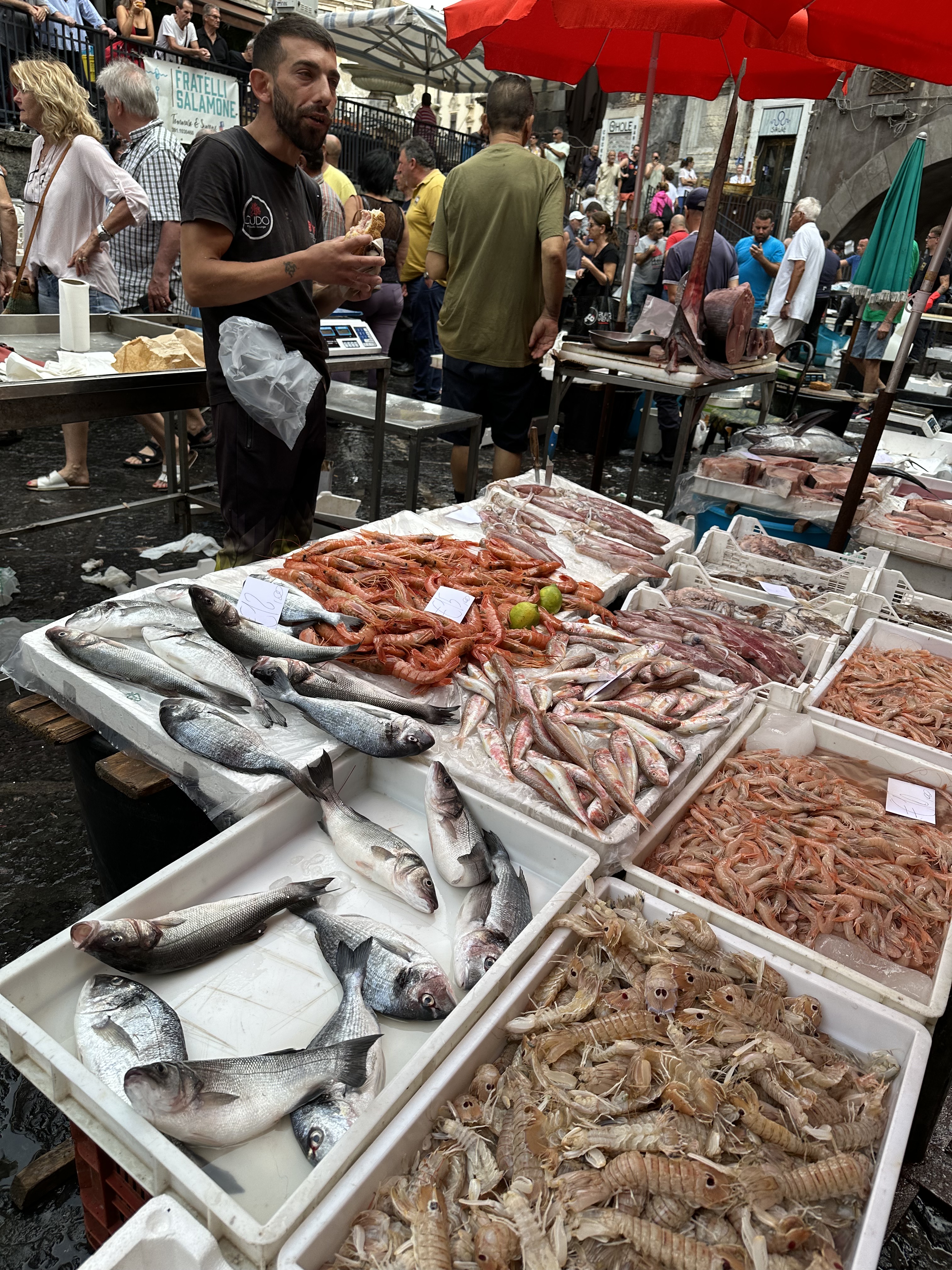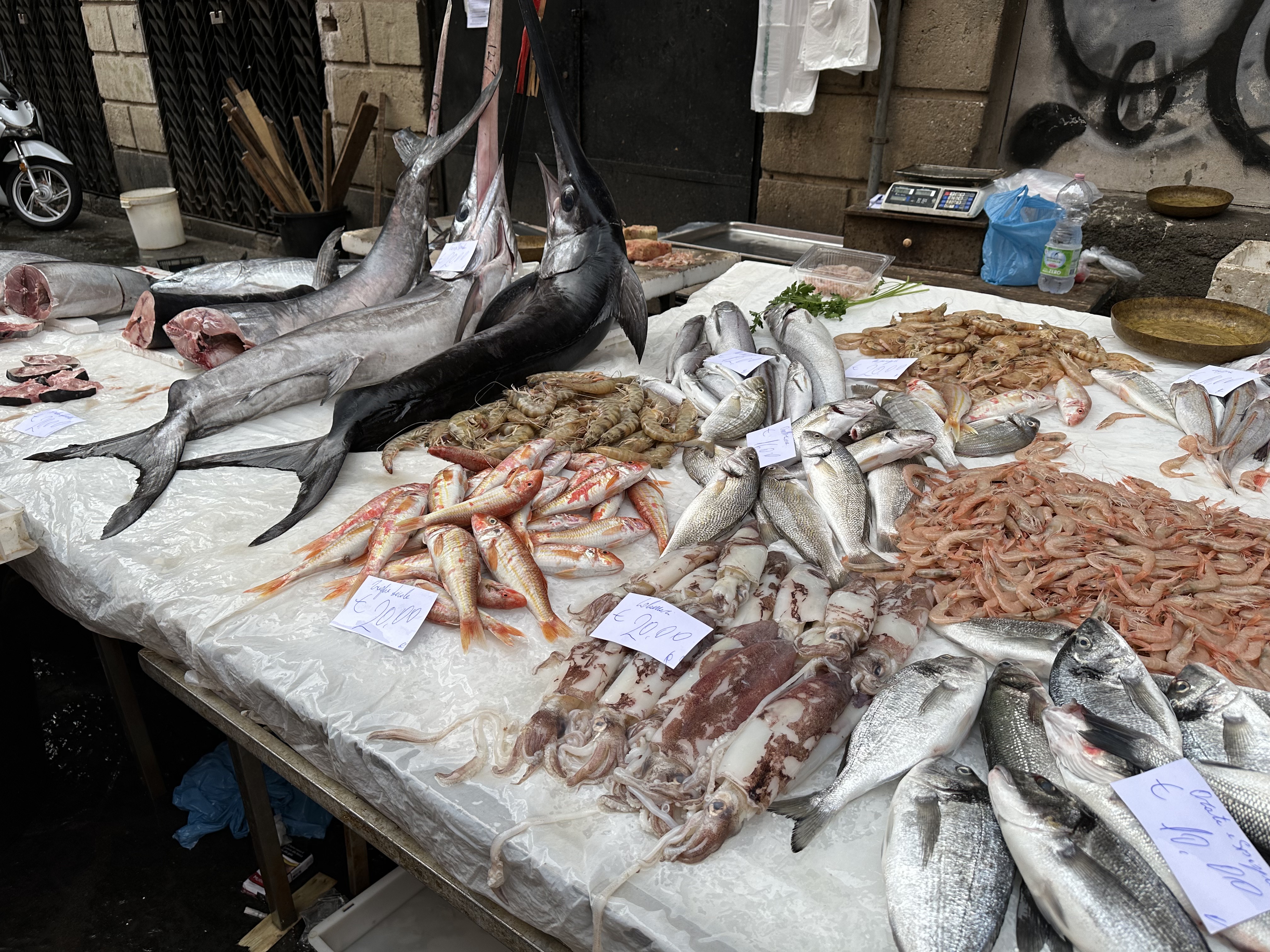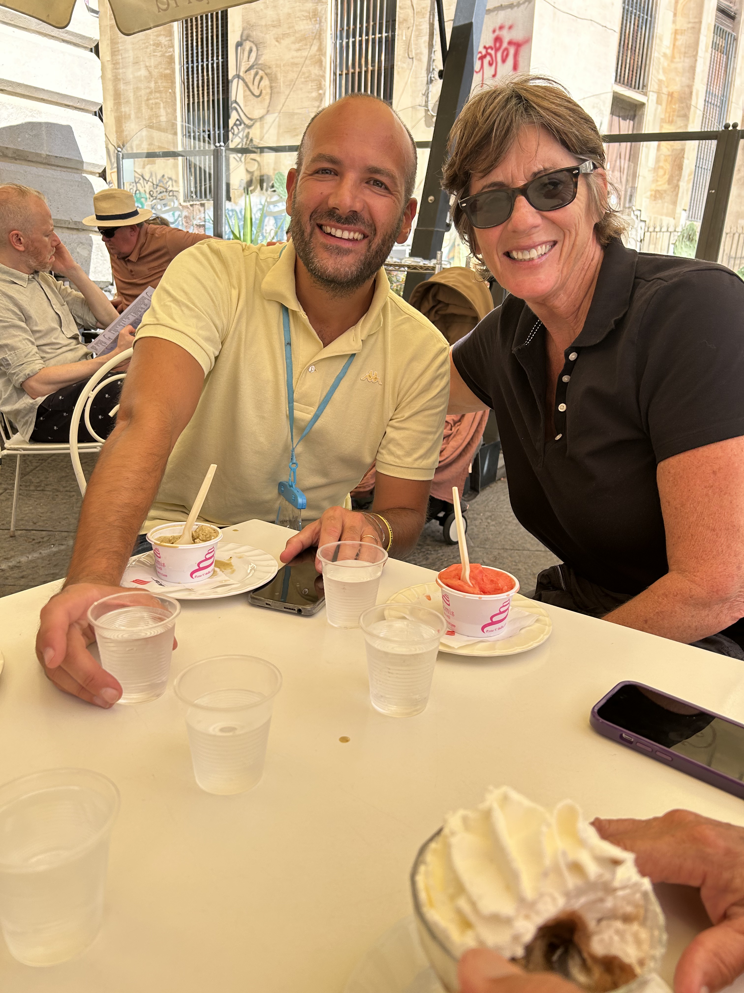 The fish and vegetable market under the umbrellasHilda eating chocolate gelatoJudith eating pizzaMe waiting to be servedPeppe telling us what we are about to eatFish in the marketOctopus on displayPeppe and Liz enjoying gelato. Julia tasting her Cafe Granita with whipped cream isn lower right.