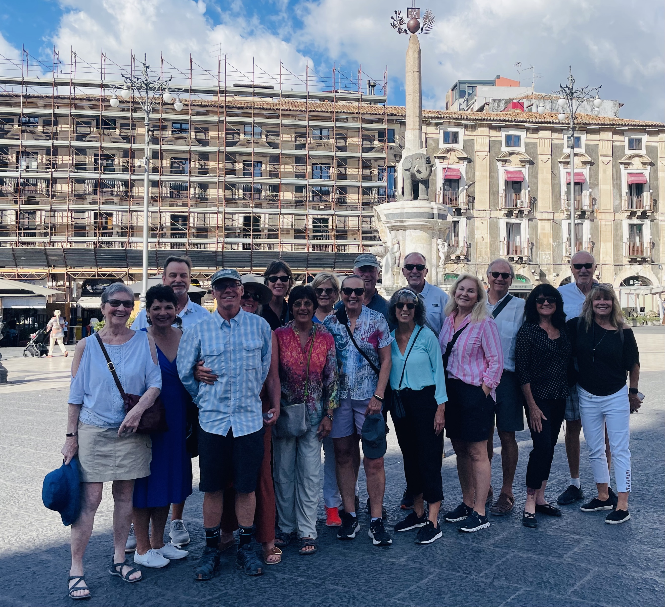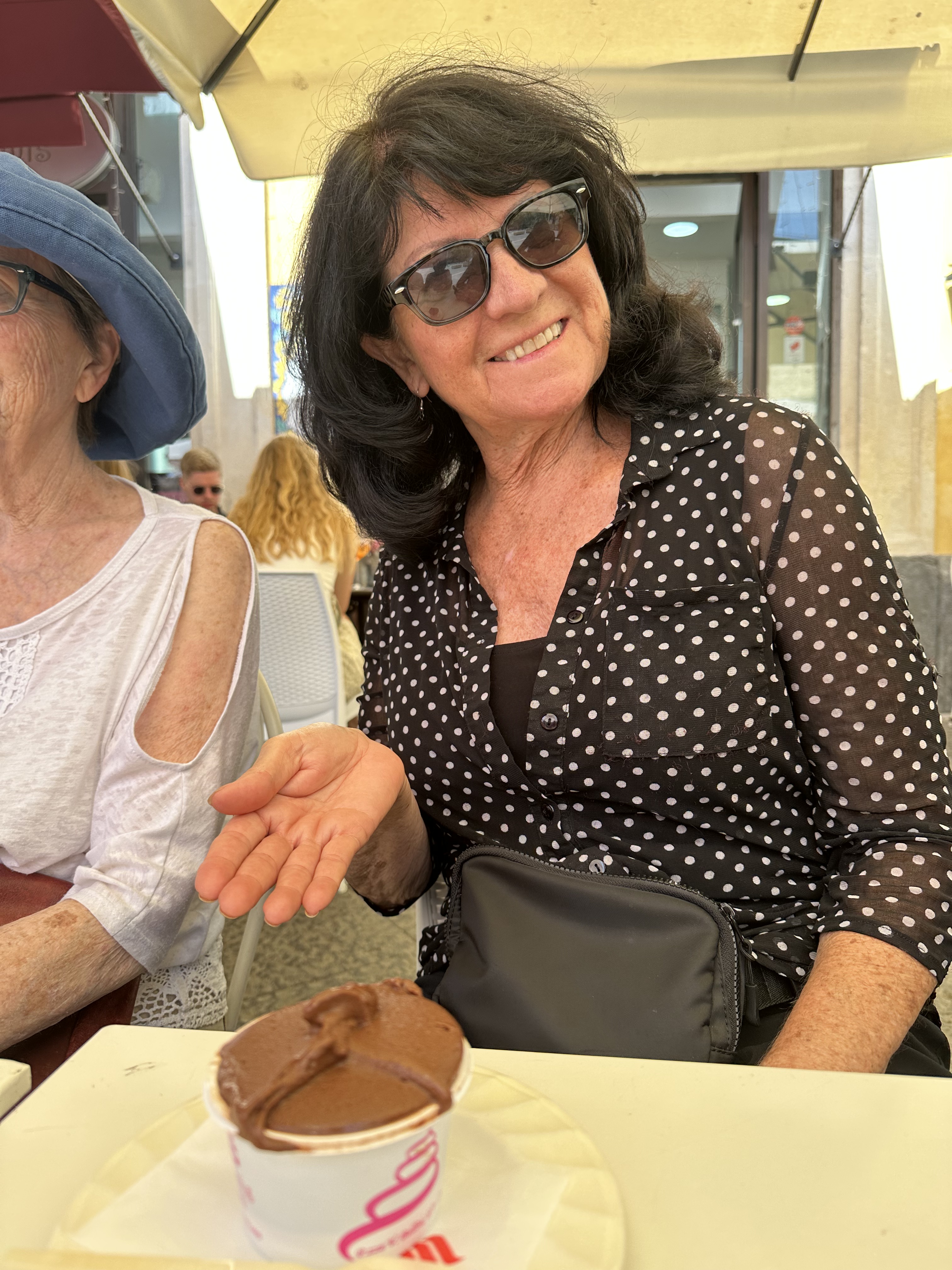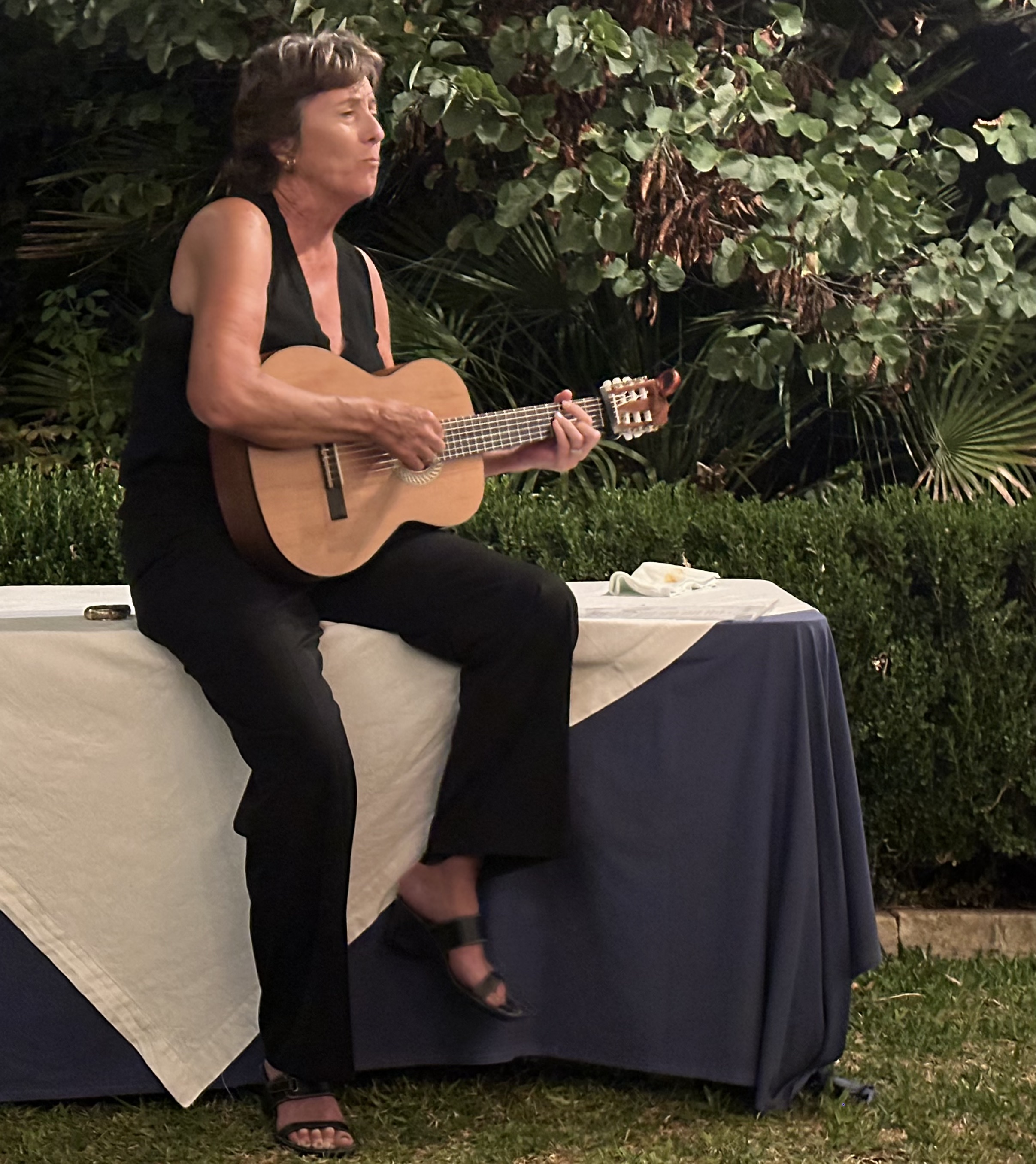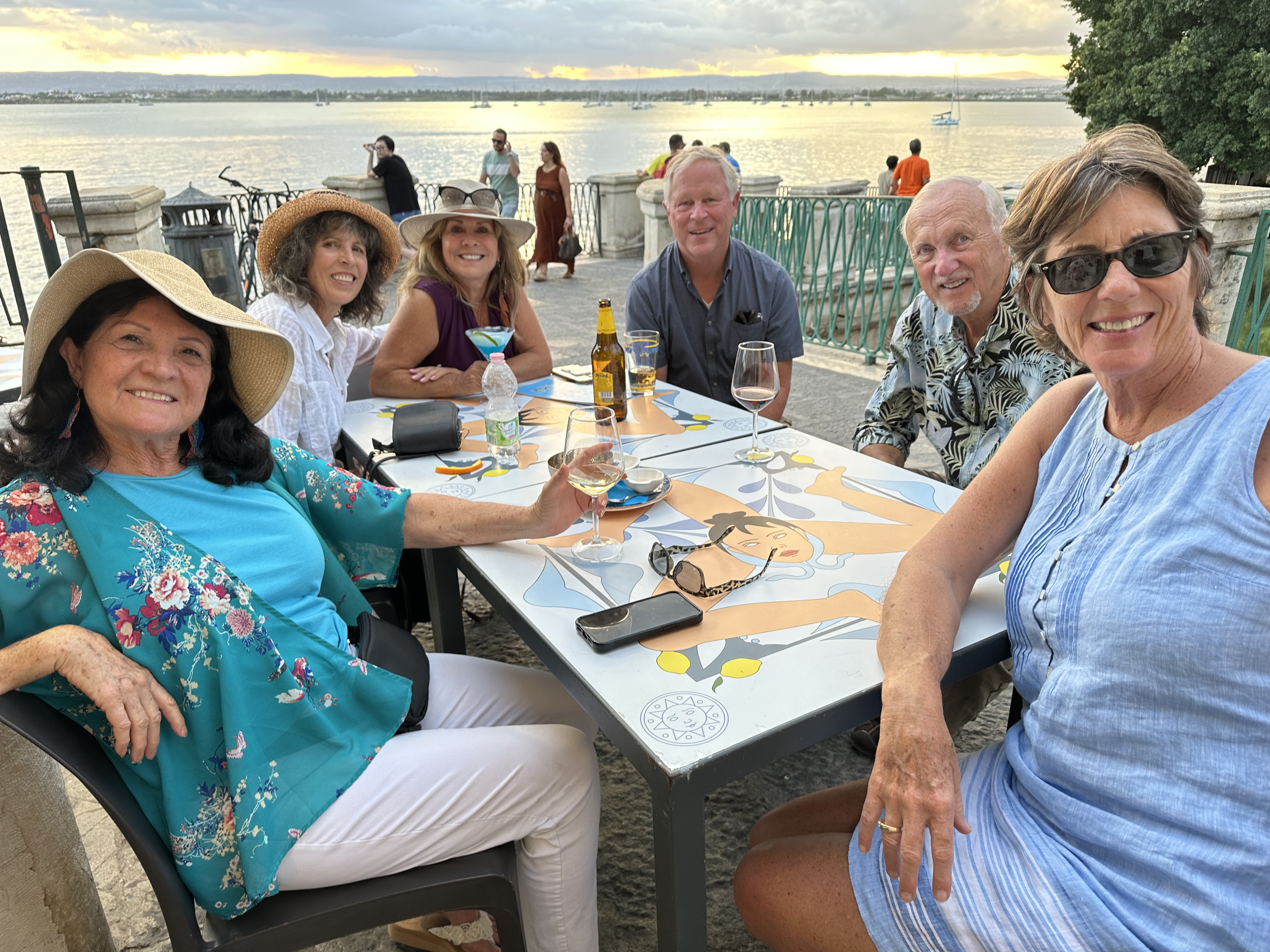 Terry had a Q&A game to see what people knew about us. It was no surprise that Roxanna knew the most. Liz played her guitar and sang a song she wrote for the occasion. It was clear that the table was overflowing with love and joy. Even the table setting was a labor of love provided by our chef Francesca. She ended the dinner festivities with a beautiful homemade Sicilian birthday cake. The cake was delicious, but the party was not over yet. John had made a video of our week’s activities and we all retired to the living room to watch all 17 minutes of the delightful video. I sure hope I did not miss anyone. We were so engaged in enjoying the evening that we did not take any notes and very few photos, I am sorry to say.