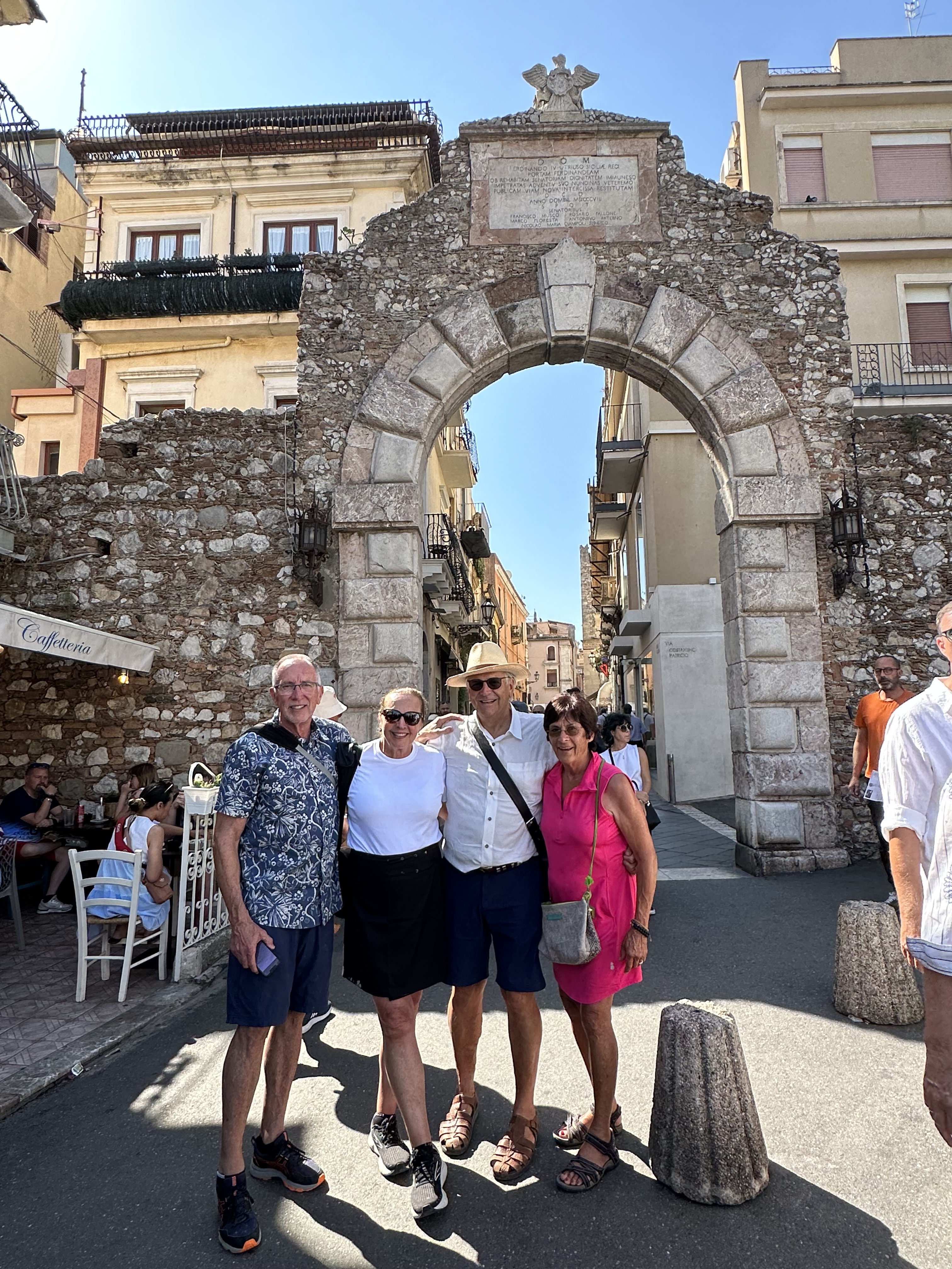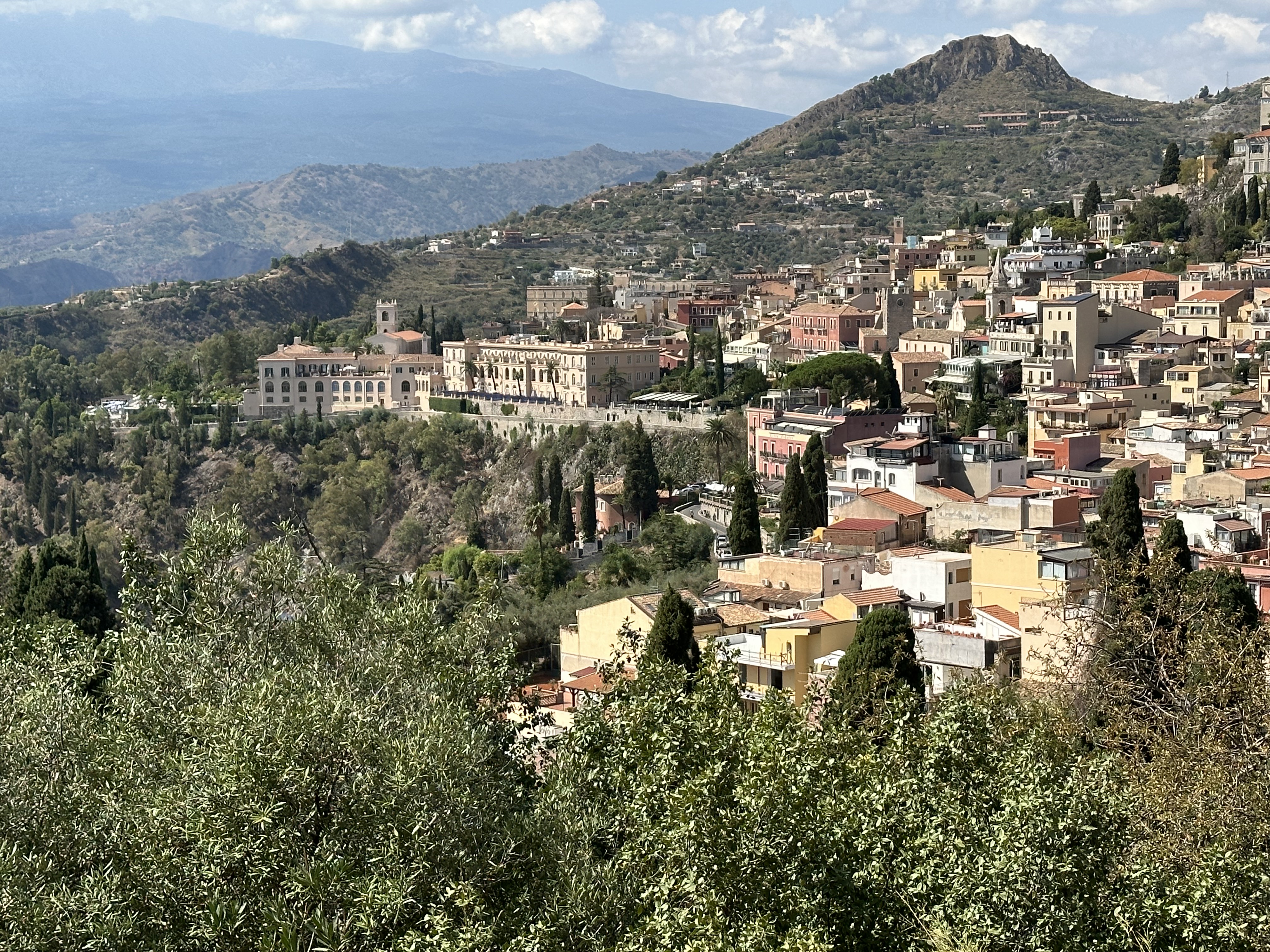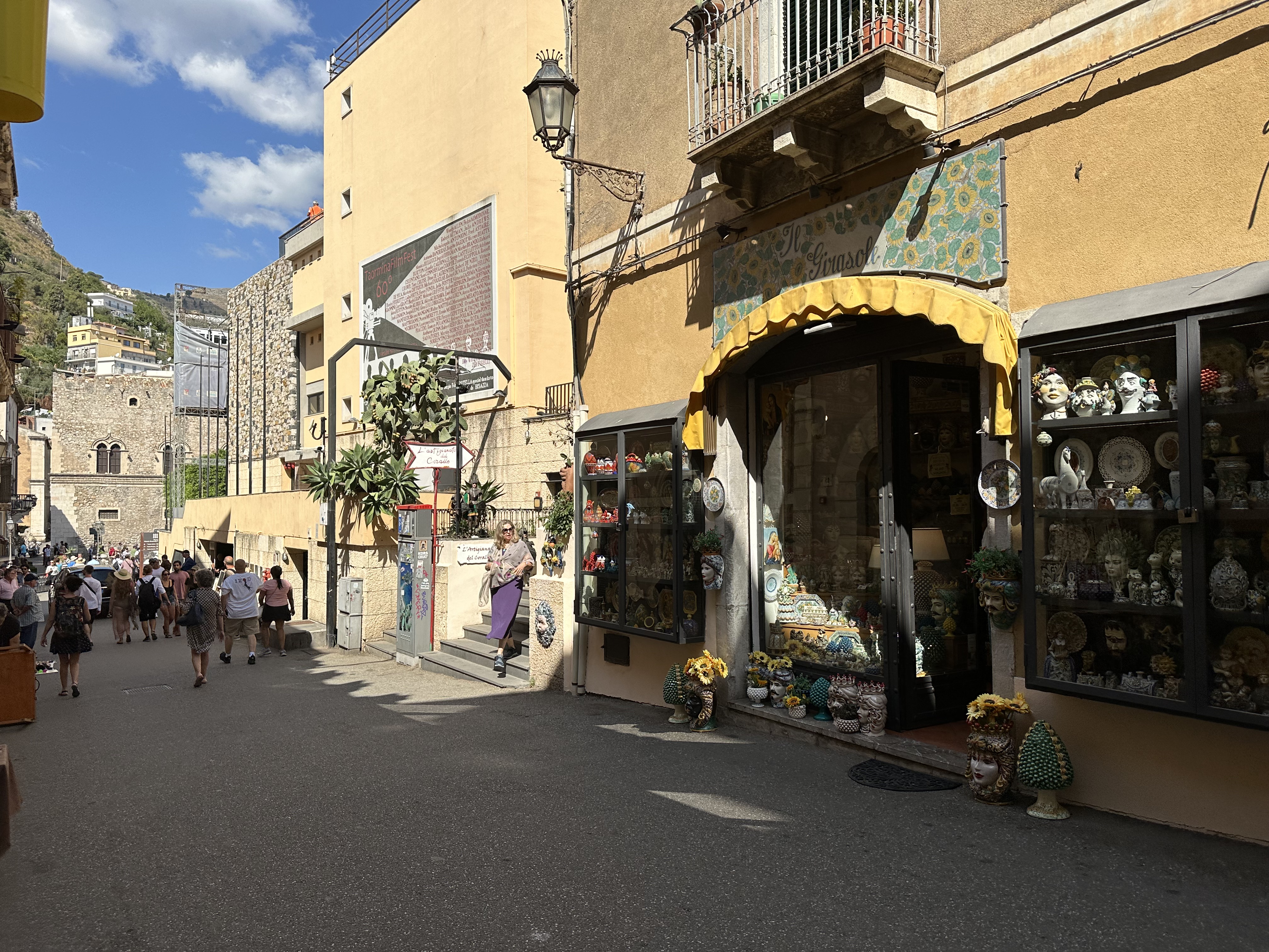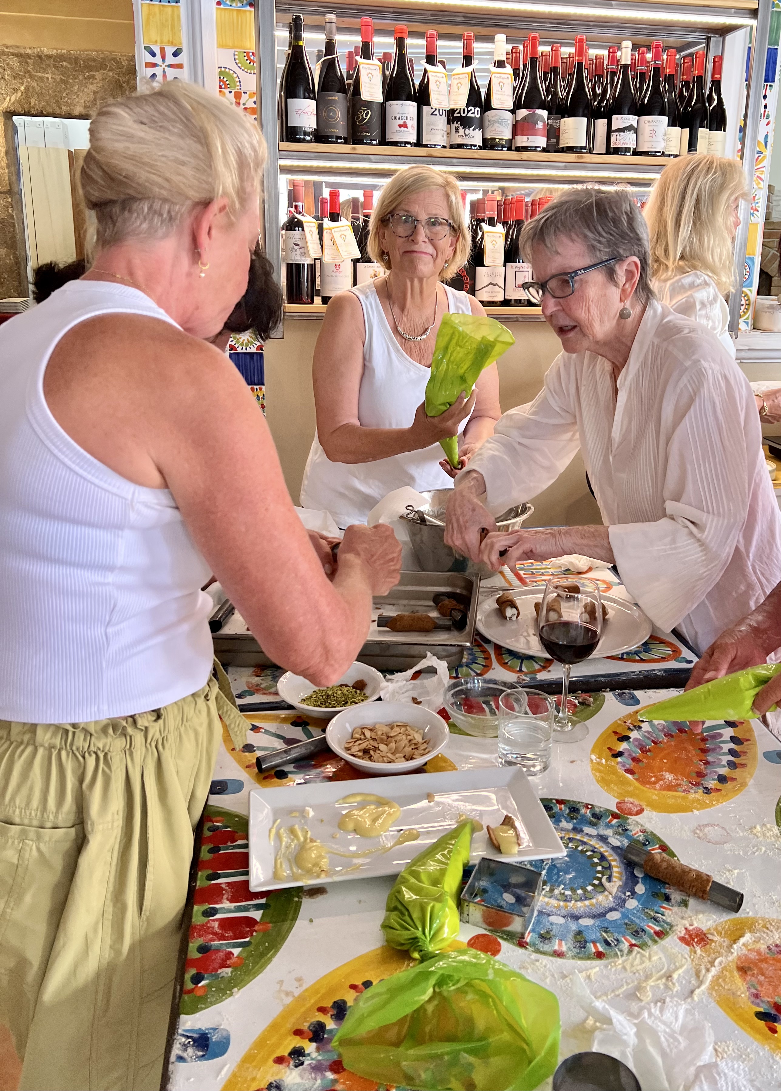 Today was Cannoli making day in Taormina, another activity Terry McAteer had arranged. High on a hillside overlooking the Mediterranean Sea, Taormina was a lovely place to see and visit and even more special having an activity to share. The drive was 1.5 hours north of the villa and everyone went on the adventure, although a few did not engage in cannoli making.