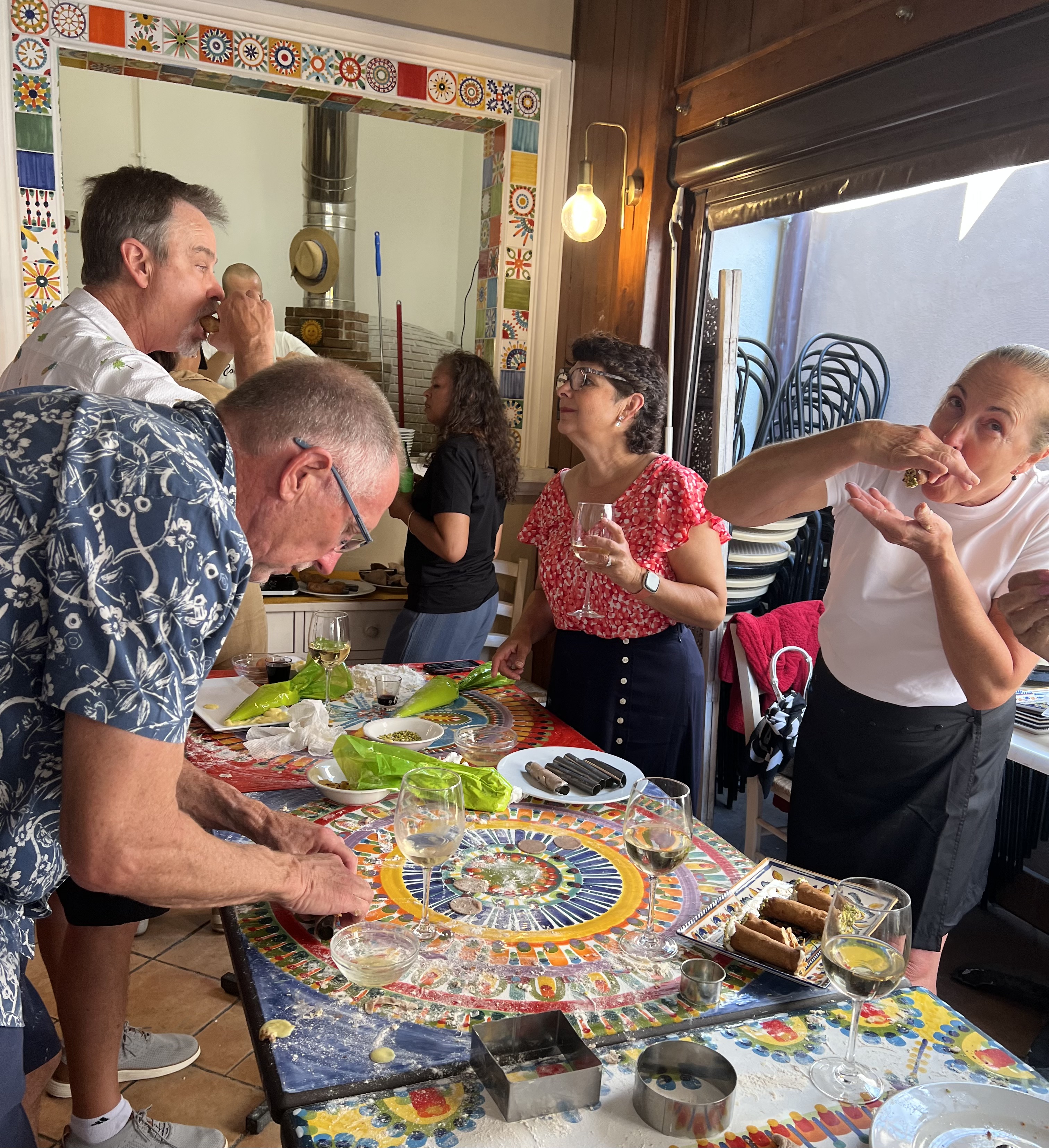 We set off at 8:30 to be in time for our 10:30 date at Porto Messina Restaurant. The restaurant was ready for our large group of 21 and we were each assigned a station in front of a small pile of flour, a half cup of wine, a quarter cup of sugar, an egg, a quarter cup of butter, a dash of cocoa powder and a pinch of cinnamon. We mixed it all together and kneaded it until it was firm. Then we rolled the blob into a thin flat shape we then cut into rings with round or square cutters. Then we rolled the rings around split metal tubes and sealed the dough rings with egg white. Some of us never quite got the hang of the process, but we all had fun making a mess any why. The rings that were decent looking, went into boiling oil and came out fried. Immediately after the dough was cooked, we removed the split rings from under the cooked dough by twisting them. If all went well, the cannoli came out whole and was ready to be stuffed. Once we had made the filling of ricotta or lemon curd, we stuffed as many as we could and then ate them, almost as fast as we stuffed them. Much fun was had by all.
