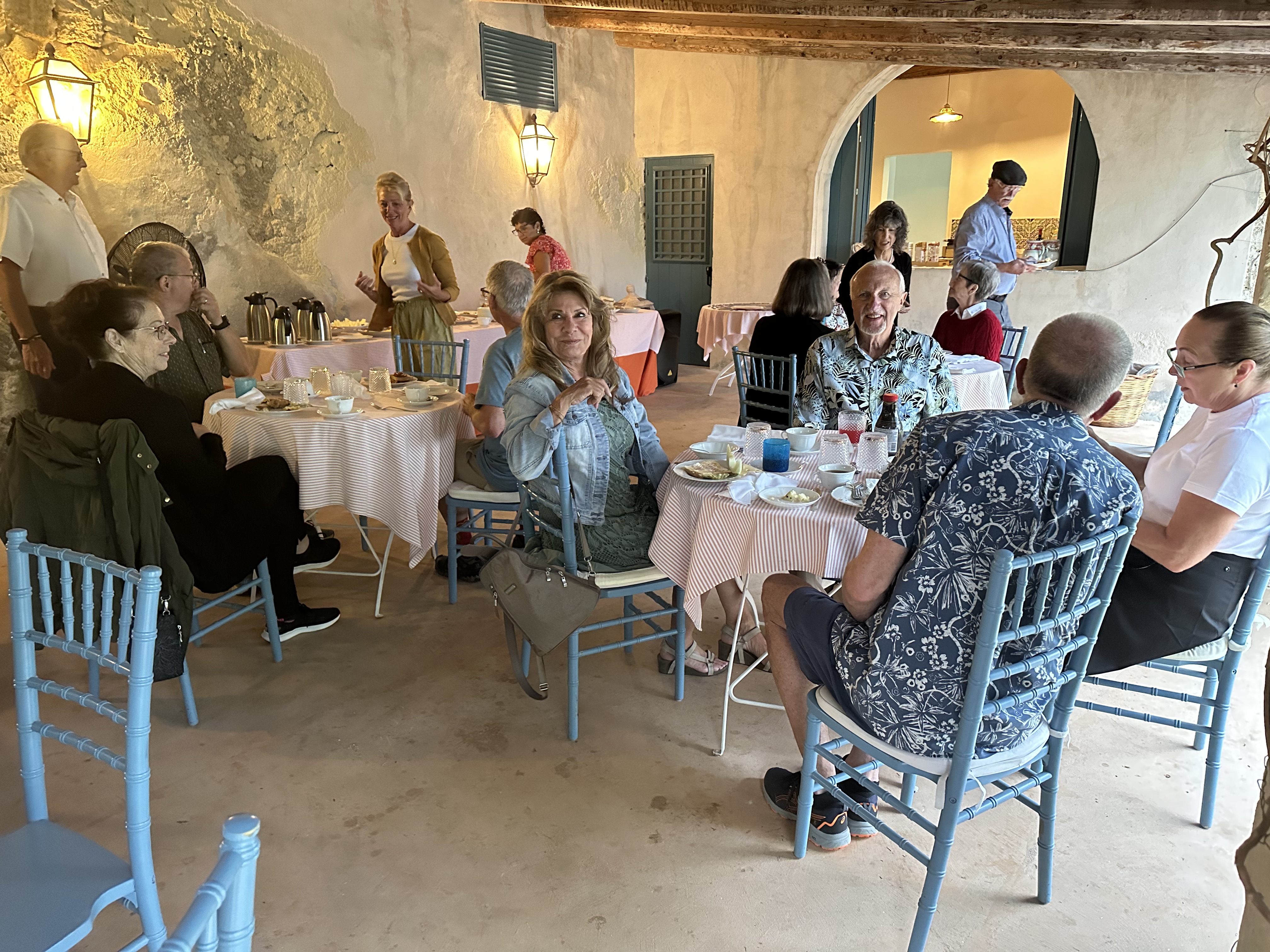 By 7:30 we gathered in the courtyard for dinner. The villa staff provided us with a delicious buffet with typical Sicilian dishes. The sky sprinkled on us and most of us moved under cover. Al Dover gave a lovely welcome thank you to Mark and me for hosting the week. It was very touching. Then I talked about housekeeping matters and Terry McAteer talked about the planned activities for the week. I was thrilled that everyone had arrived safely and were already enjoying themselves. Success. We had been so busy chatting that we forgot to take photos. Sorry.