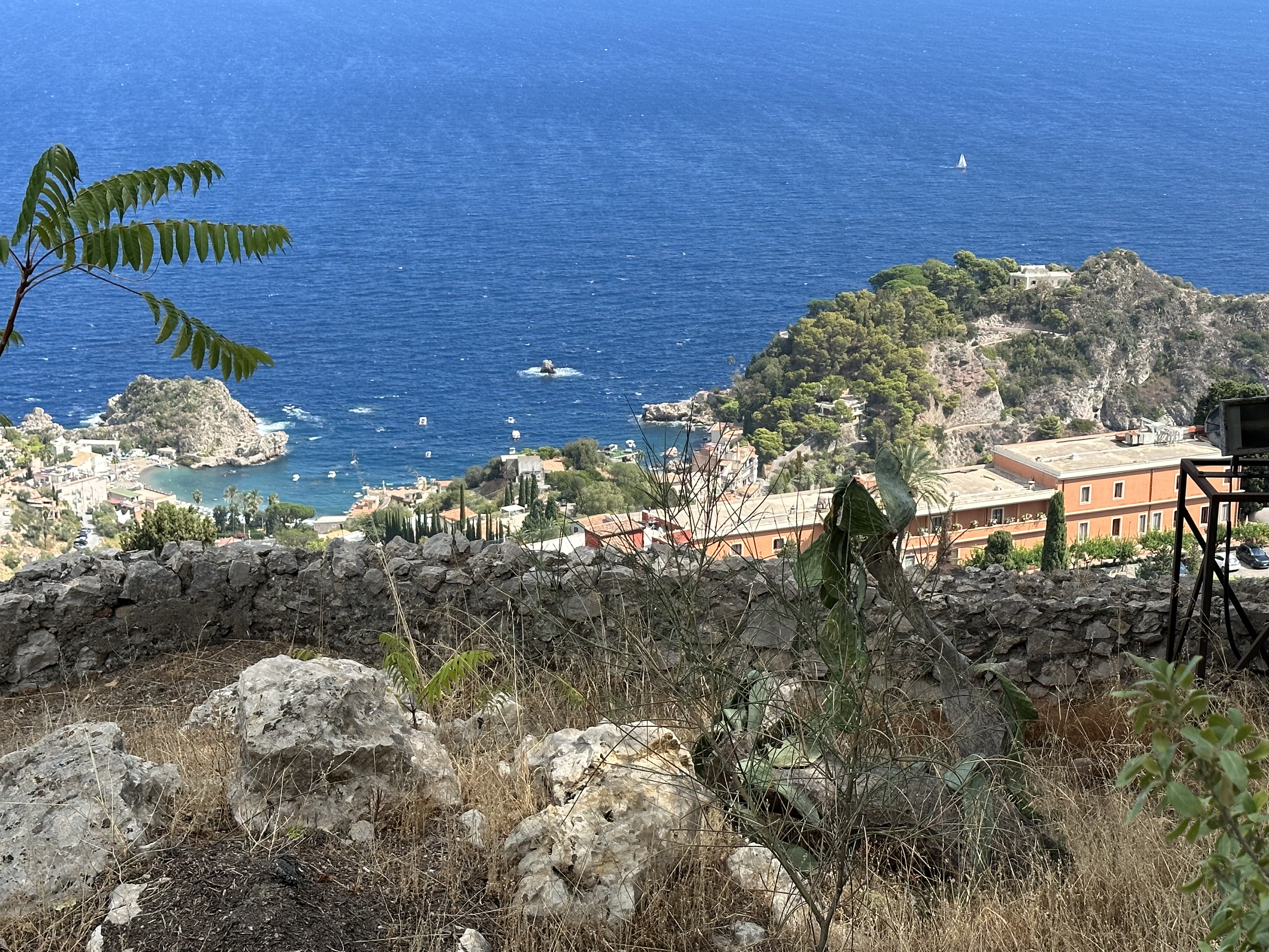 The city of Taoramina The Greek Amphitheater in TaoraminaLooking down at the Ionian Sea A carob tree that puts out carats, which were used to measure the weight of diamonds. A carob seed Inside a local churchThe front of a local church The sculpture in front of the alter. Next to Jesus is a barefooted female figure.