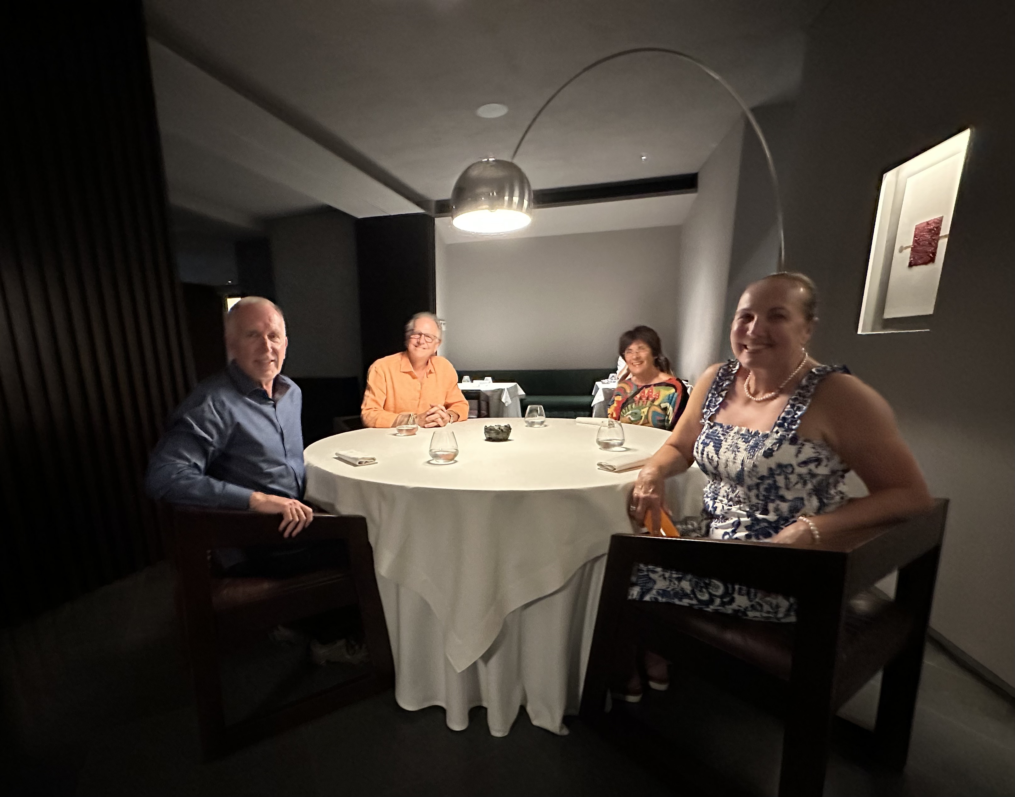 We drove back to the villa and relaxed a while. Then the 4 of us changed and went back to Catania for a Michelin Star dinner a place called Sapio. The table was big enough for 8 and we had a hard time talking to each other across the expanse. We laughed about the ridiculously oversized table and agreed to order a very nice 7-course meal that did not leave me overstuffed. Mark, however, said he was more than full.