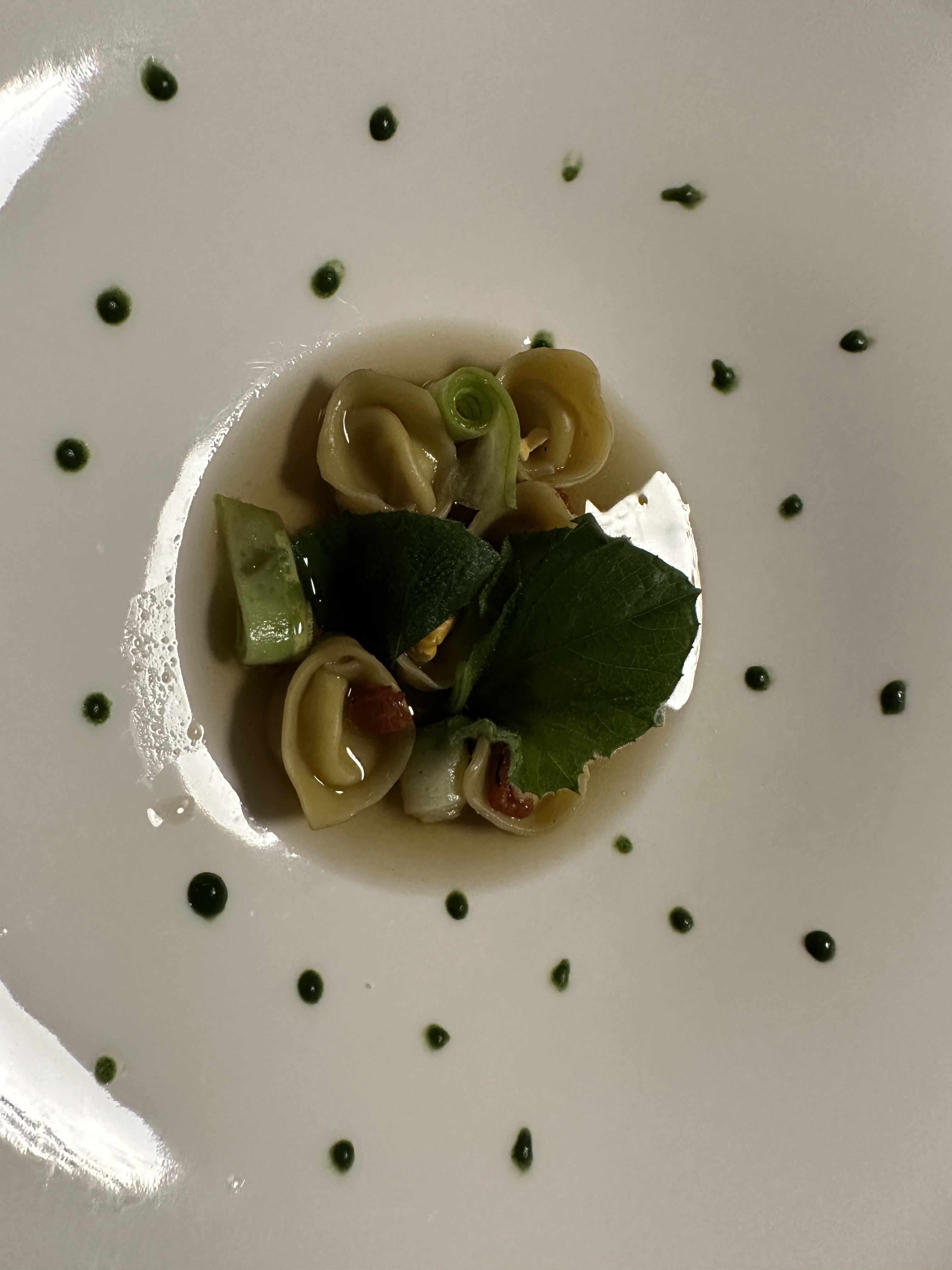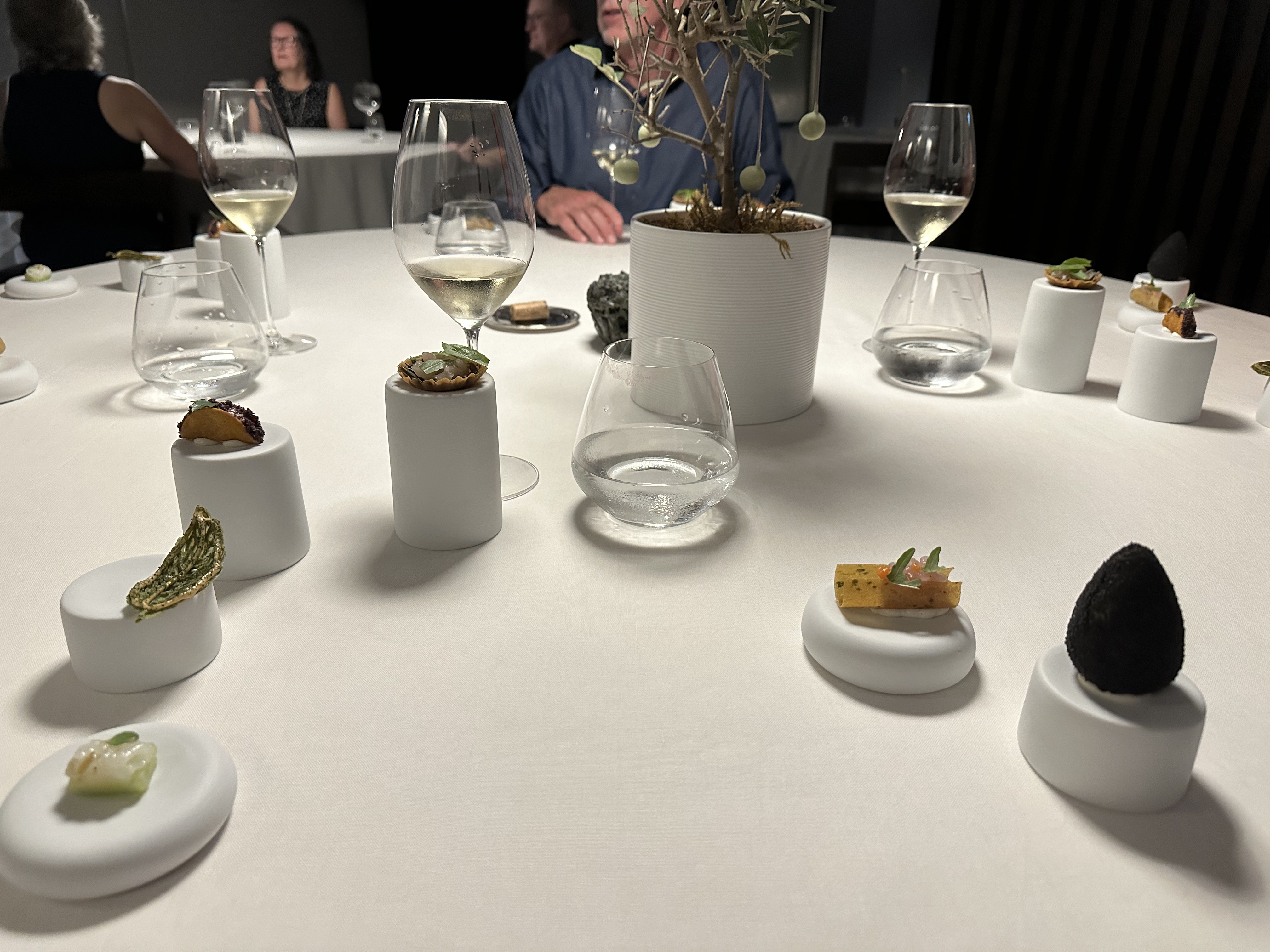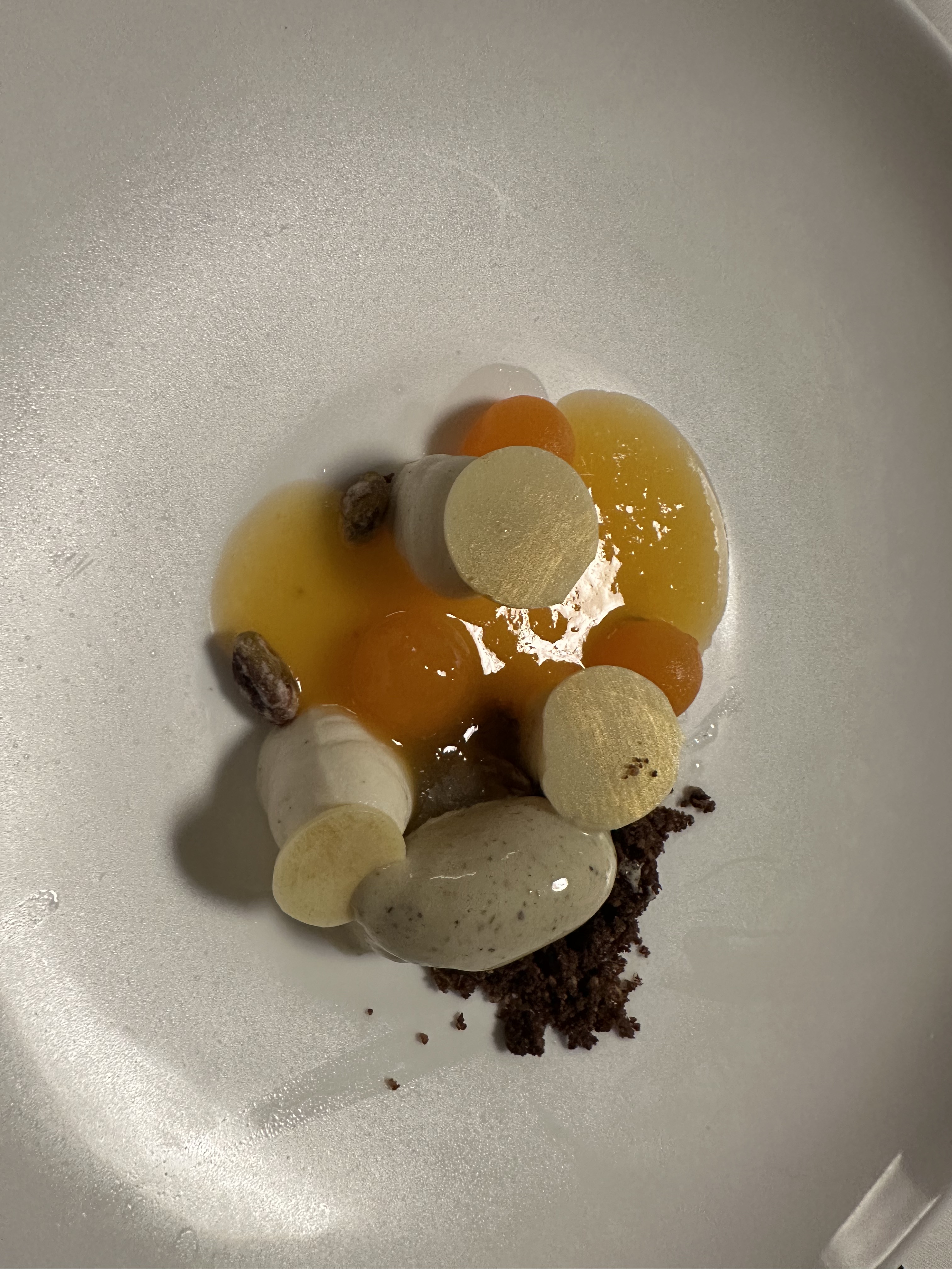 The Michelin restaurant We were seated at a huge table and could hardy hear each other. Funny and odd.First course was a bunch of tiny tests. Most were very good. One of our 7 courses.The dessert course.