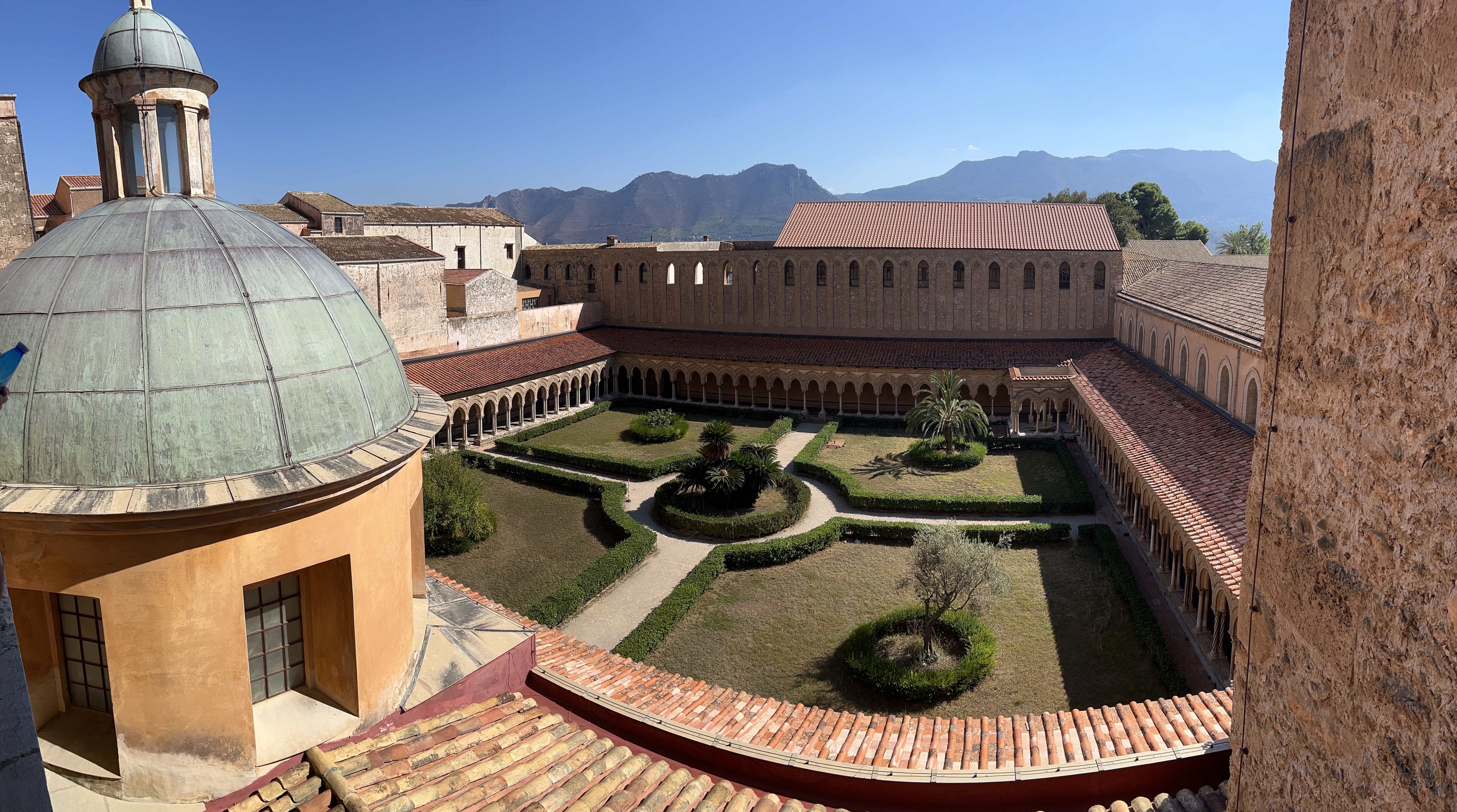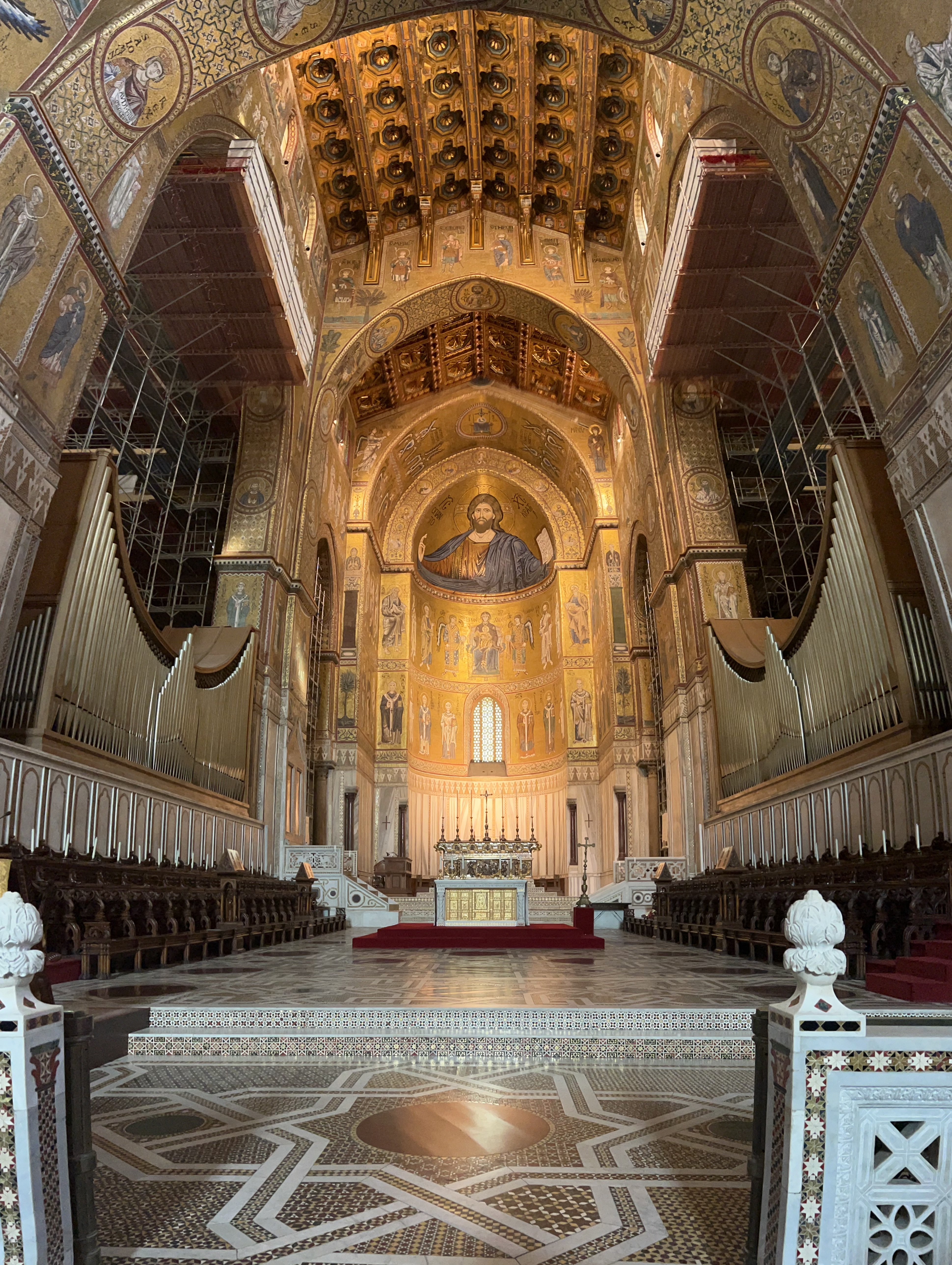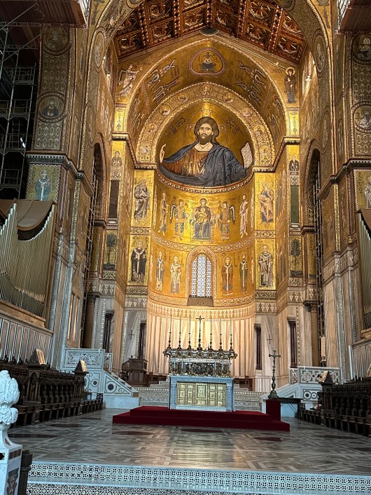 The Temple tour took about 2 hours. Fortunately we did it early enough in the morning to avoid the crowds and the heat. We packed and headed cross country for Palermo via Monreale, the famous cathedral we had heard about. The scenery was full of small towns and villages and various agriculture fields and orchards of orange, olive and almond trees. We arrived in Monreale about 12:30, took a long time finding a place to park and then went to lunch, as the cathedral was closed until 2pm. The cathedral was huge and spectacular. It was built by Norman King William ll in the 12th century. The walls were mosaics of glass and gold leaf. Very stunning to see. The interior of the cathedral contains three naves, each of which has its own group of mosaics, which cover about 10,000 square meters in total.