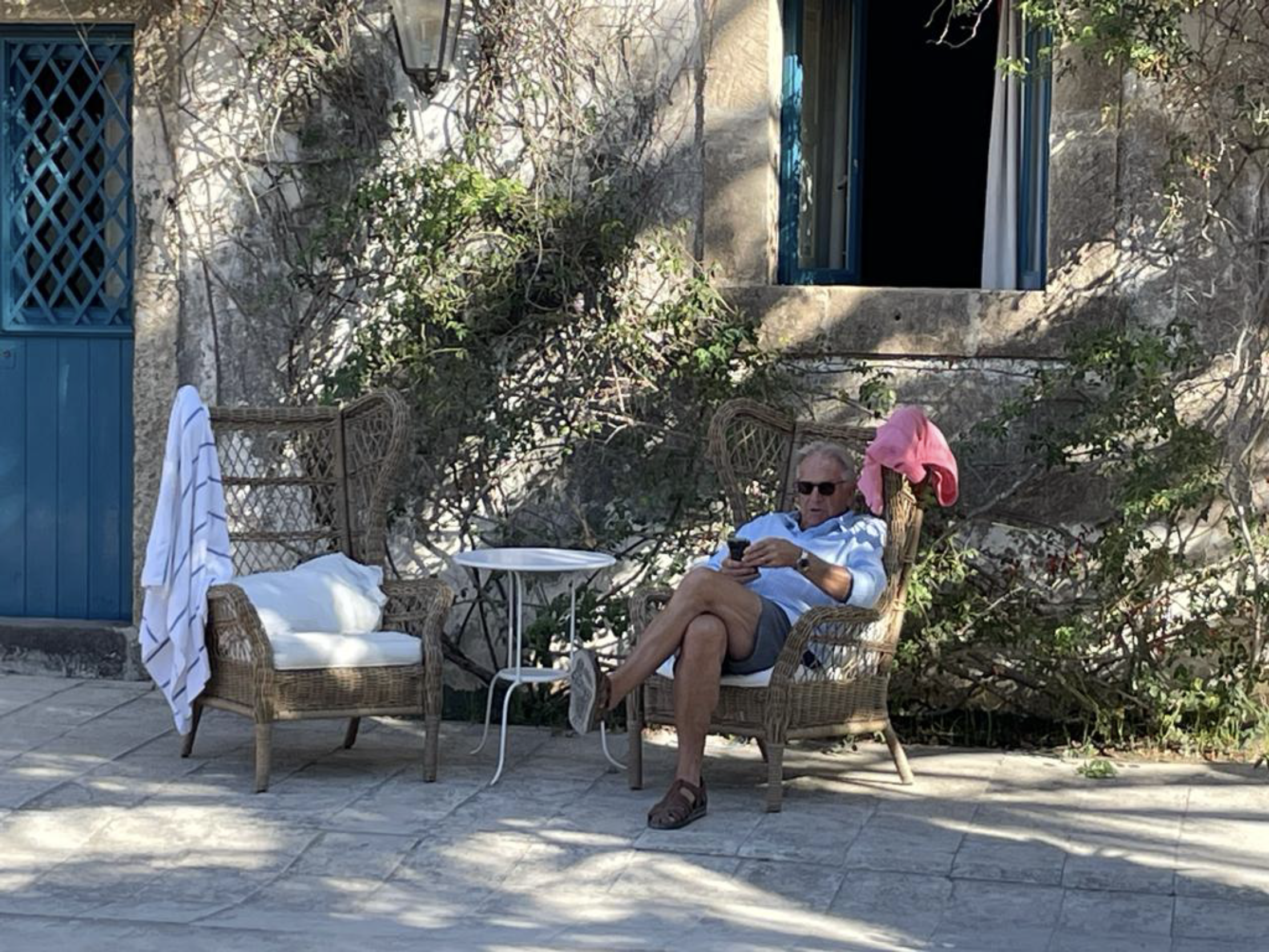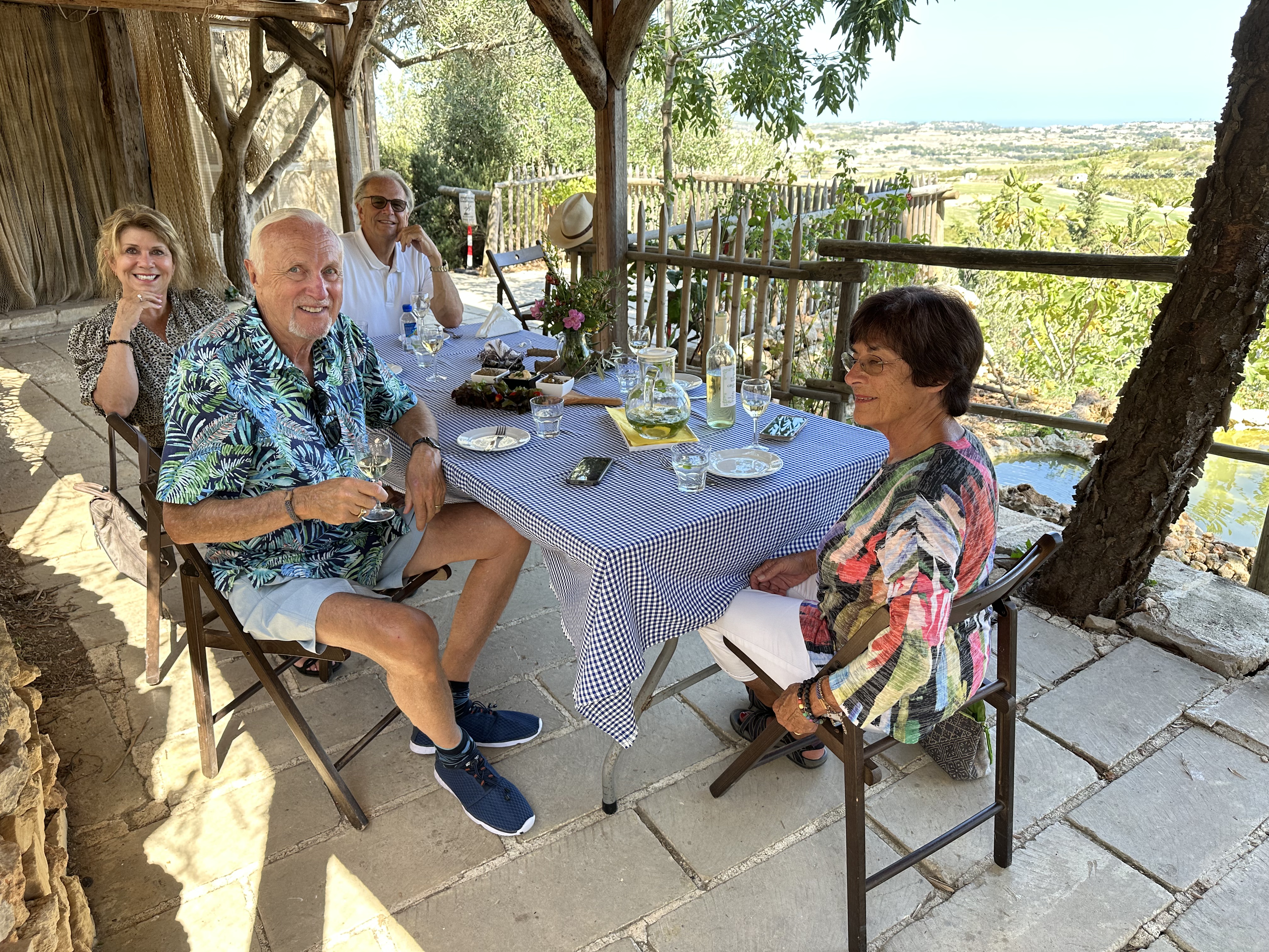 Our fisrt day with no planned activities and everyone had an idea how to spend their day. For me it was about the jigsaw puzzle I had brought from home. It is a map of Italy indicating all the wine growing regions. I set it up in the poolside dining area and put in the edges. Soon others came around and started adding pieces. My hope was to engage people in a collective activity and it seemed to work. The steam room was on and hot. The pool was delightful. A small group went to Agrigento and another to Villa Romana for sightseeing. Some went to nearby Brucoli for dinner. Others stayed at the villa with Mark and me. Here are a few images taken by others.