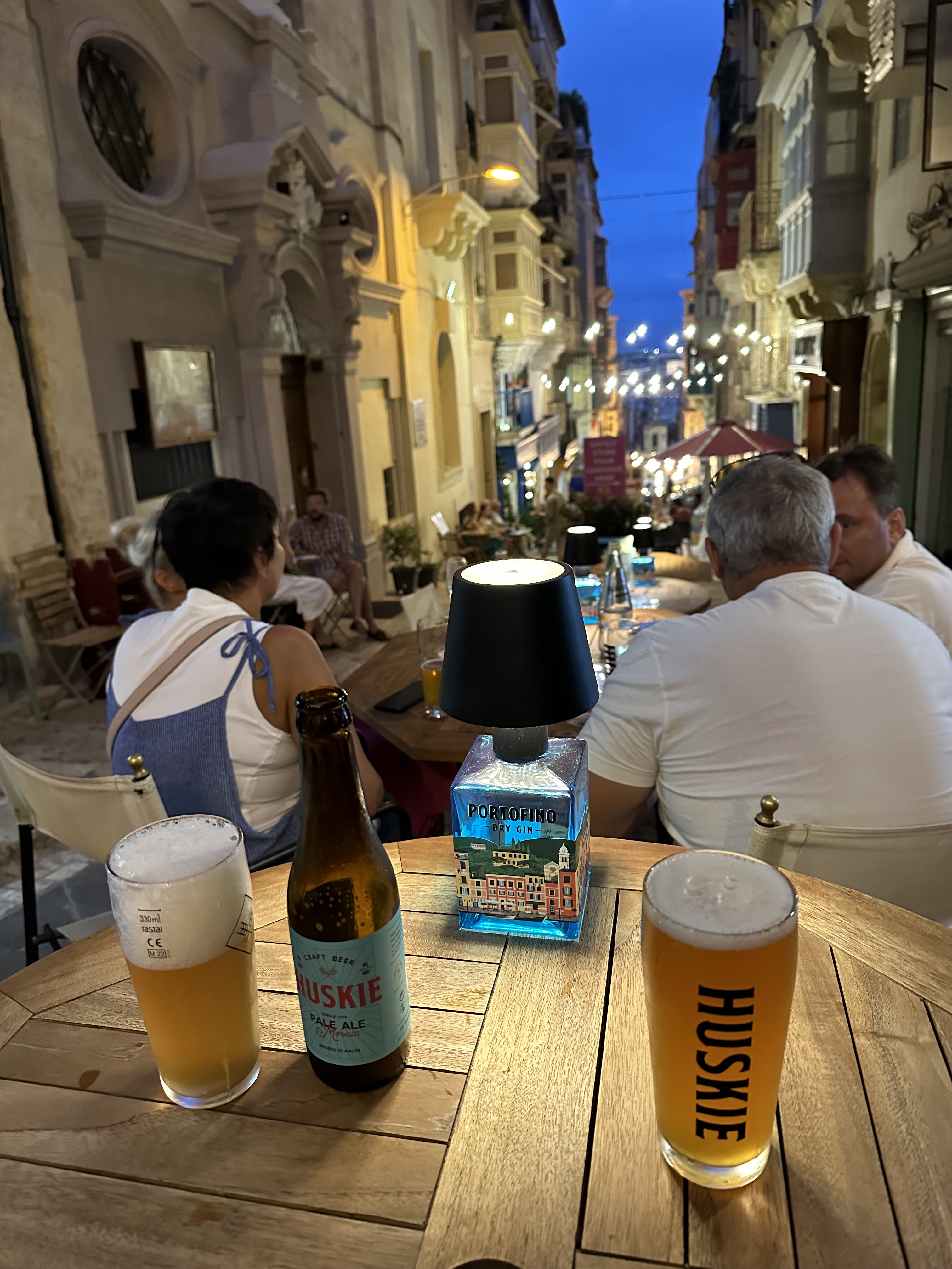 We catch a beer on a downhill street cafe.There are still crowds of peopleThe streets are lit and crowded