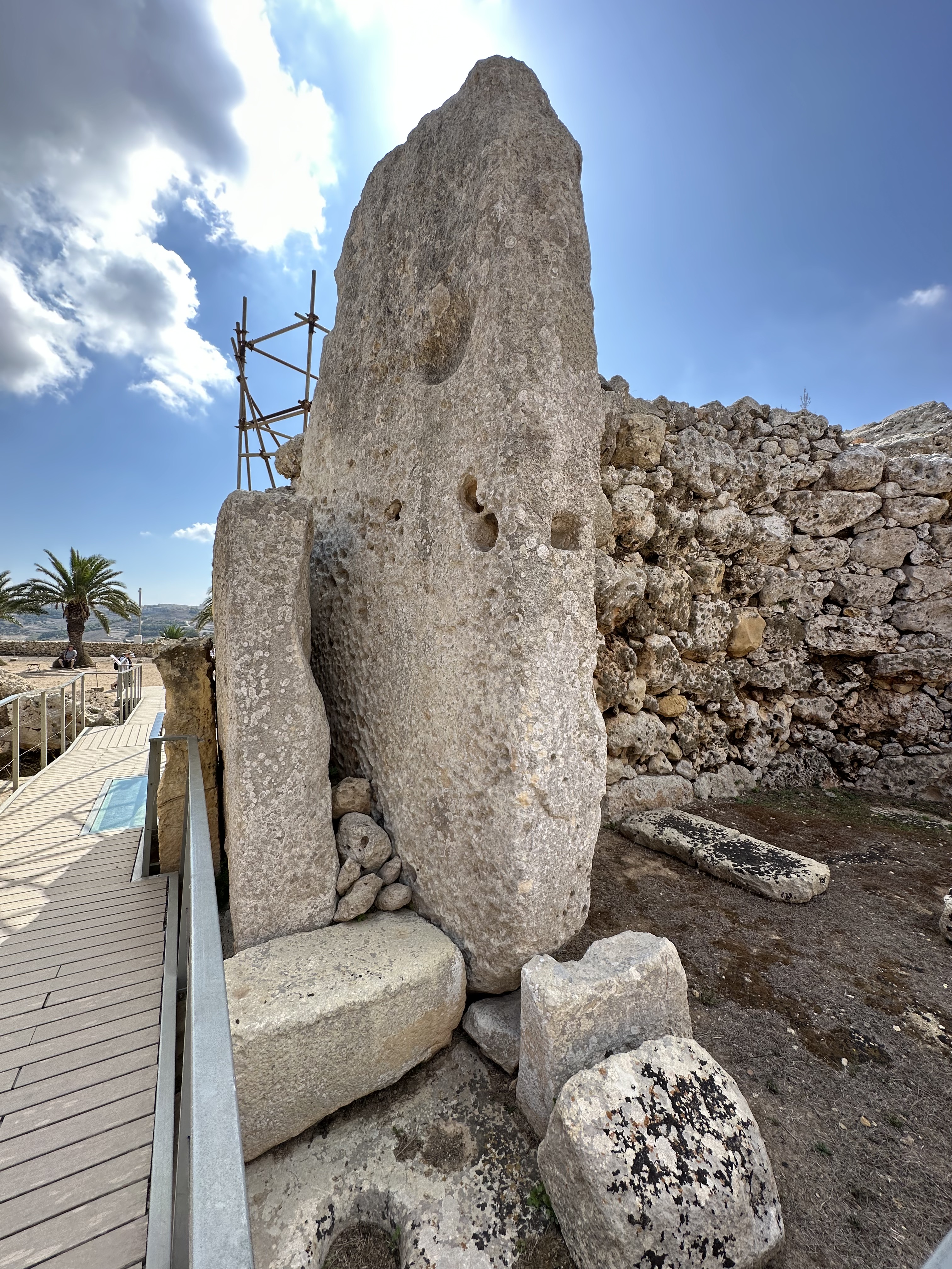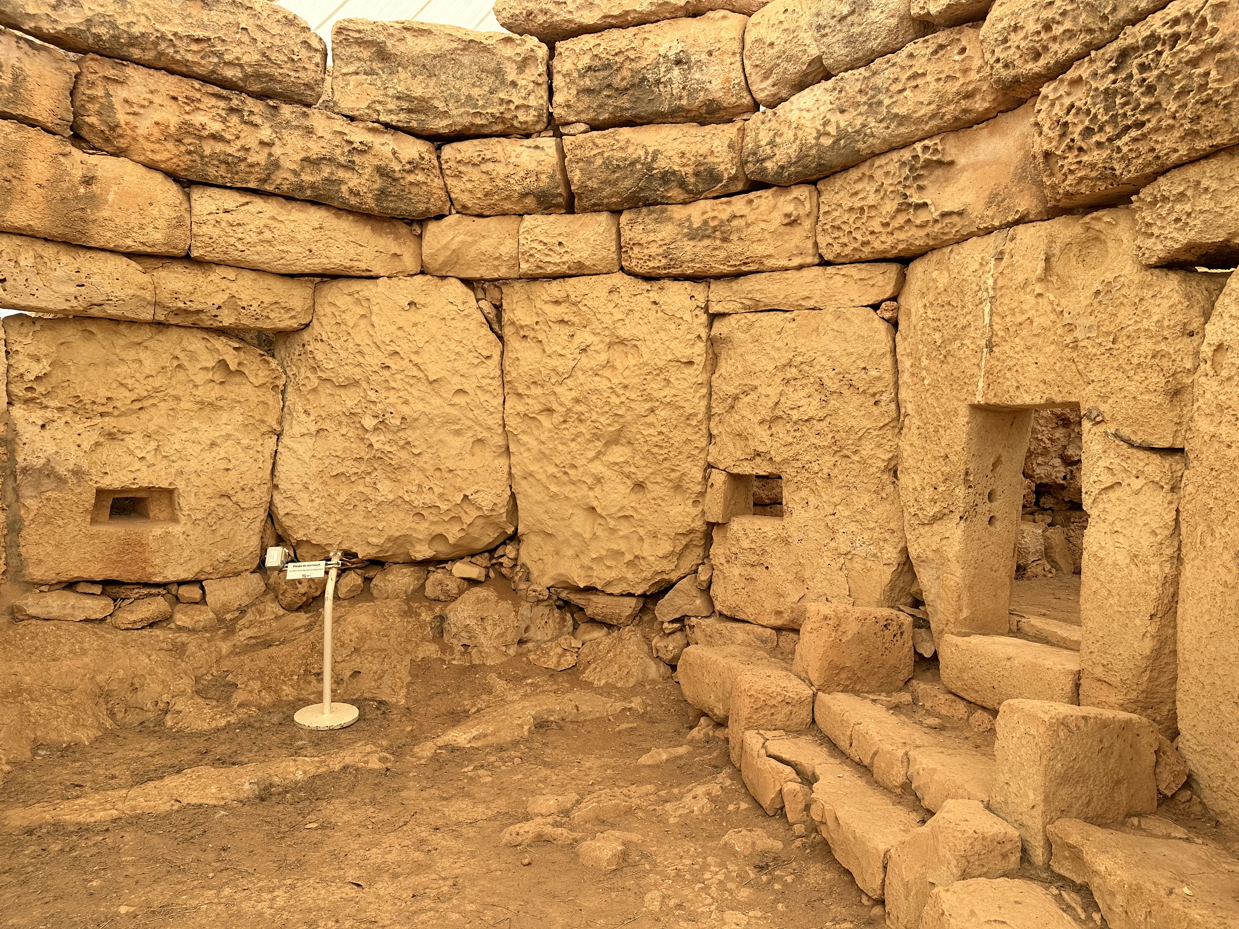 Approaching the Ggantija Temples by carThe back of the temple structureA side wall of the templeElevated walkways keep people from damaging the temples.An entrance to a roomMimi and Phil are captivatedAnother roomA door way. THe holes may have been used as a baracade.A rebuilt structure An entrance to a roomTHe hole here was made only with stone tools as no metal was yet available.