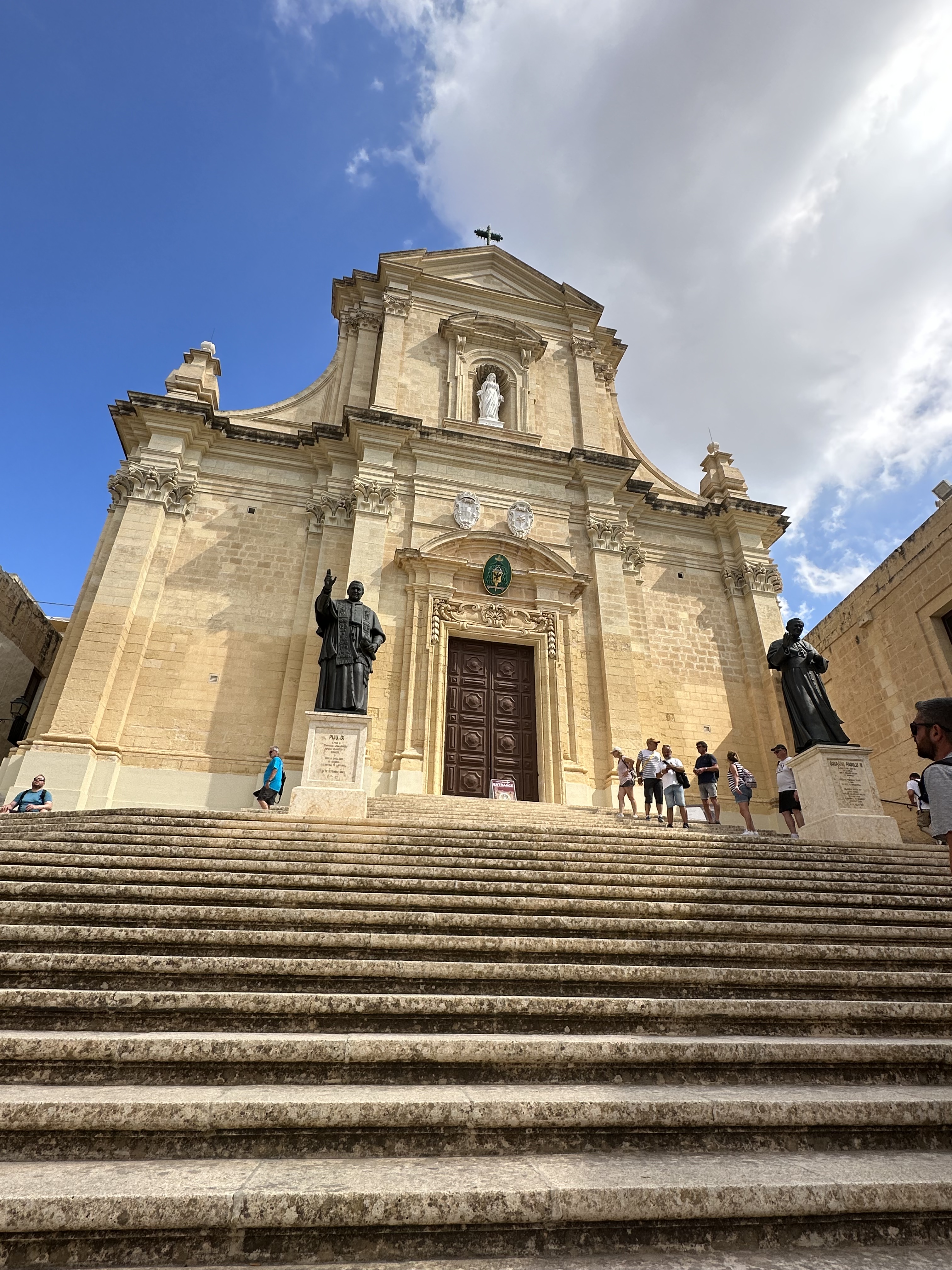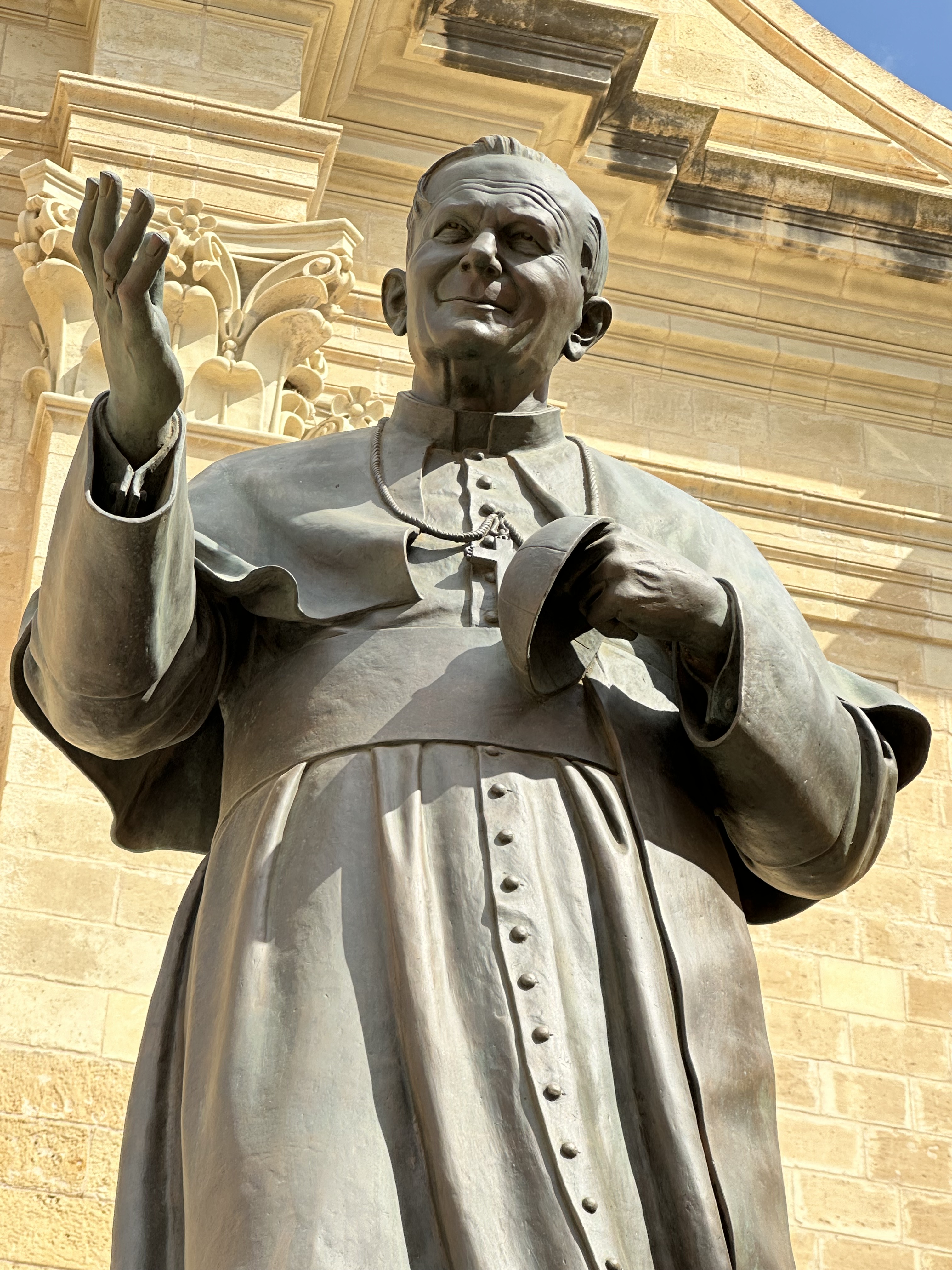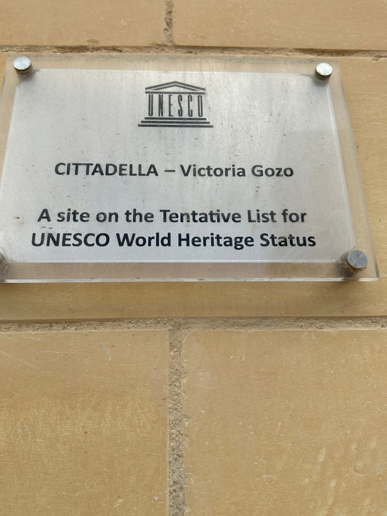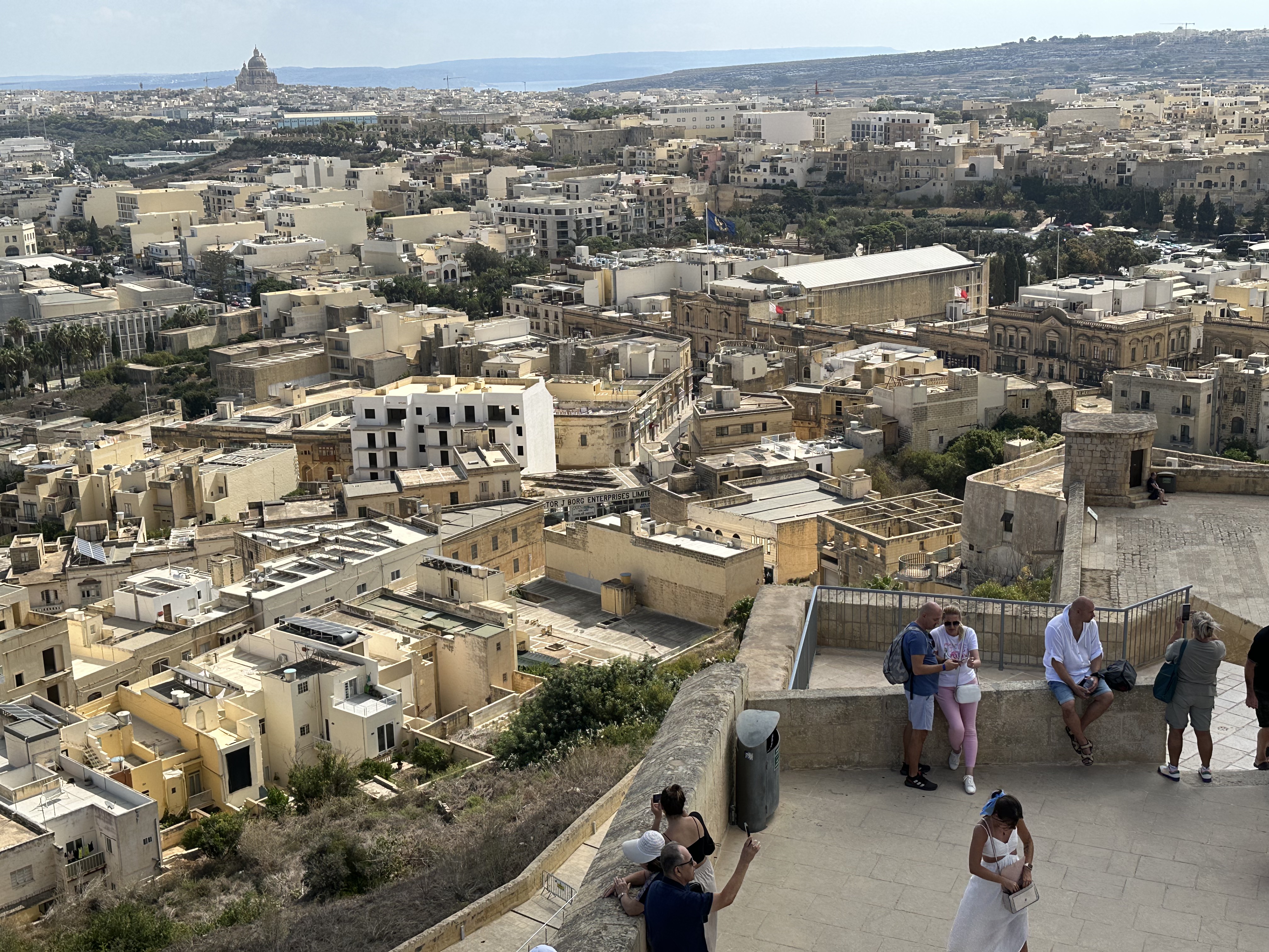 A bronz cast of the citadelA UNESCO World Heritage SiteEntering the CitadelView of the city from the bastionsA government building in the CitadelInterior of the CitadeThe 4 of us pose for a photoA view over the desert like plain to the town of Victoria. Another view toward Victoria.A Citadel wallSt George’s BasilicaPope John Paul II stands in front of the Citadel Basilica