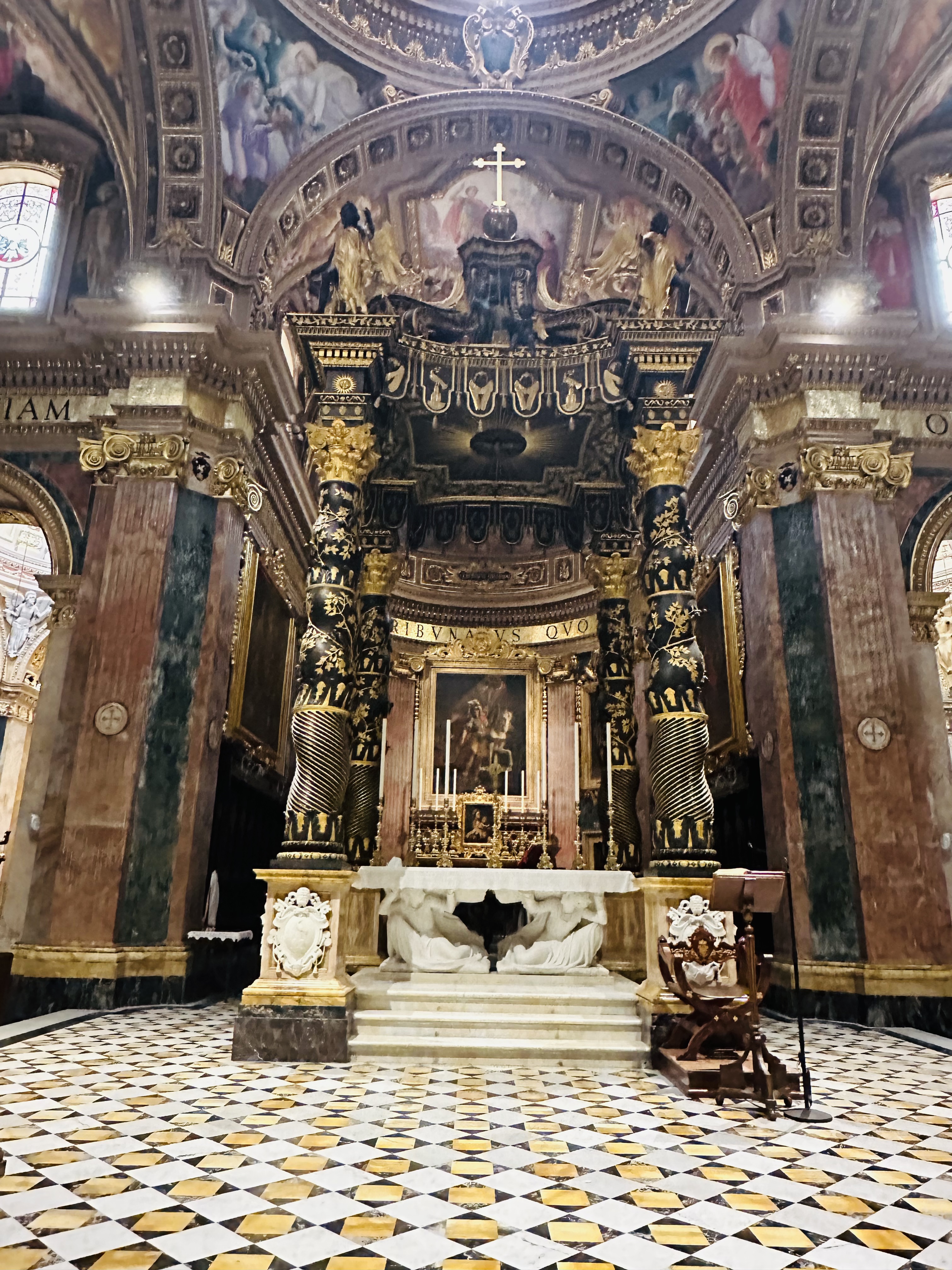 Inside the basilica the main alter looks a bit like St Peter’s in Rome. The church is very decorated and painted.