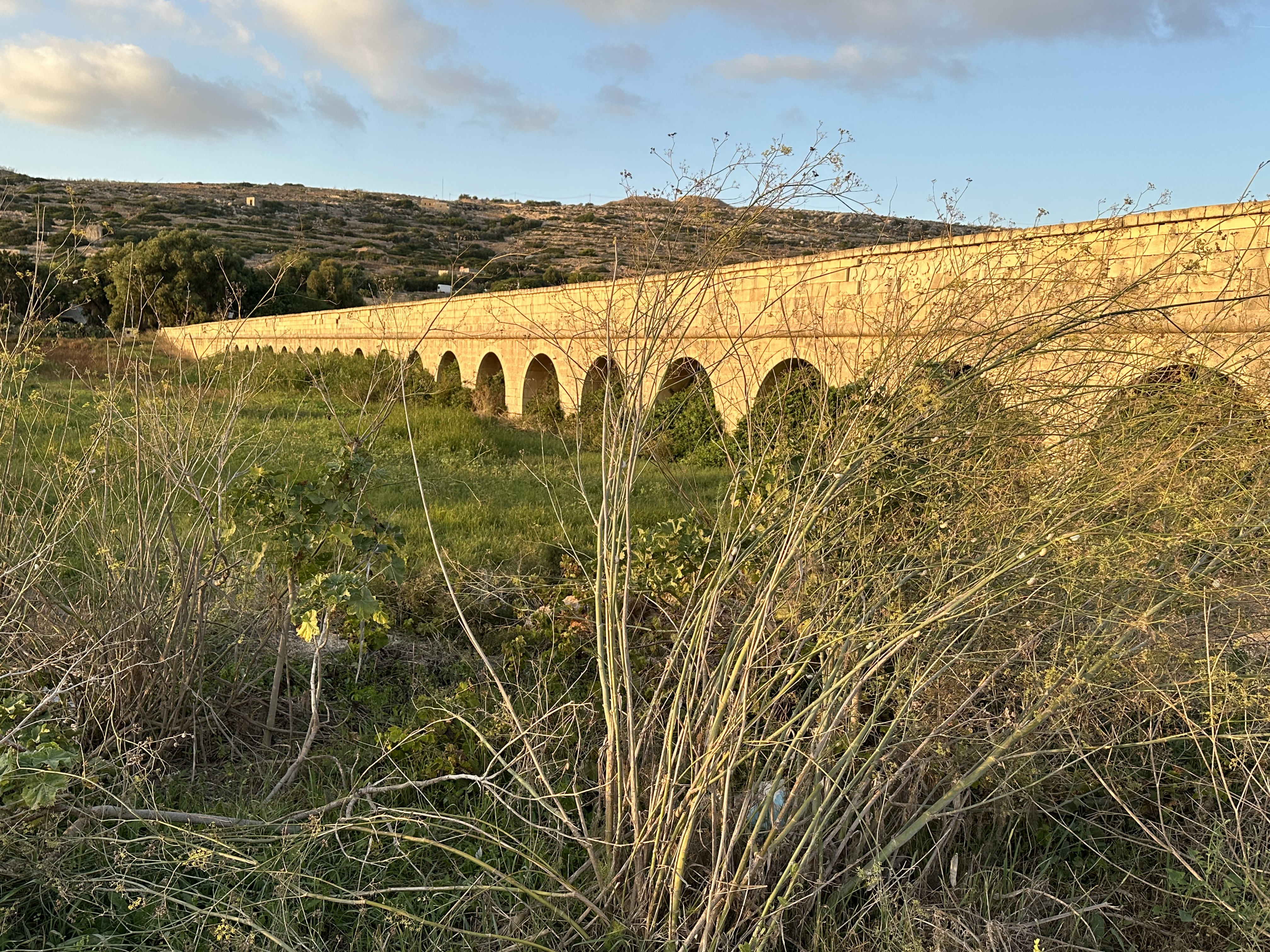 The table was setWe thoroughly enjoyed the mealAnd happily left the dregs.We stoped at the beach in Victoria for a foot in the Mediterranean A shot from the ferry as we passed by Phil and MIM riding in the vanAn ancient aqueduct at sunset in Malta.