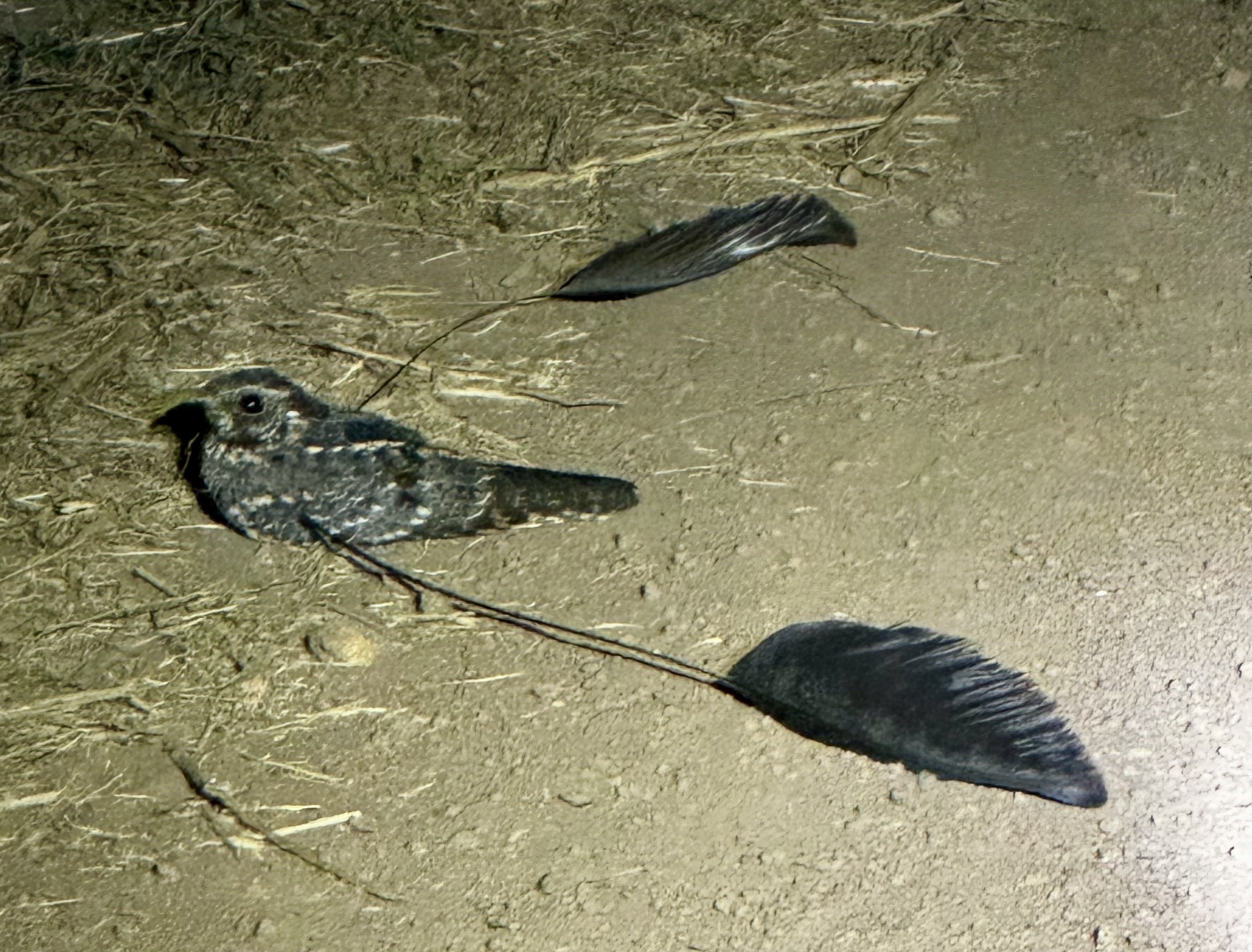 At 5:30 Ruth, John, director of conservation, and the three of us packed for a sundowner and drove up to the white Rhinos just in time to beat the sunset. Beer and snacks were our repast while we watched the rhino graze and a managed fire burn in the distance. It was a very pleasant evening. John told us the park was increasing the boma size from 100 hectares to 500 hectares for the arrival of the next 64 animals. He will be going to South Africa to take delivery and escort the Rhinos to Garamba. They will be caged individually and tranquilized for the flight. On the way back, Jonathan used a large spotlight and and a flash light to watch for movement of animals and birds, especially night jars, the bird we most wanted to see. As it so happened we saw several male and female night jars. The males are the ones that are attractive as they have extra pennant wings that look like they are flying separately. At last, a male sat down in the road and I was able to get a photo of his pennant wings.