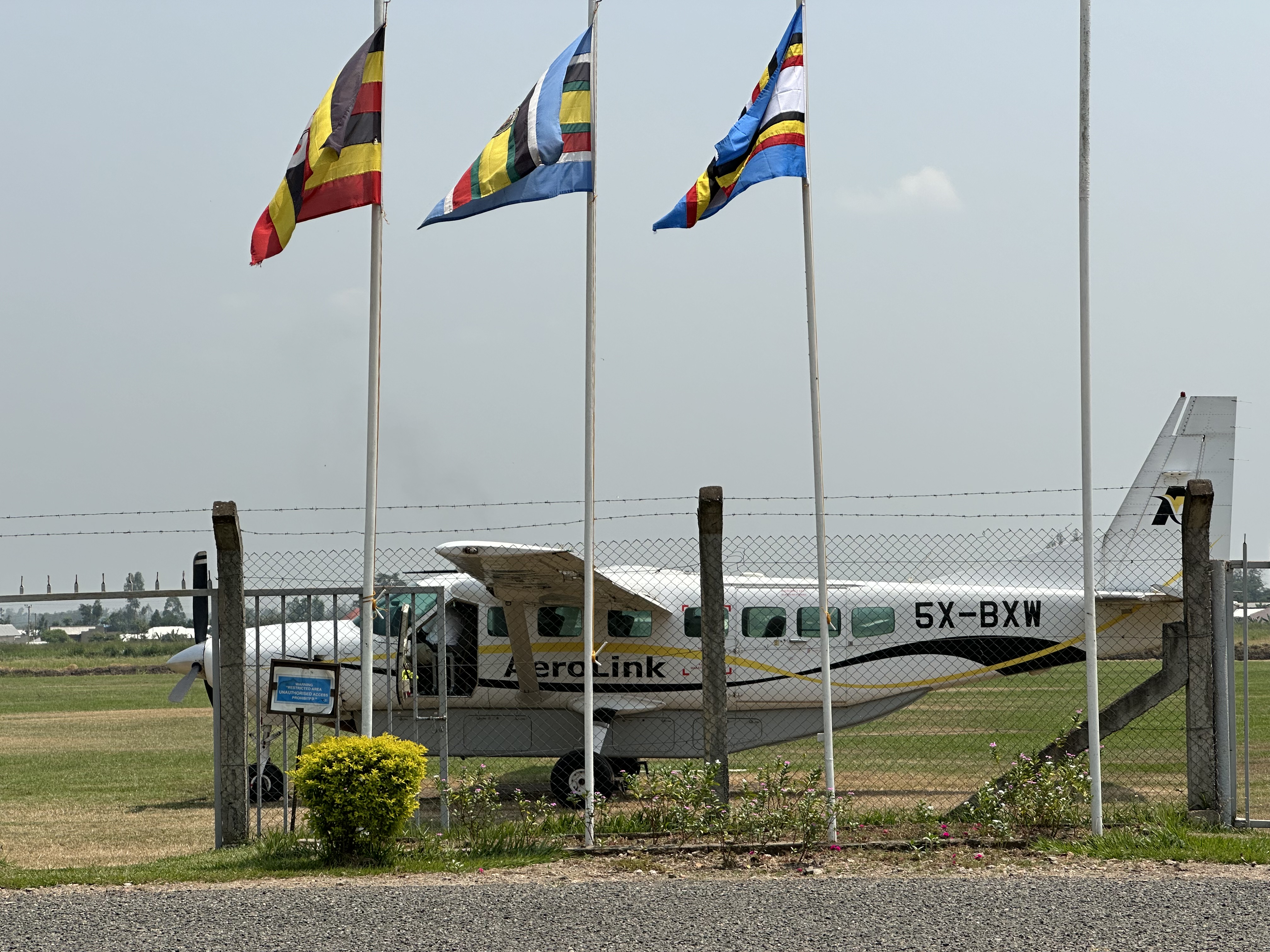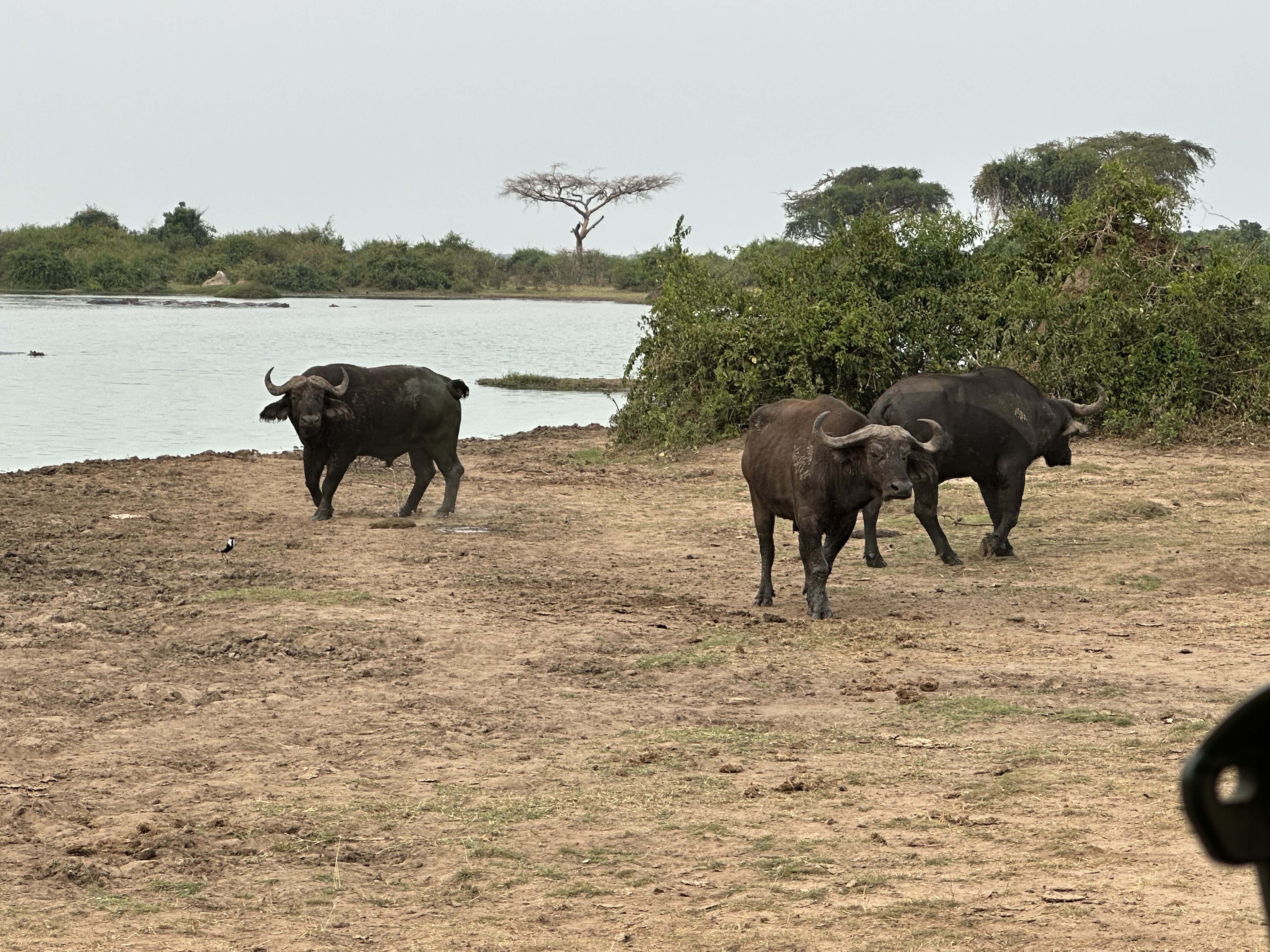 Had a relaxed morning and departed Honey Bear Camp at 11am by boat for Katunguru, 20 minutes away. Then drove 25 minutes, stopping midway for a herd of buffalo to pass, to Kasese airport, where we waited until 1pm for a Caravan to arrive.