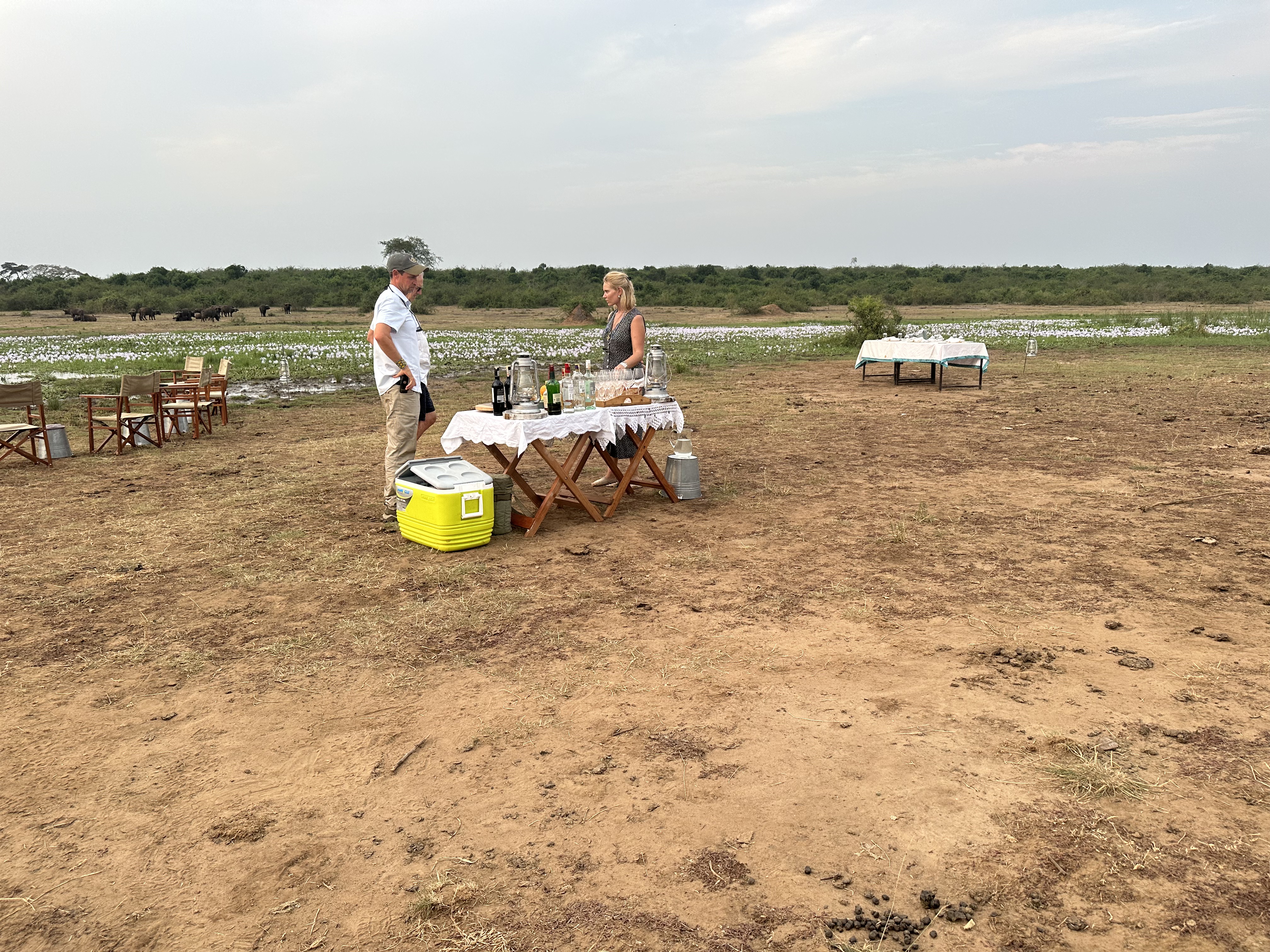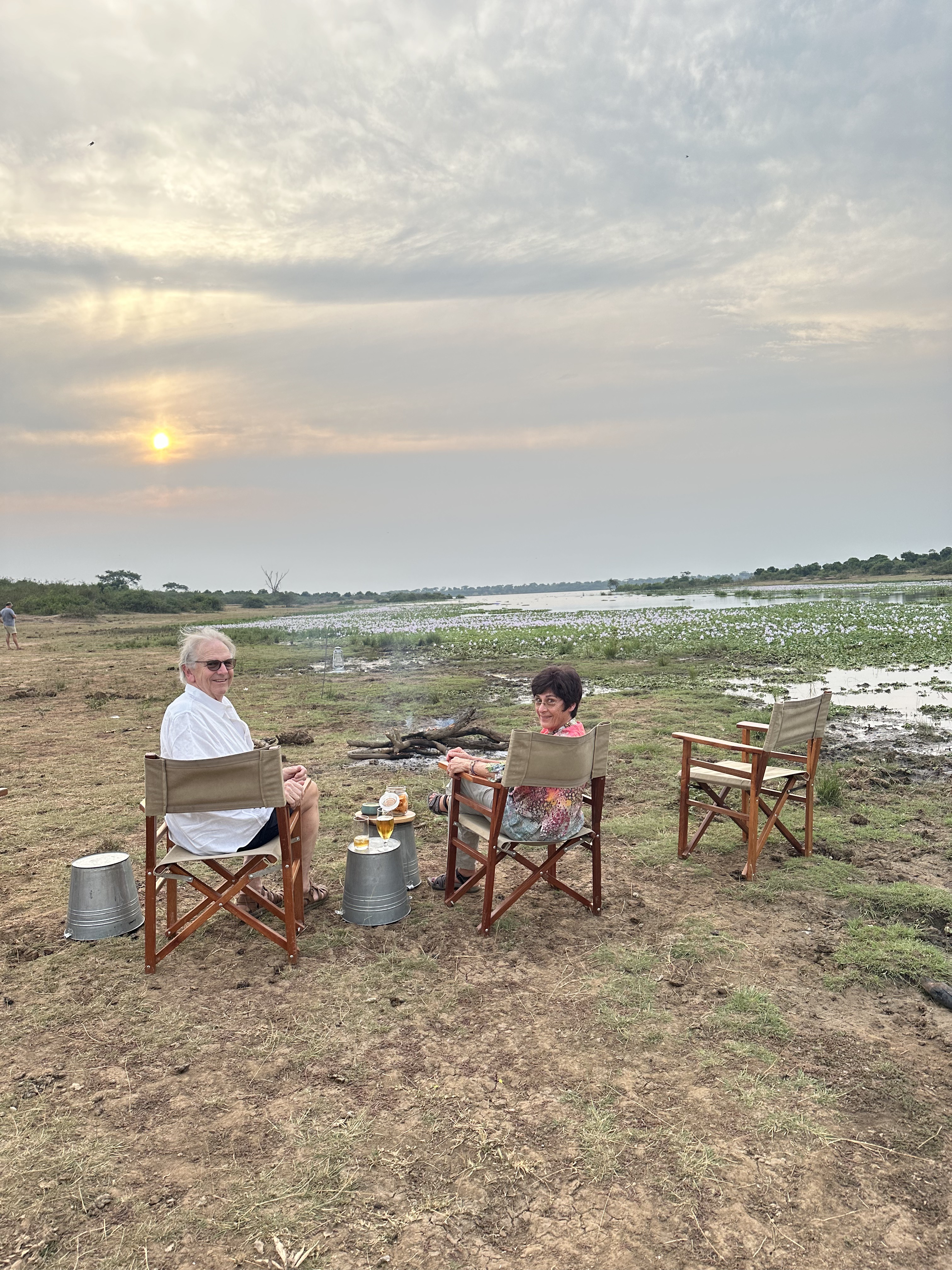 We were right at home. For three days we went on game drives and boat excursions to see animals and birds as well as thousands of hippos, some of whom came through camp each night to get to their grazing fields. Each day we had early morning coffee, followed by a game drive coffee break about 10am, lunch in camp about 2pm, sundowners at 5pm on drives or boating excursions and dinner in camp at about 8-8:30pm. It was too much food and too late to eat for me, but we braved it out rather than be impolite.