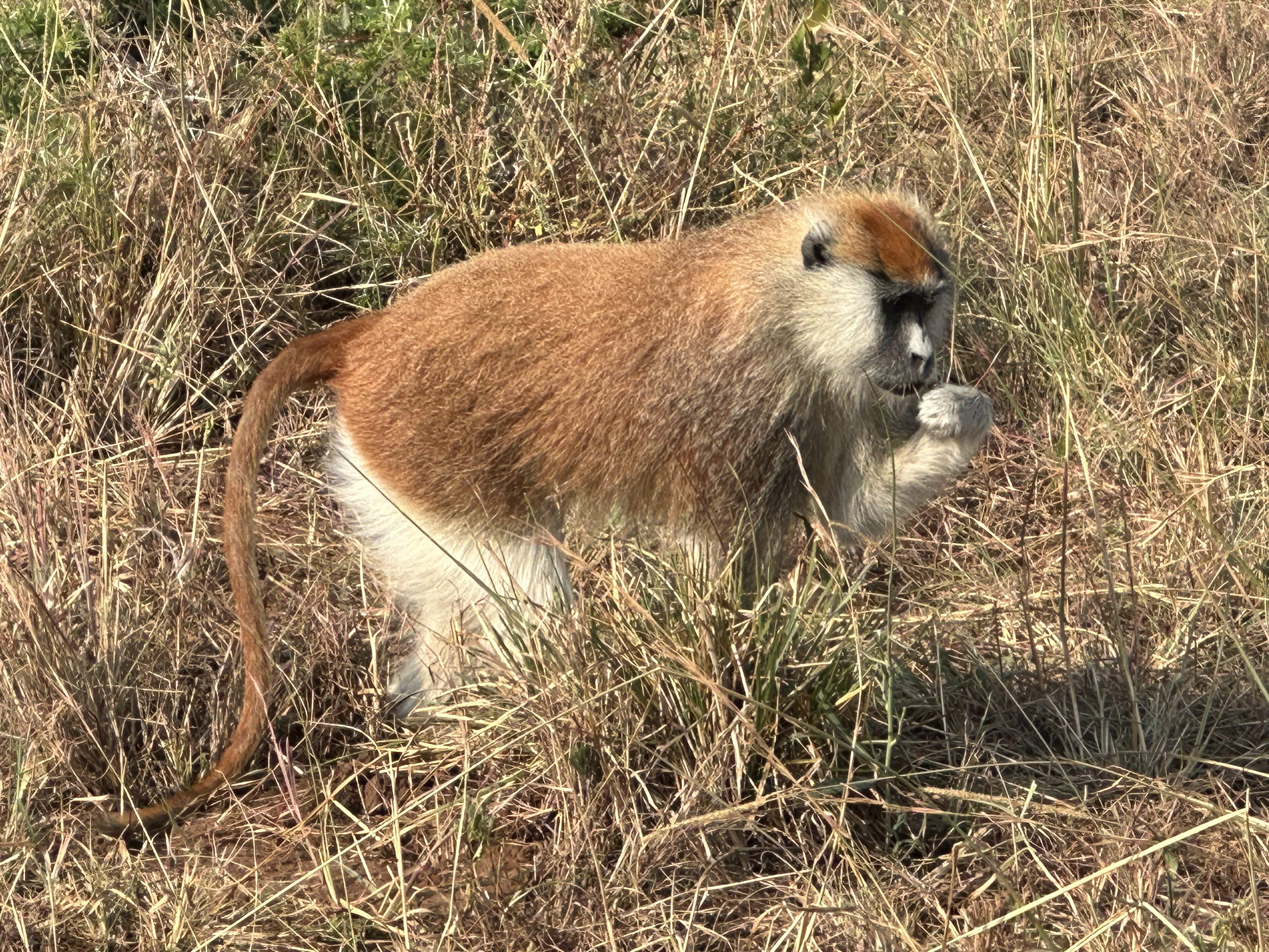 Up and out by 6am. We took a different road each drive. This time there was more trees and less open space. Our focus was on birds, and we saw many. I was able to identify: White browed coucal, Tawny Eagle, Sooty Chat, Northern Puffback, Martial eagle, Abyssinian Hornbill, and a pair of Secretary Birds. We also saw a Patas Monkey (See photo above). We must have seen more animals and birds, but I did not get them logged.