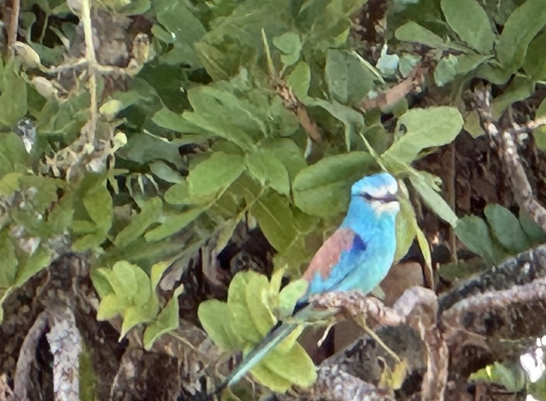 About 5:15 we began what was supposed to be a 1 hour walk that lasted 2 hours and found us trekking across logs and stumps in near darkness to get back to camp. I clung to Mark’s hand to keep from falling. The first half of the walk was fine. We saw a few special birds including a cardinal woodpecker. a red-billed hornbill, and a Pell’s Fish Owl, which was sitting grandly on a large limb in a nearby tree. It is so large that it is unlikely to be confused with any other bird. Still, I needed help spotting it, but managed to get a reasonable shot with my iPhone. Eventually we stumbled back into camp with the staff wondering what had happened to us. We were very hot and sweaty and wanting a full shower bucket of water each. The water was cool and refreshing, even though we were still a bit sweaty afterward. We had a pleasant dinner and by 9:30 were laying on our beds with no covers. The air was still quite warm.