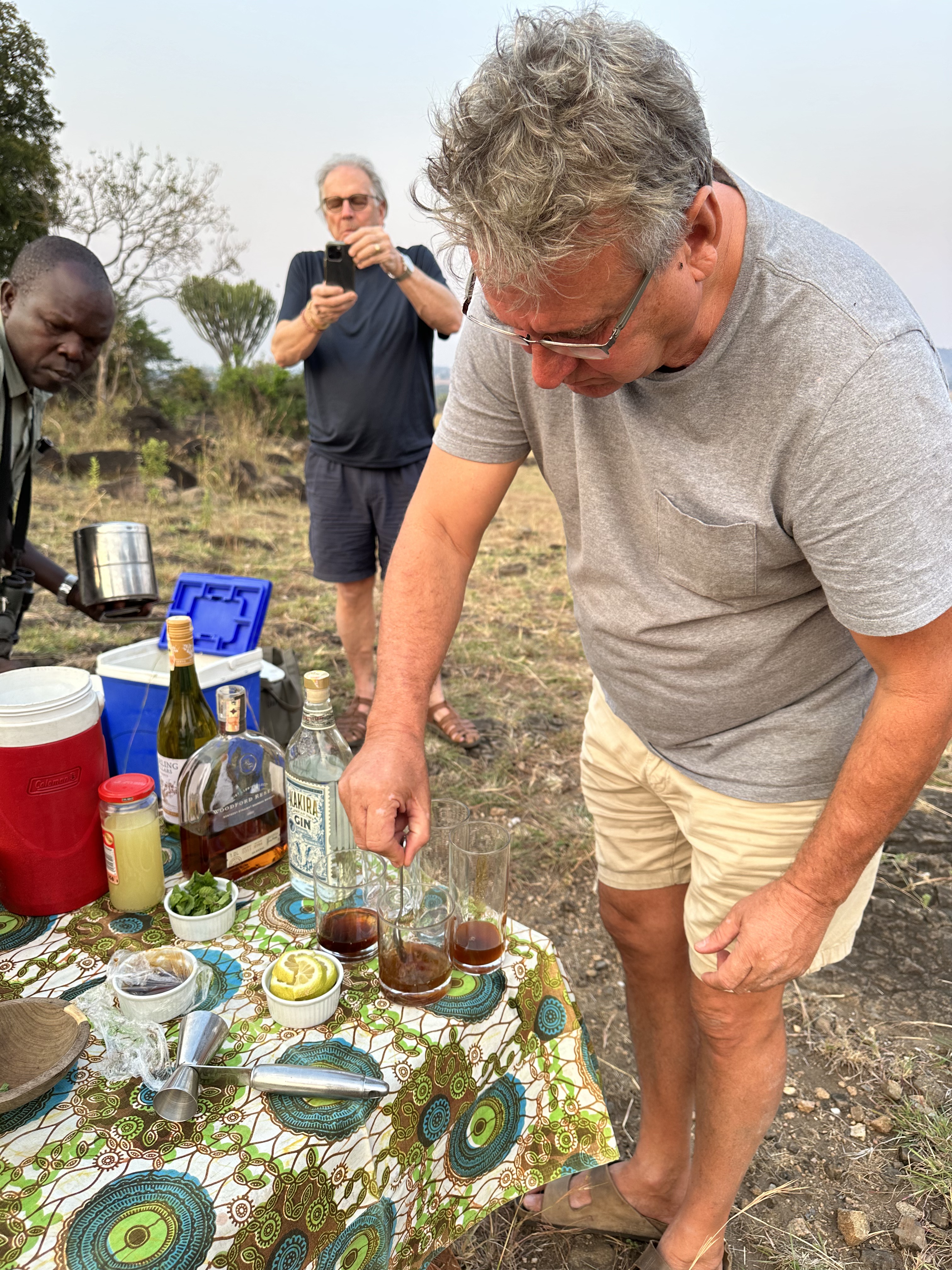 At 4pm we were back in the land cruiser hunting for predators, which we did not find. We did identify more birds, especially the Black Shouldered kite, the very colorful Abyssinian Roller (see photo below), a Yellow-Billed Kite and a Bateleur (see photo below). We were pleased to see several Rothchild giraffe along with a few elephants. On the crest of a hill, we stopped for sundowners. Jonathan and Emily outdid themselves making Mint Julips and Mojitos, which we thoroughly enjoyed. I don’t remember the drive back to camp, after the sundowners. Hmmm.