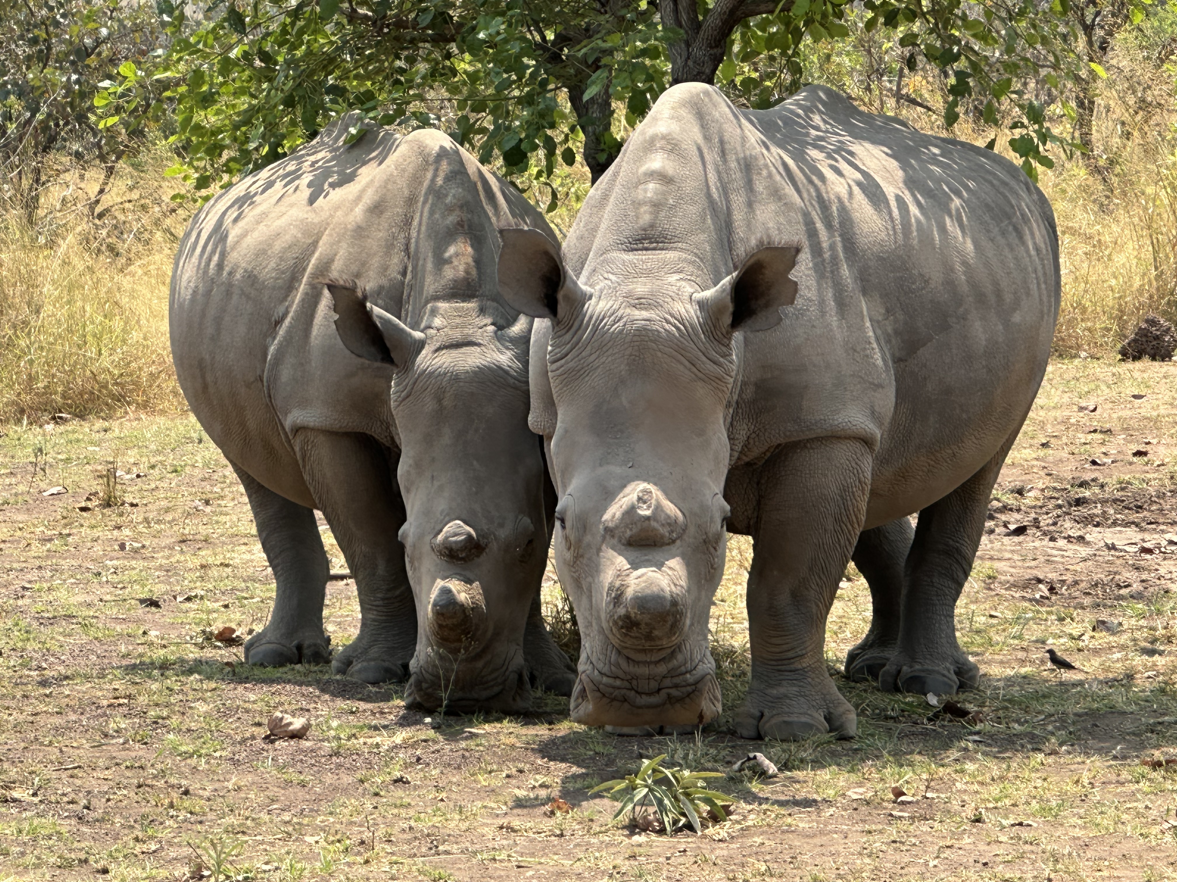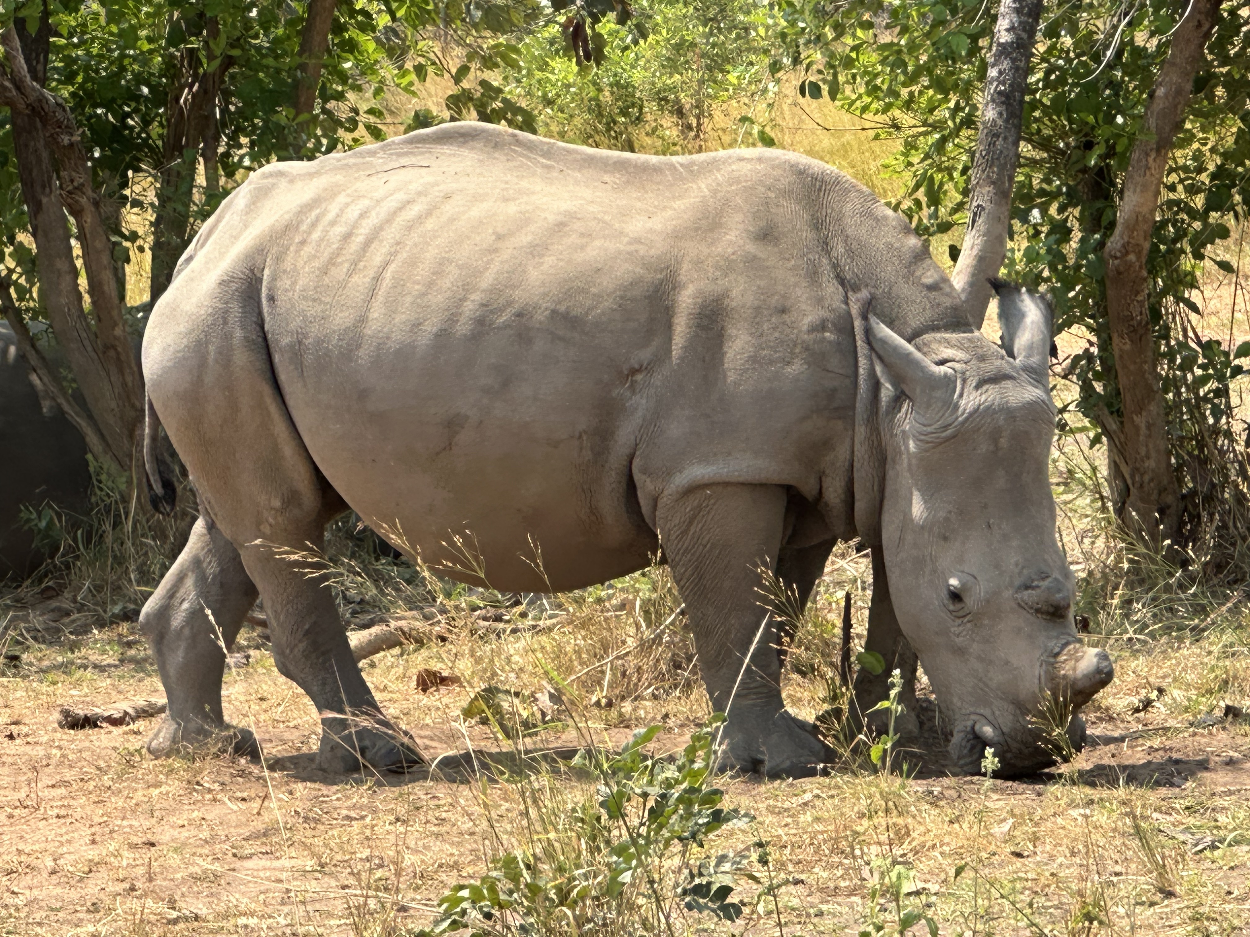 After a late breakfast with Martin, Ruth drove the three of us (Jonathan, Mark and me) 40 minutes up the road to visit the 15 white rhinos in their electrified sanctuary. Along the way Jonathan spotted white headed and white backed Vultures, a black bellied bustard, a martial eagle and a northern wheat ear. When we reached the Rhino, they had already finished eating and were looking for the shade of a few trees to nap. After spending a good bit of time with them, we visited the nearby park headquarters from where law enforcement is managed.