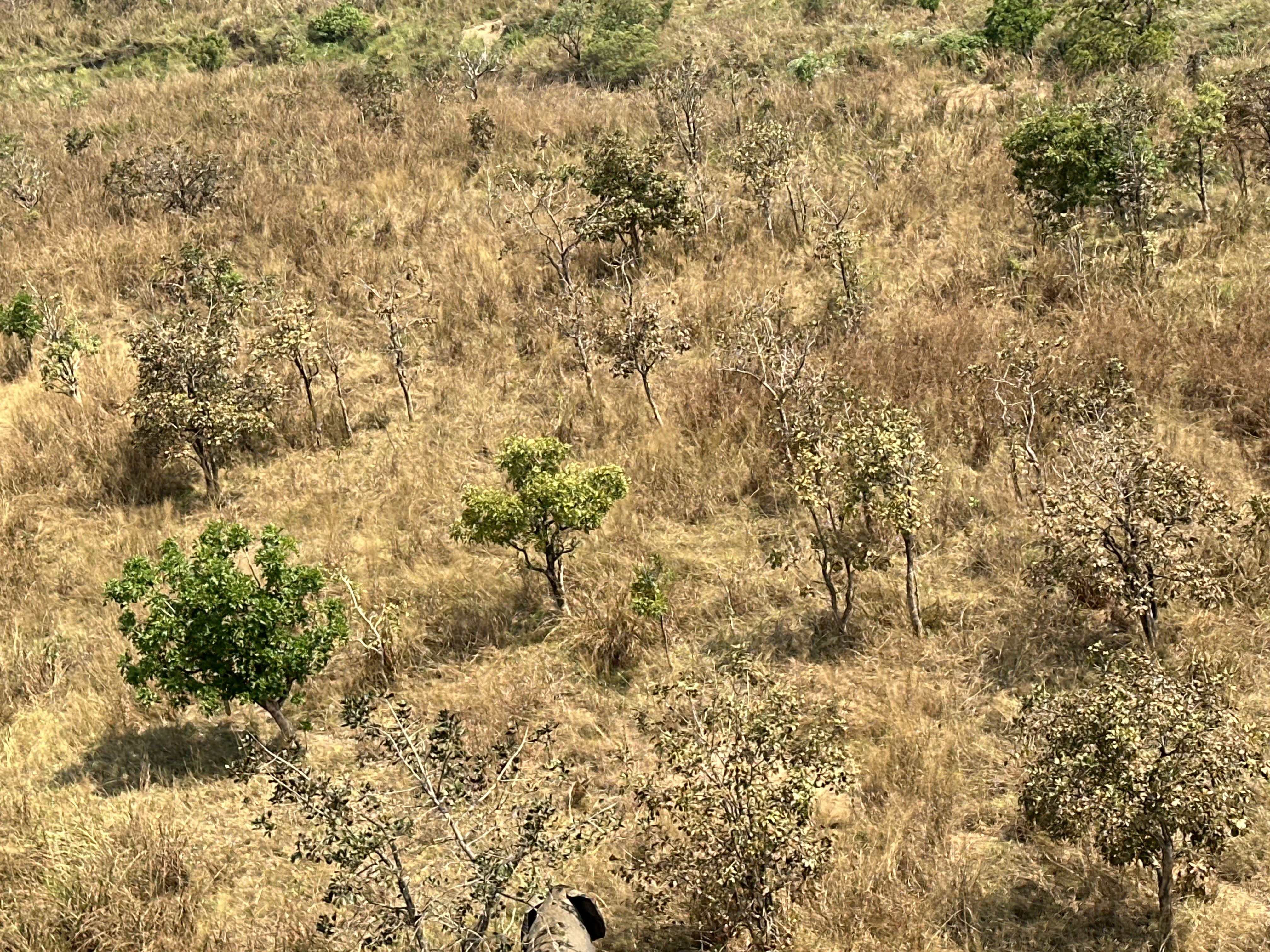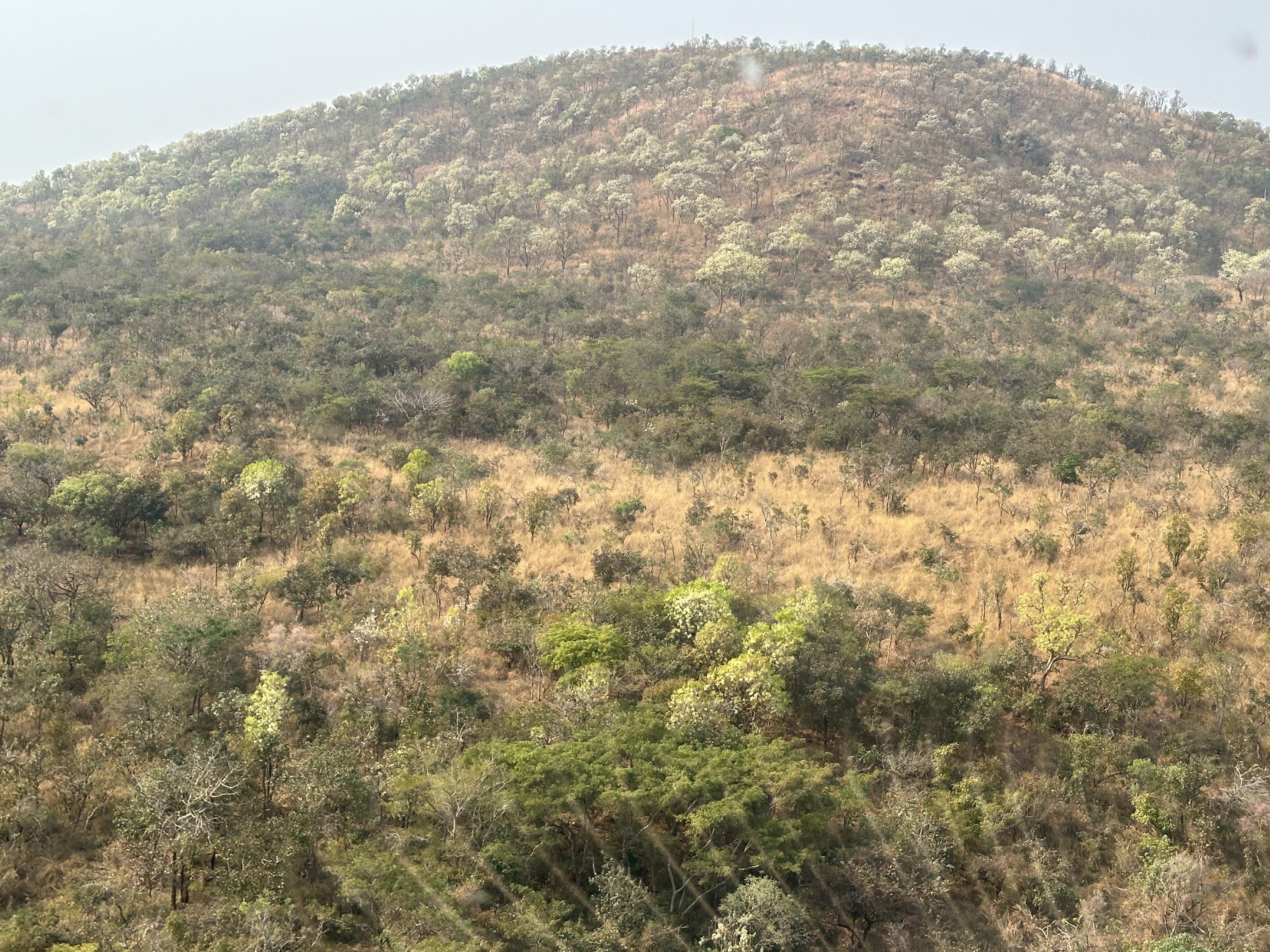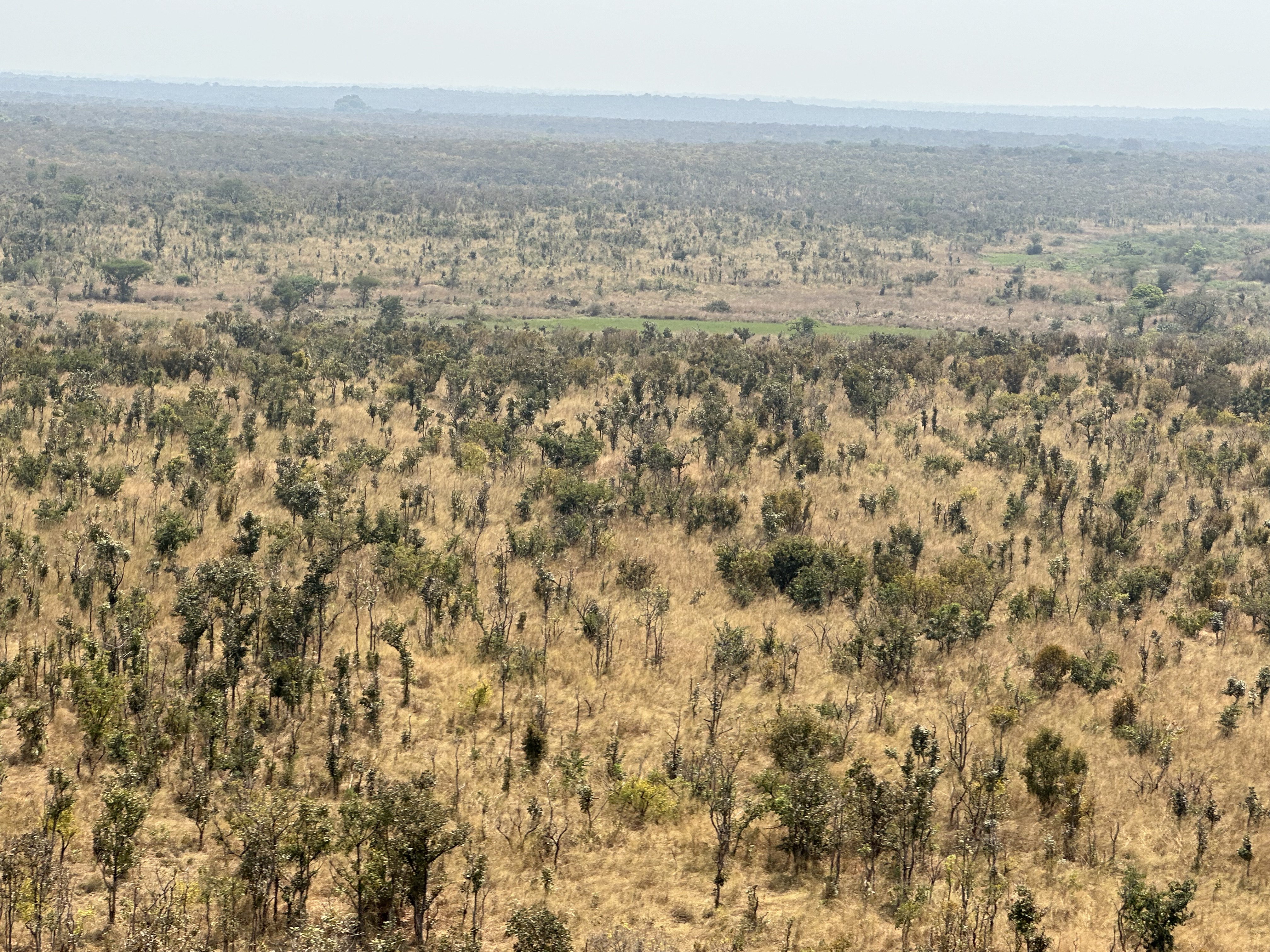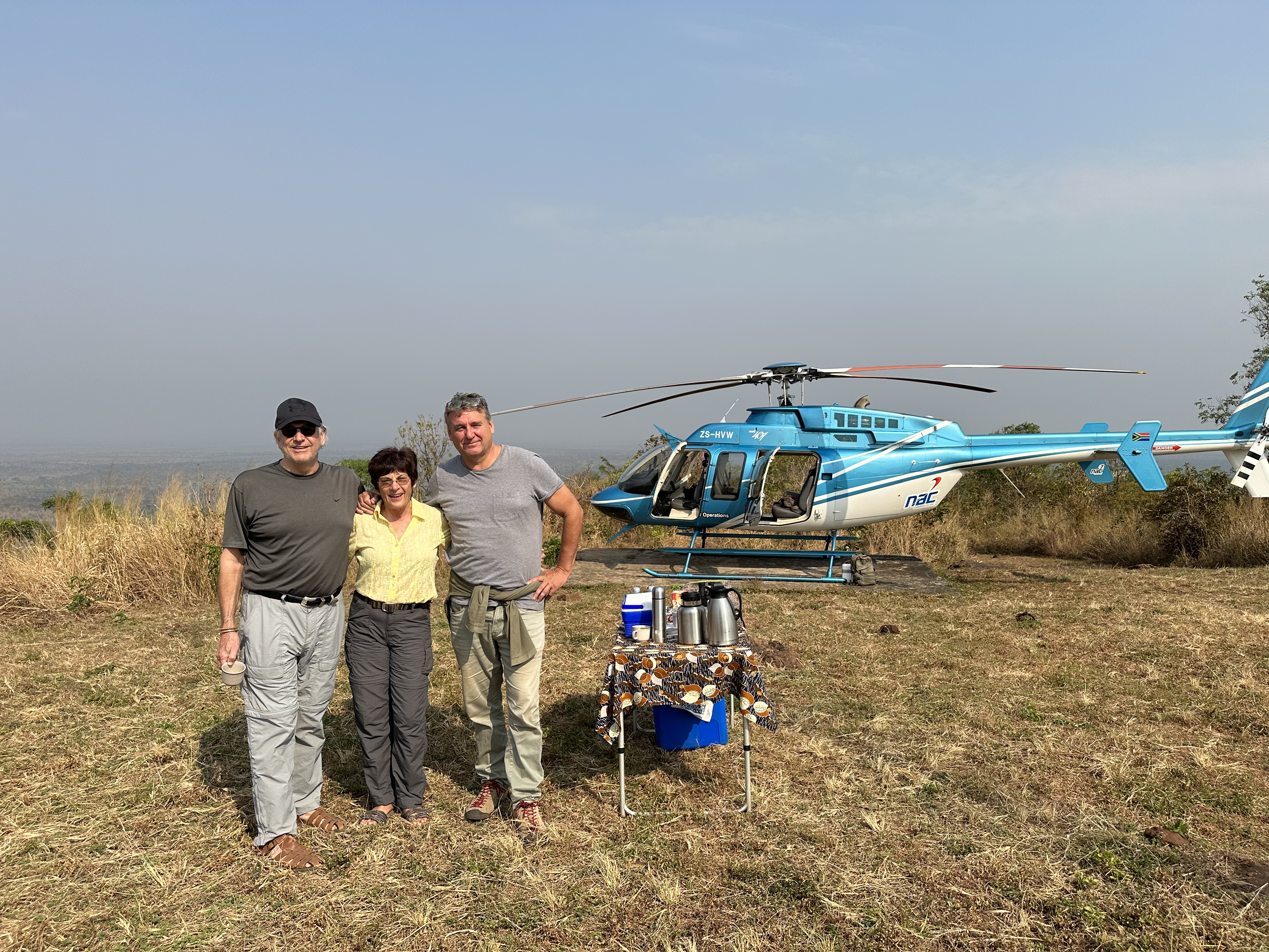 Our pilot, Oggie, was excellent and flew us low and slow as I had requested. We stopped at the top of the only hill in the park and had coffee and cookies while we enjoyed the view and chatted with the three guards manning the post. Back in the helicopter, we continued flying around the area and found a few more elephants and one Kordofan giraffe. We were happy that we found one and flew around it several times.I managed to get one decent photo of it. Oggie had us back at the lodge in time for lunch. The conversation was lively, even if the food left something to be desired. So far, the local cooks are preparing mediocre Congolese fair, that we do not find pleasing.