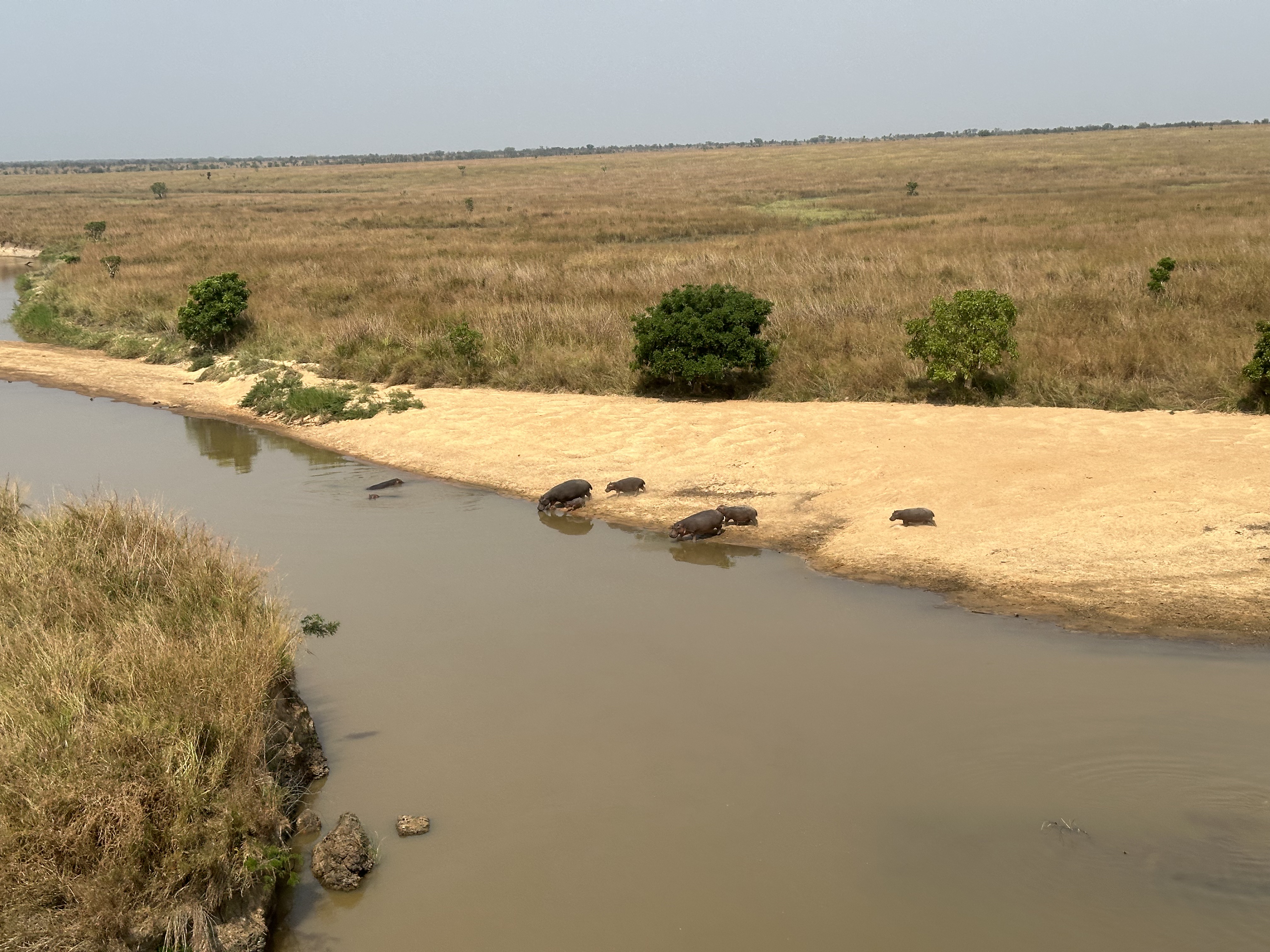 We went for a delightful 2-hour helicopter ride and saw extraordinary scenery, just as described above. We spotted good size herds of buffalo, between 50-70 forest elephant, (although we did not recognize any hybrid animals), several hundred Ugandan kob, a hundred or so of Lowell’s hartebeest, hundreds of hippos, several crocodiles, a few wart hogs, a handful of oribi and some waterbuck.