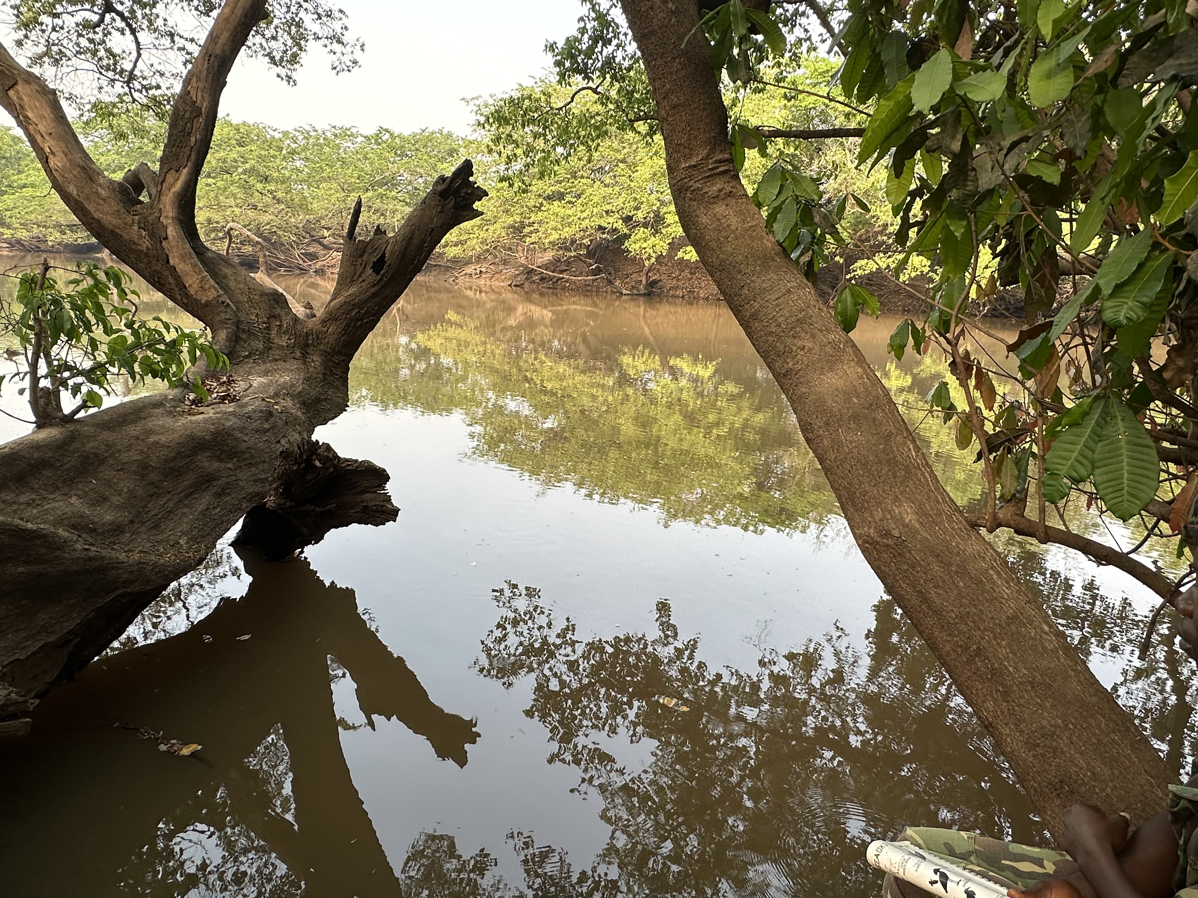 Breakfast and goodbyes to the Chen Camp staff at 8:30. Gave a special hug to Bardoley. Then we motored down river for an hour to the takeout where our cars were parked. So, we were off the boat and into cars for the next leg. Another bumpy dirt road followed by the paved highway for 1.5 hours to another 40-minute river trip, all to avoid an 8-hour serpentine river ride. Our boat was larger, and the next leg was pleasant. We saw a Sykes’ monkey in a tree and many bee eaters starting to build nests in the hillsides above the river. I was fascinated by the different striation in the cliffsides and wondered how old the hills were. Will thought they were at least 300 thousand years old.