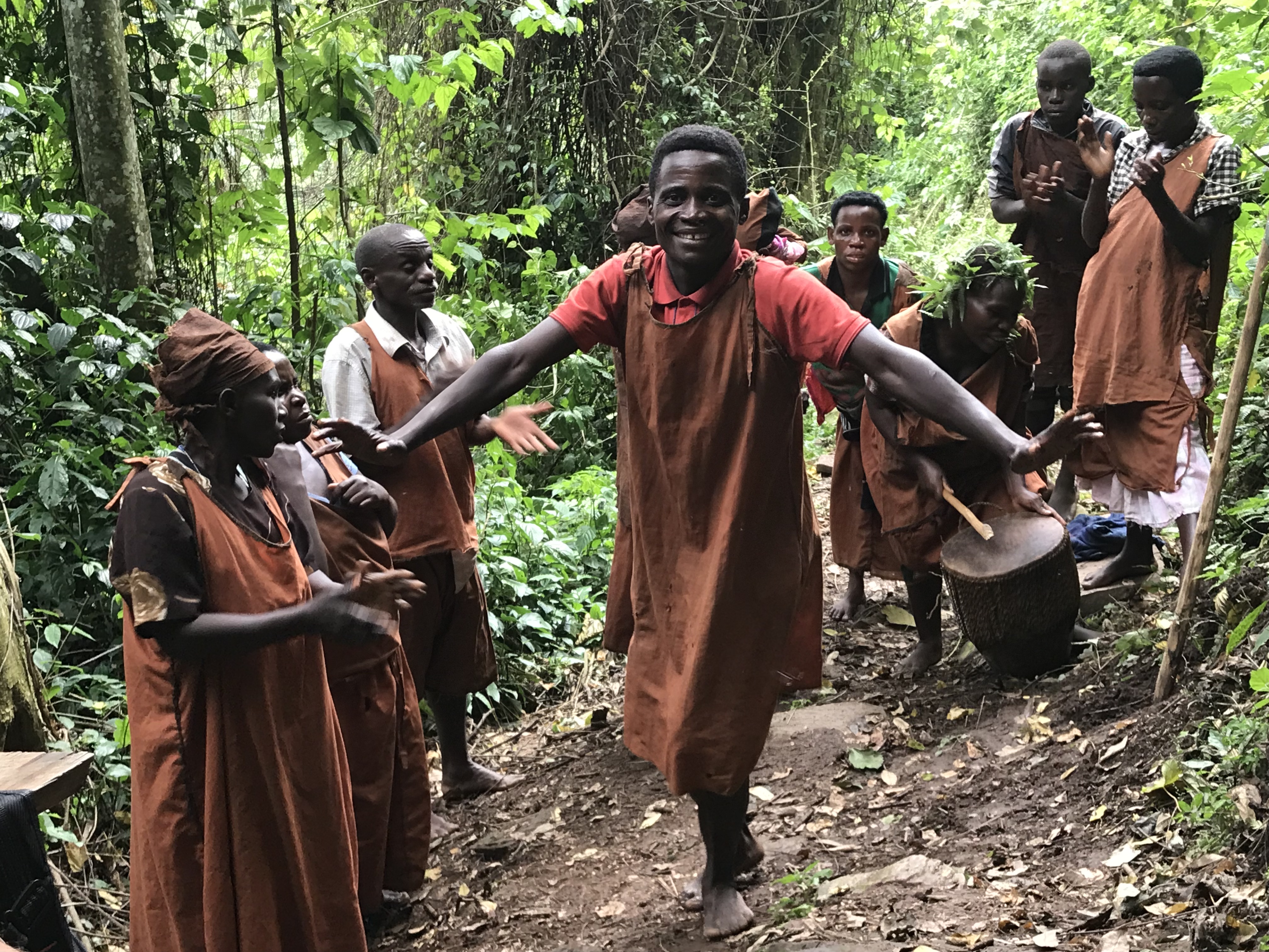 Below is a gorilla we saw along the trail. Below that is a group of Batwa dancing to drum beating and singing in the forest.