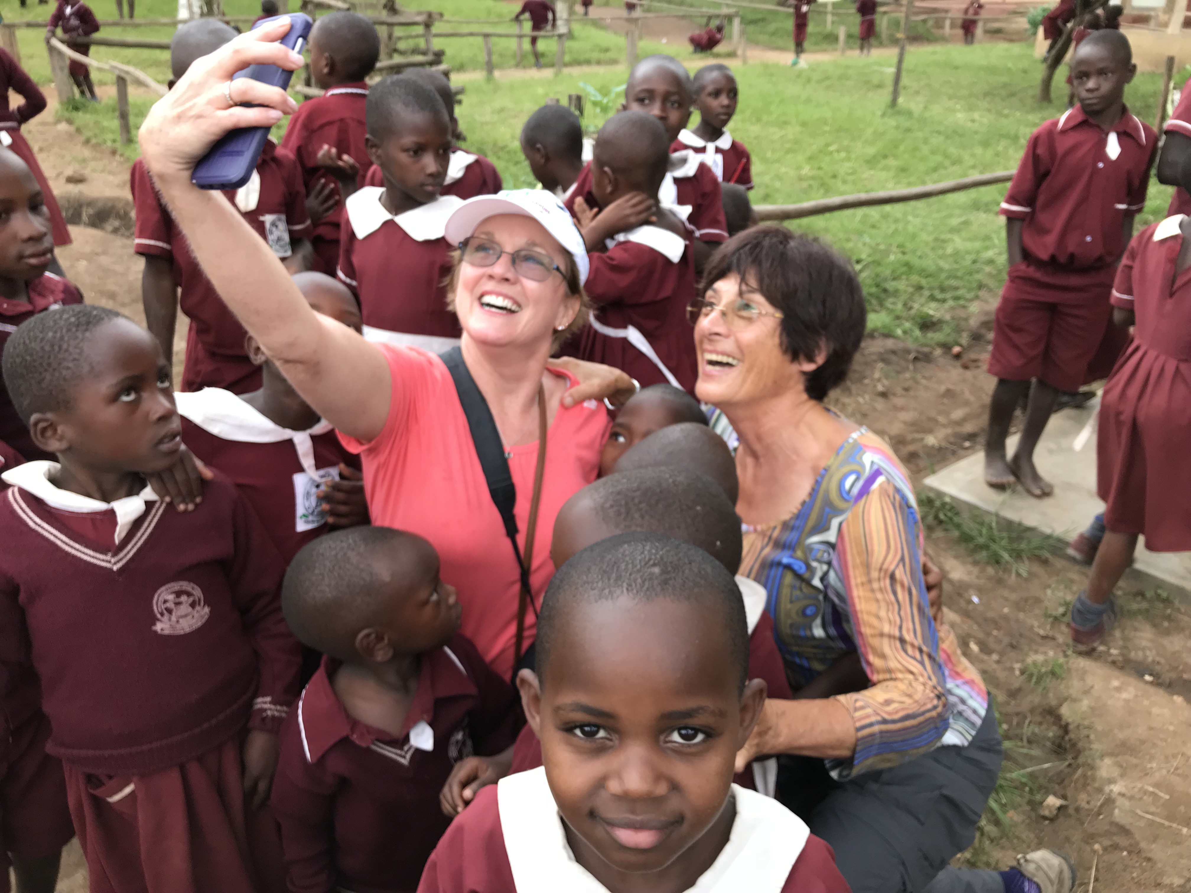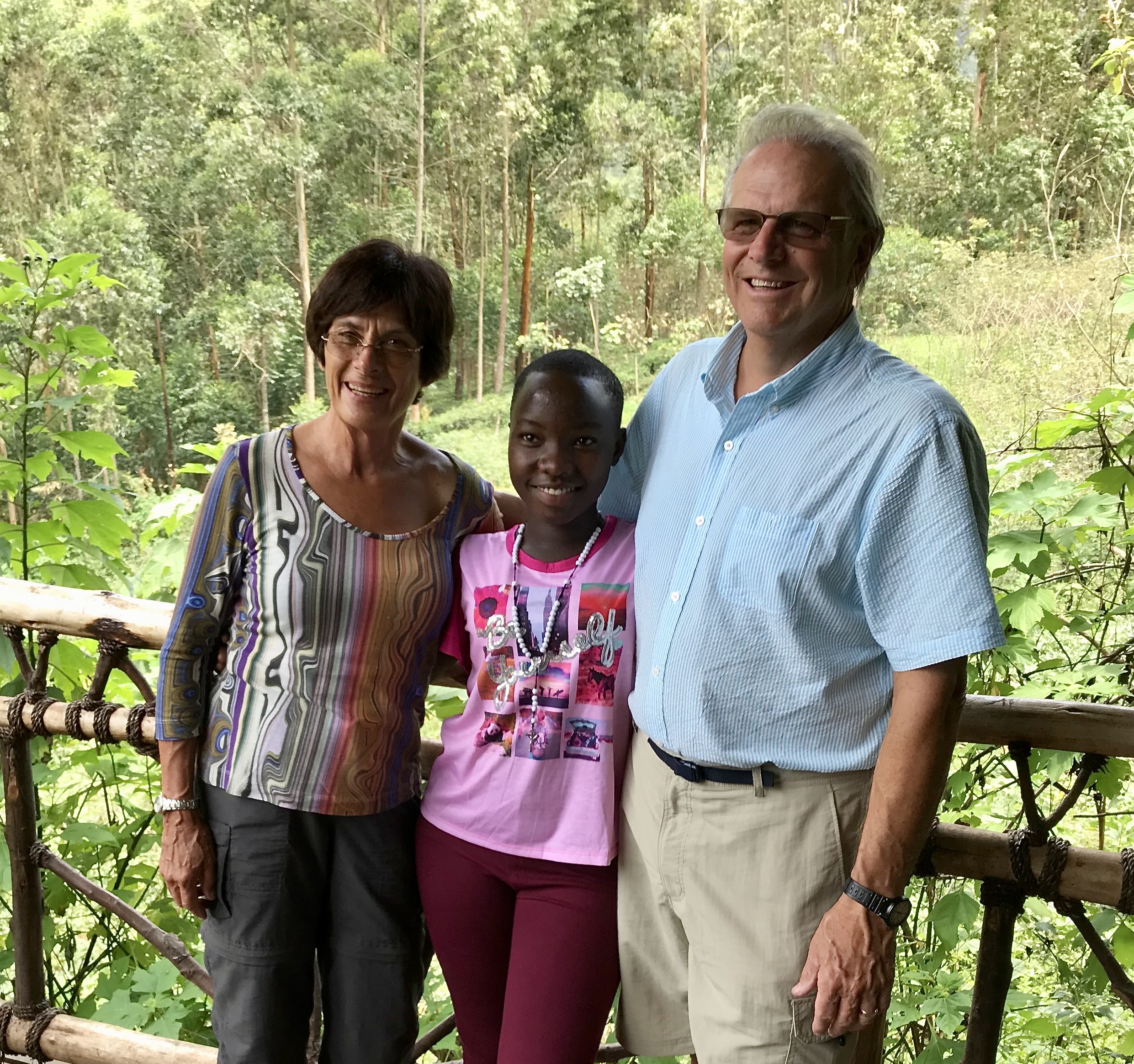 The girl in the photo with Mark and me is our godchild, Juliana. The girl just above with me is a Batwa Mark and I are sponsoring through school. Her name is Anivious. The large group is the staff in prayer at the beginning of the work day.