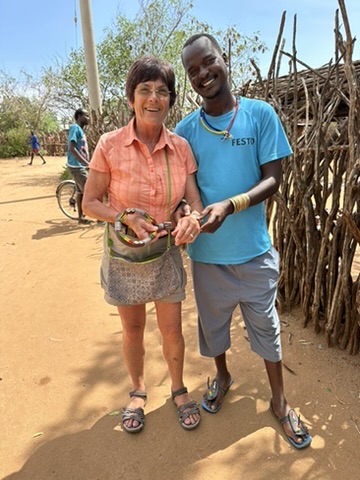 Eventually our Kenyan guide, Halowyn, arrived in two boats for our journey up the river, one boat full of gear, a second for us explorers. After an unimaginable lunch of fresh greens in a salad and wonderful charcuterie, we headed for the mouth of the river. As we reached the area of a sandbar we had to cross to enter the river, it was sadly evident there was not enough water to float our boats. We were in the water up to our knees but were unsuccessful in getting the boats to move over the sand. With crocs in the water our pushing efforts did not last long. Our plans to explore the Omo River delta were dashed. We did go on to have an enjoyable time with Halowyn, exploring other places and tribes around the lake.