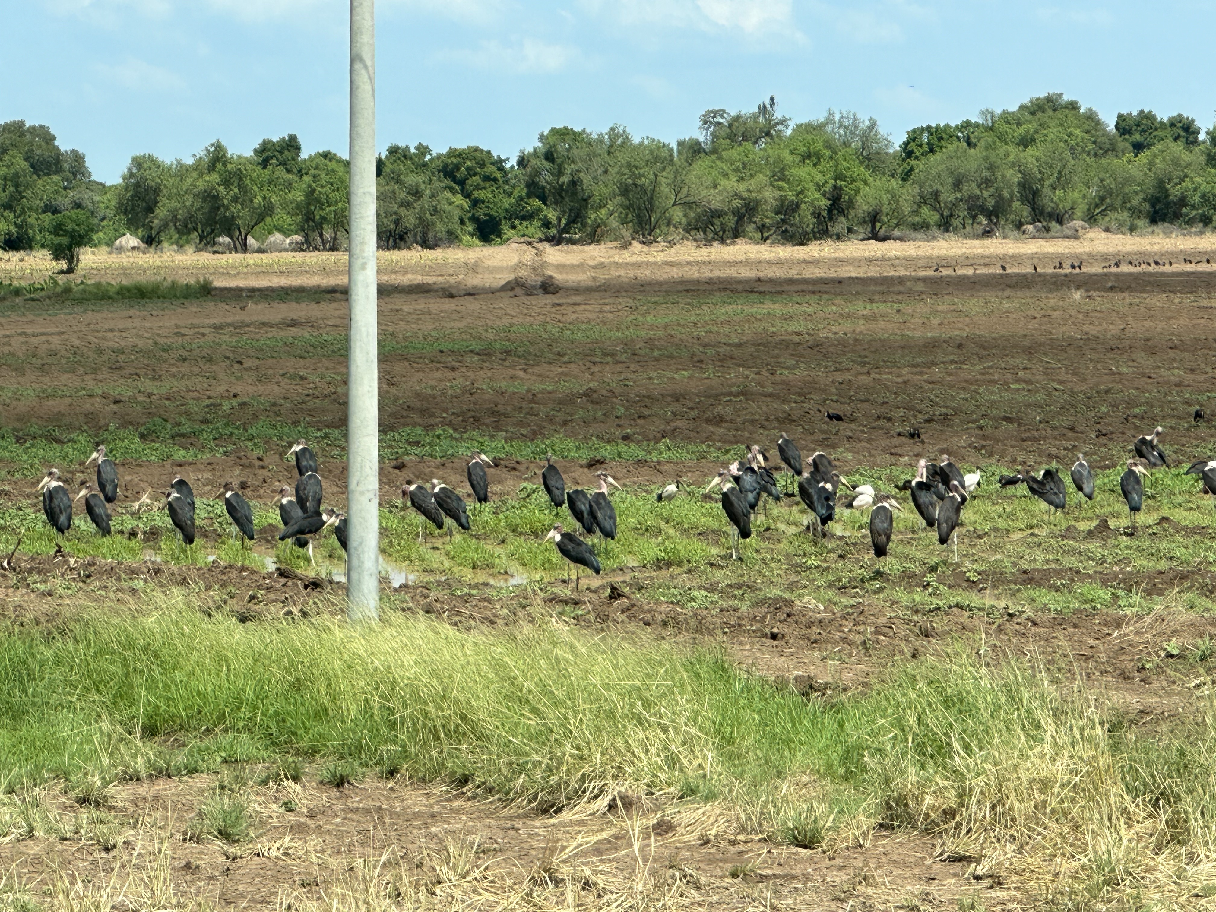 After a late breakfast with Martin, Ruth drove the three of us (Jonathan, Mark and me) 40 minutes up the road to visit the 15 white rhinos in their electrified sanctuary. Along the way Jonathan spotted white headed and white backed Vultures, a black bellied bustard, a martial eagle and a northern wheat ear. When we reached the Rhino, they had already finished eating and were looking for the shade of a few trees to nap. After spending a good bit of time with them, we visited the nearby park headquarters from where law enforcement is managed.