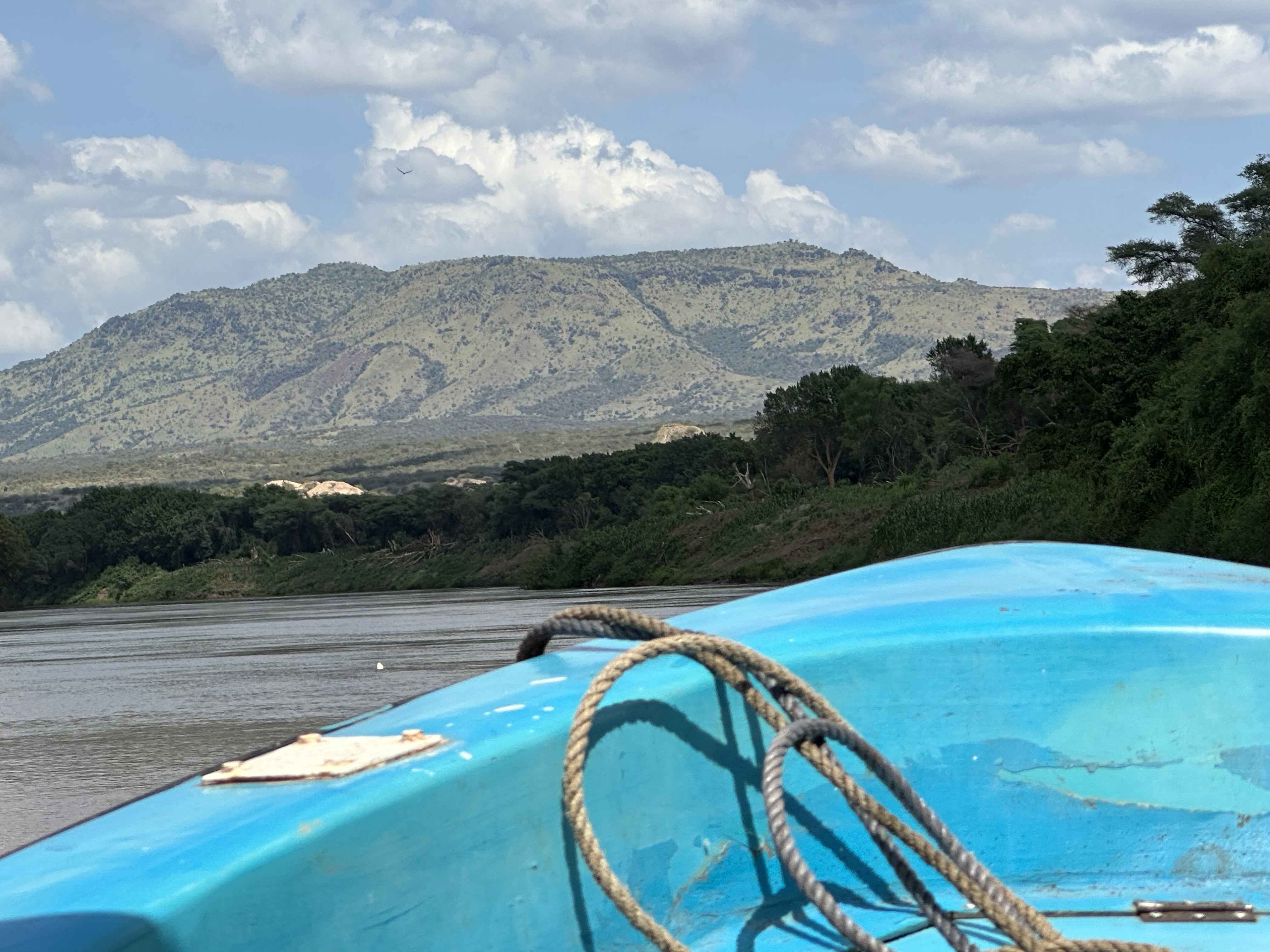 Eventually our Kenyan guide, Halowyn, arrived in two boats for our journey up the river, one boat full of gear, a second for us explorers. After an unimaginable lunch of fresh greens in a salad and wonderful charcuterie, we headed for the mouth of the river. As we reached the area of a sandbar we had to cross to enter the river, it was sadly evident there was not enough water to float our boats. We were in the water up to our knees but were unsuccessful in getting the boats to move over the sand. With crocs in the water our pushing efforts did not last long. Our plans to explore the Omo River delta were dashed. We did go on to have an enjoyable time with Halowyn, exploring other places and tribes around the lake.