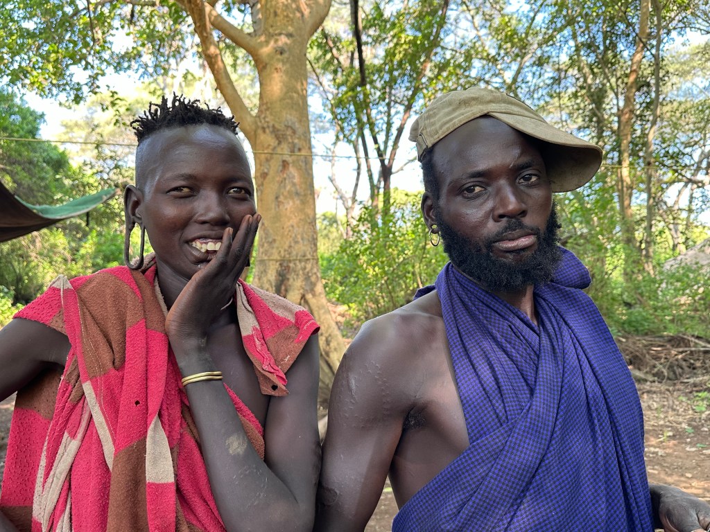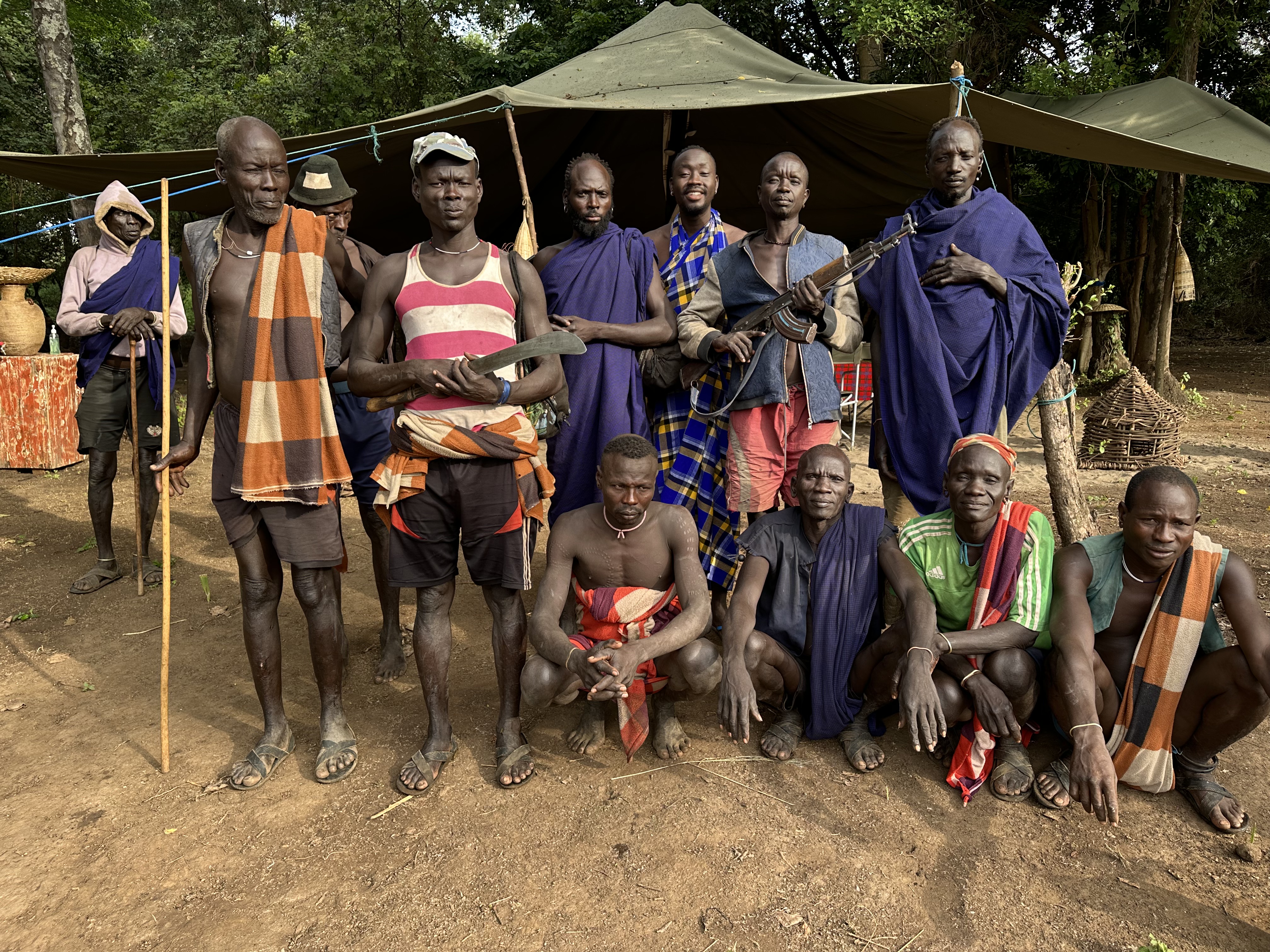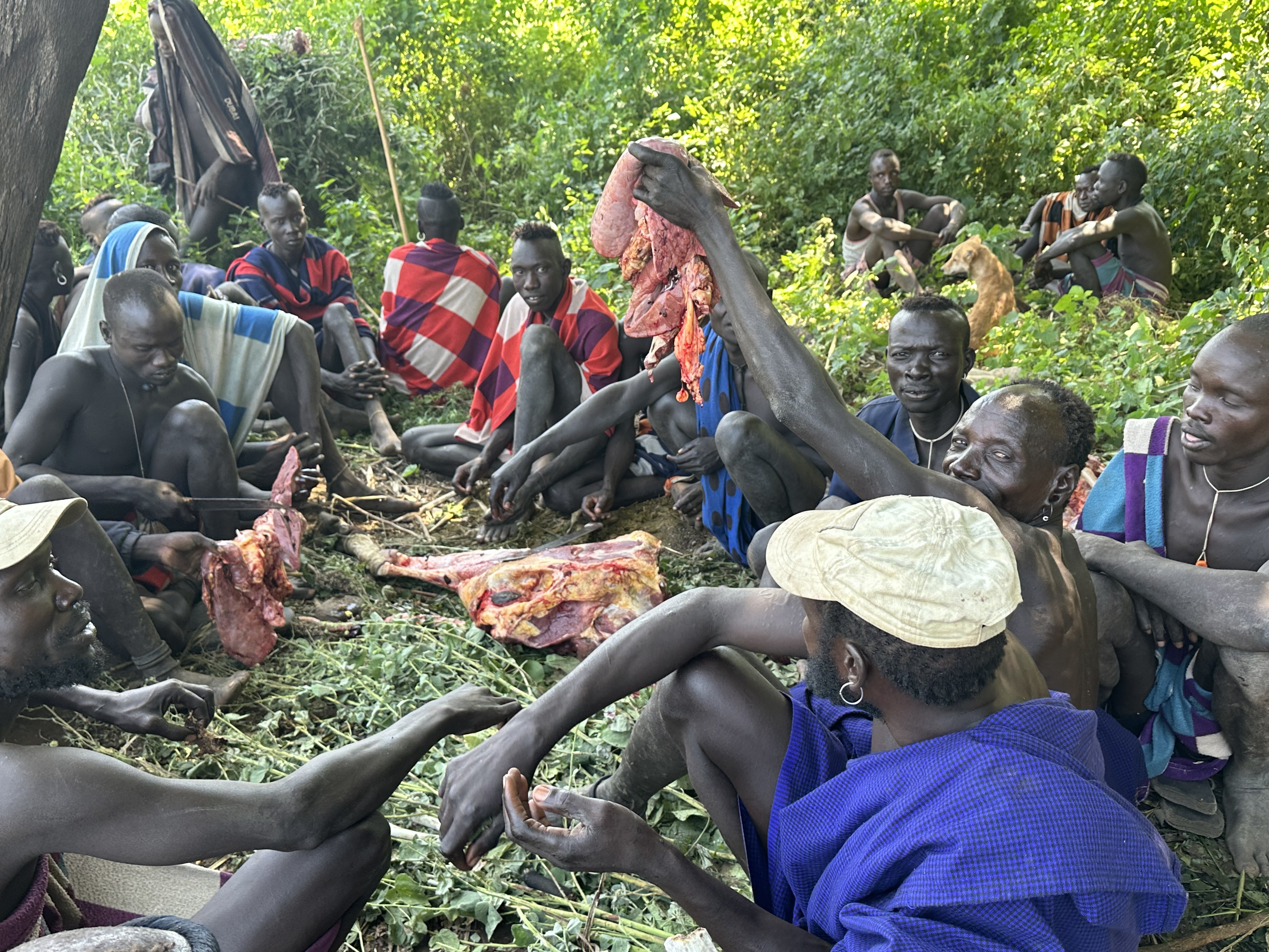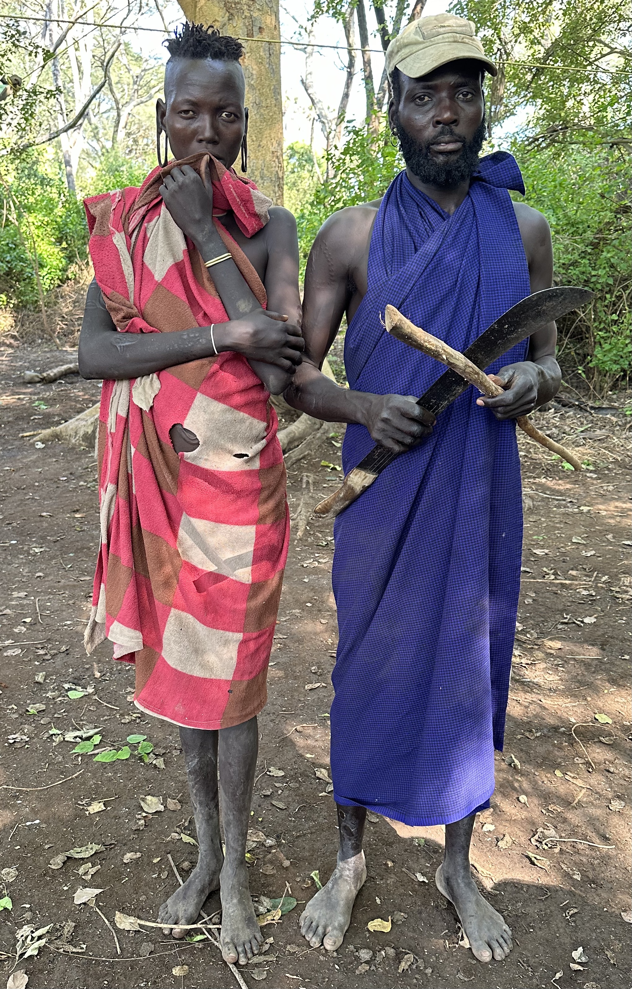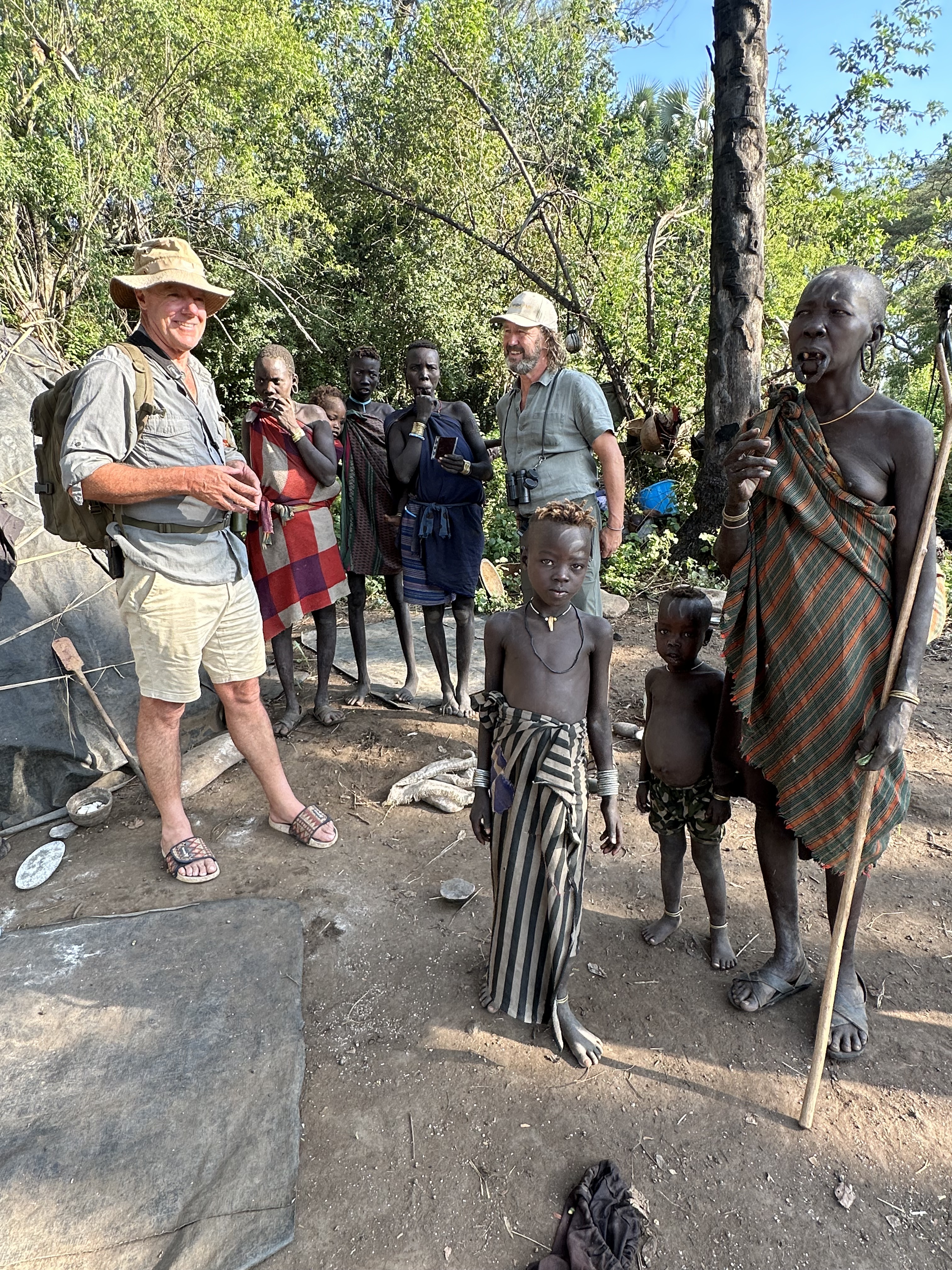 The only cool time is in the early morning, so we were up early to enjoy it. After porridge for me and an English breakfast for Mark, Will and Graham took us for a walk through the woods to a clearing where we met the Mursi people in a small encampment. My first photo of a Mursi was of a bearded man named Chamankoro and his wife. At the encampment the men were listening to a talk about allowing tourists into their midst and why they should be agreeable. Money, medicine and education are the reasons to allow us in. After the talking, a butchered cow was thrown onto a roaring fire and shortly the crowd was happily eating the meat. I noticed there were no women present, except me. We ate a small piece and found it very tasty.