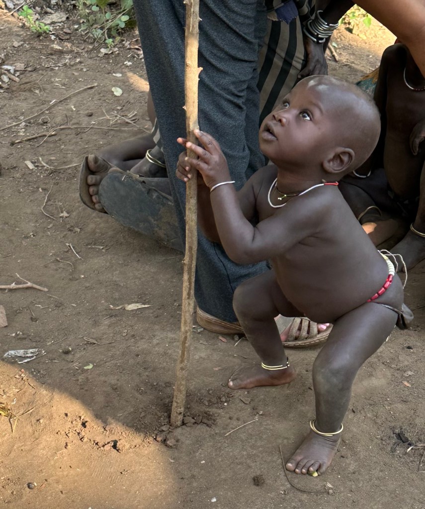At the first compound we visited we were invited into their round wood-pole house with a thatched roof. There was the husband, Banko, his number 1 wife, Lapa, several children, and other family members who continued to crowd into the space to catch the action. We were just in time for their morning coffee service and were served coffee made using boiled coffee bean husks and served in a calabash shell. Lapa had many calabash shells to go around, and everyone was served except the small children. Banko then gave a blessing by taking a sip of coffee and blowing it out in a fine spray. Mark and I took a couple of sips of the brew just to be polite. I noticed the coffee boiling and figured it was probably safe although the calabash shells were dusty and Lapa used her hands to wipe the dust off. There were a lot of back-and-forth questions about them and us. We talked about cows, sheep, and goats and how his family would take care of the animals when he is gone. Banko wanted to know about our “resources” and who would take care of them because we had no children. He asked if he could tend our resources himself. We told him we had made other provisions and that our resources would go to help other people. He accepted our answer and stepped outside to tend to his hoofed resources. We were pleased with the interaction and happily chatted with other Hamer people in the village.