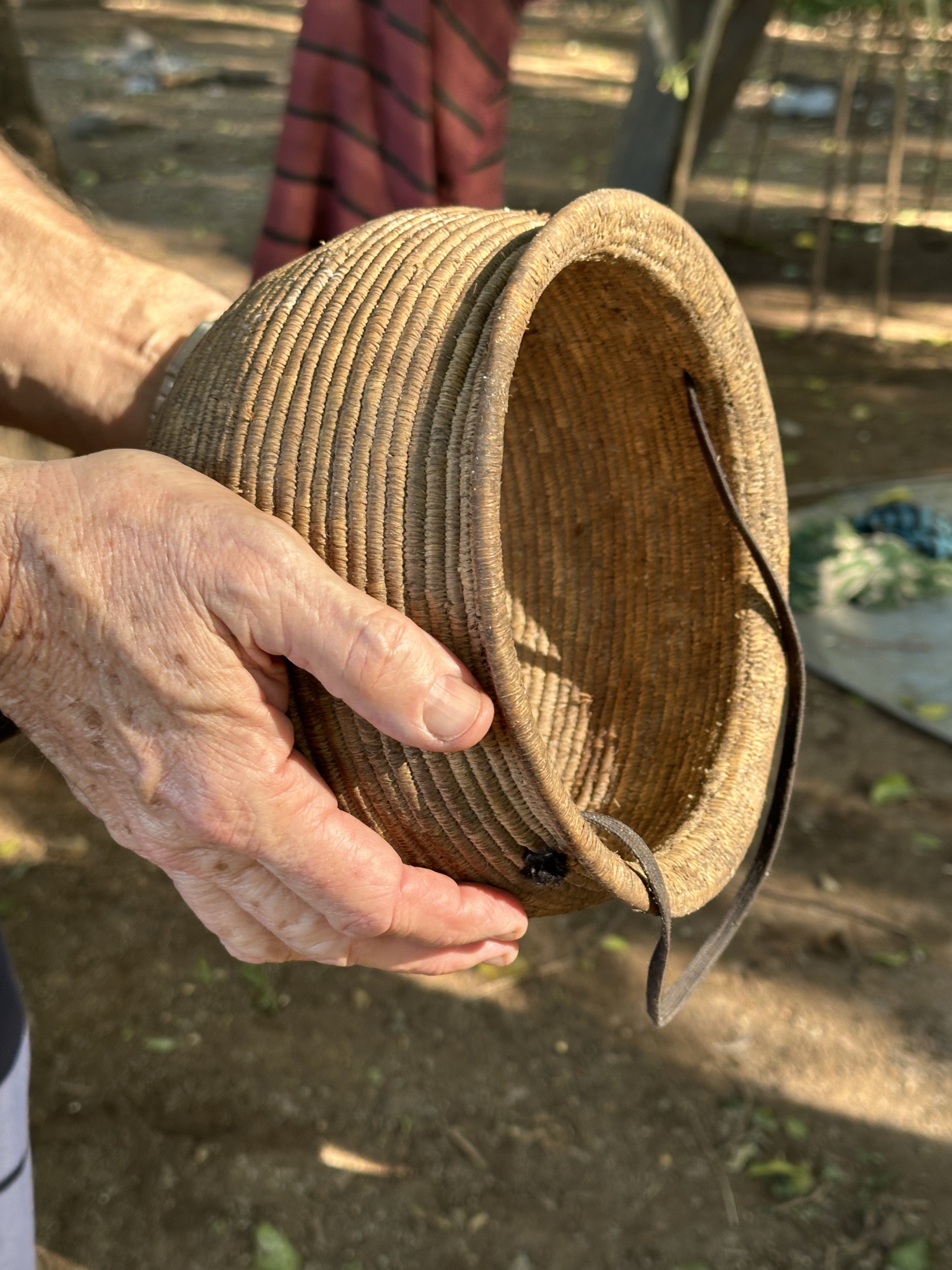 The Mursi people, whom we visit first, attribute overwhelming cultural importance to cattle. They wear bones, shells and skins and practice scarification. The women are known for their clay lip plates. The lip plates are a sign of beauty and are worn only when the wife is serving food to her husband. Women start cutting their lower lip when they are about 18 and expand their lip opening over time by sticking ever larger diameter sticks in the opening. It is a very painful process. All Mursi have their lower front teeth removed when they are small children to help them survive should they get lock jaw, which they get from tetanus, a common ailment within the tribe. Notice the image of the standing woman tethered to a log. She is unhappily married to an older man and has run away a few times. Sooner or later she will have to accept her fate. The basket is so densely made that it is water tight.