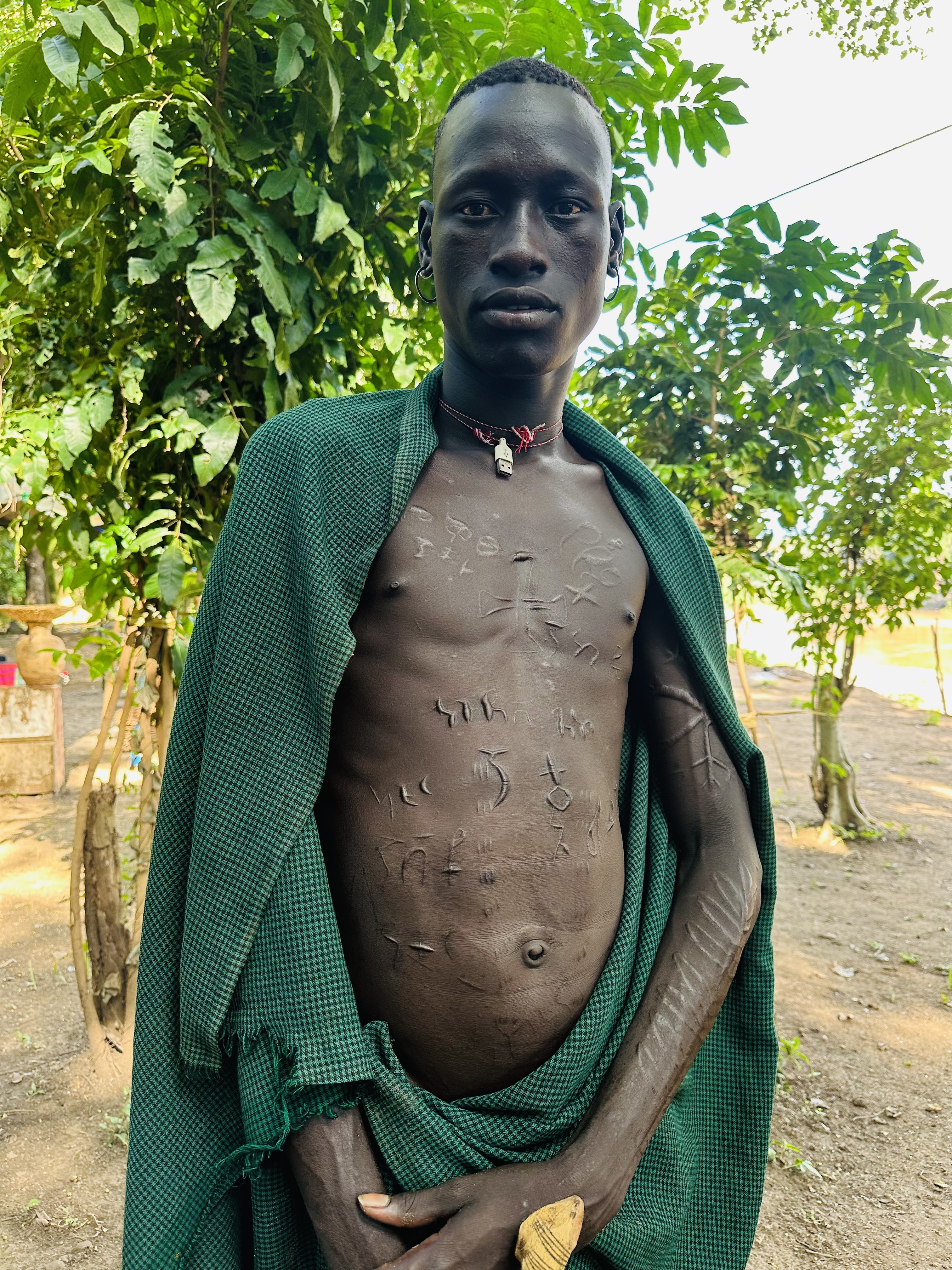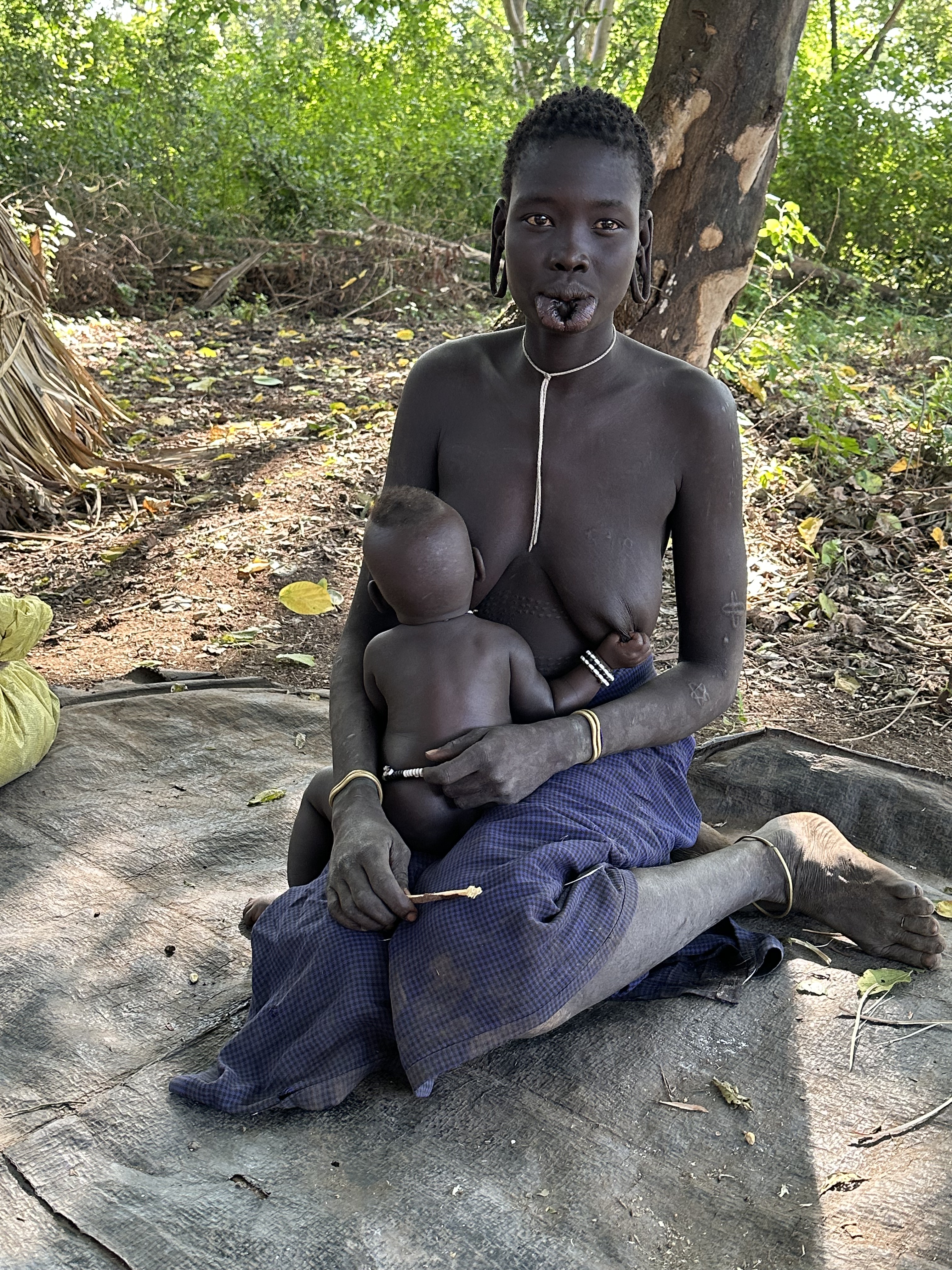 He told me there are 25,000 or more Mursi, despite what commercial publications say that the population is at no more than 10,000. The Mursi are not nomadic. The men have cattle farms away from the family encampment where they live on a diet of cows’ blood and milk. When in camp, they and their families subsist on sorghum, which they grow on the banks of the Omo River. They are, therefore, agro-pastoralists who they love and respect each other. They have a somewhat pagan belief system. They believe in nature and evil spirits who must be appeased. There is no life after death, but there is consideration paid to ancestors. Burials take place immediately after death, but mourning lasts for 4 days for men and 5 days for women. During the mourning period rituals take place to appease evil spirits.
