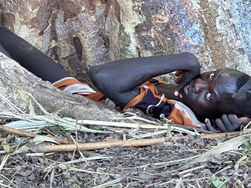 In recognition of Graham’s efforts to improve their circumstance, the Mursi were having a bull ceremony. At 11:30 am we walked 20 minutes through the woodland to a clearing where about 40-50 Mursi men were having a discussion about the effects of allowing tourists in their midst, while a fire roared in preparation for cooking a large bull. Someone was waxing on with questions about why should they allow tourist into their area. Then Bardoley got up and spoke about the benefits of having tourists, especially for medical assistance and schools, which are very difficult to get. The government had promised such facilities but failed to deliver. A School teacher had been unwilling to stay very long and the monthly medical clinic has not materialized. As Bardoley spoke, slabs of beef were thrown on the hot ash and cooked very quickly. When he finished, the meat was pulled out of the fire and consumed by the men using their machete’s to carve off pieces. To keep the meat clean, large bunches of green brush were used as tables to hold the uneaten meat. It smelled so good, we each had a few small pieces too. We took a lot of photos and then headed back to camp. One last image was taken of a lonesome boy at the edge of the clearing. Bardoley told us he had owned the bull and was sad about it being killed, even though he was paid for it.