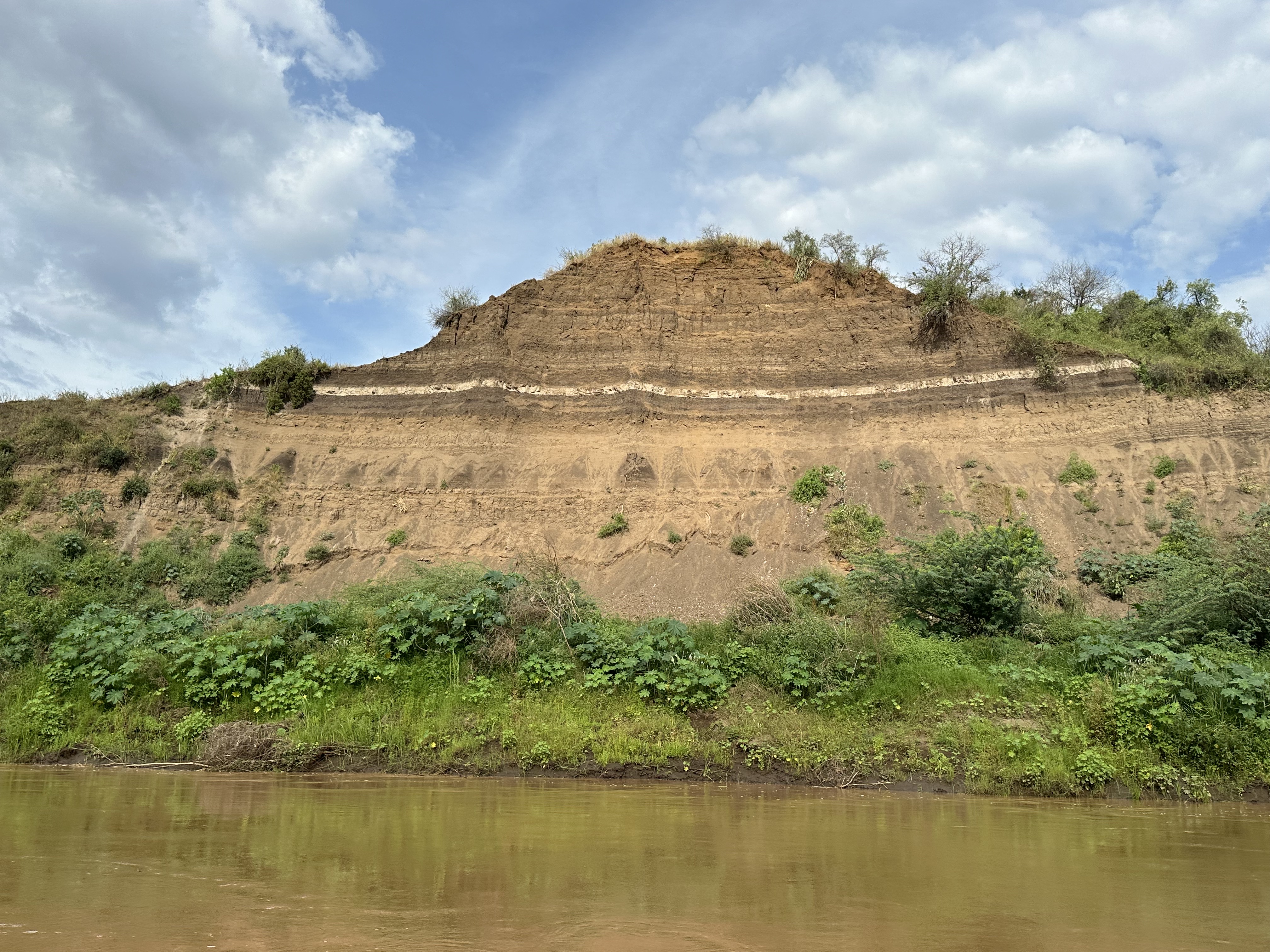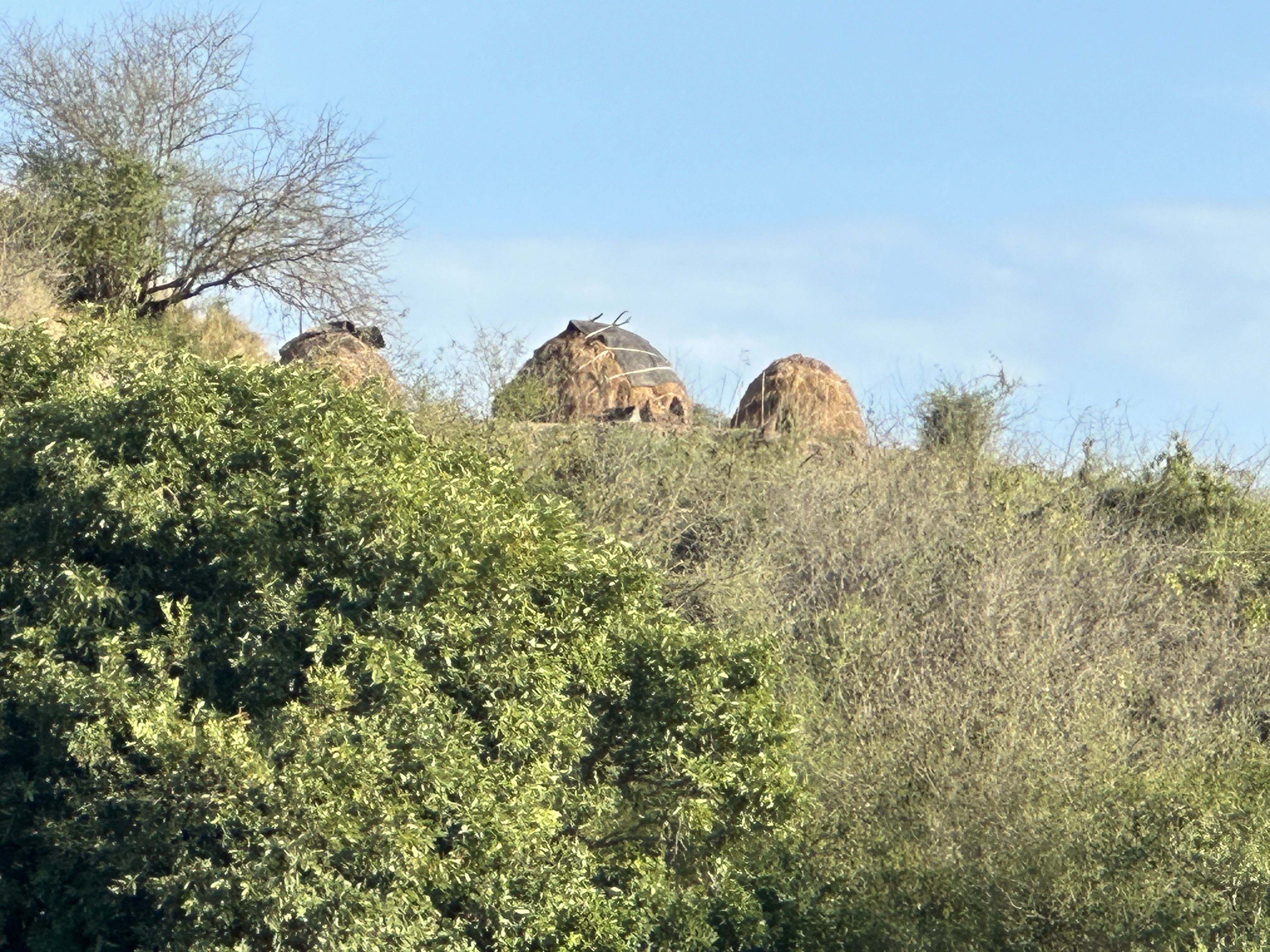 ash layer was quite deep and must have represented a long volcanic period. At last, we arrived at our second camp, Lale, where the Kara people live. The camp is on a bluff above the river and offers some shade and cooling. As expected, we are the only guests in camp. Our tent is on the edge of the bluff. We were greeted by vervet monkeys and found the tent slightly larger and nicer than the Chen Camp. We settled in quickly. Behind the camp is Korcho, the local Kara village where most of the camp employees live.