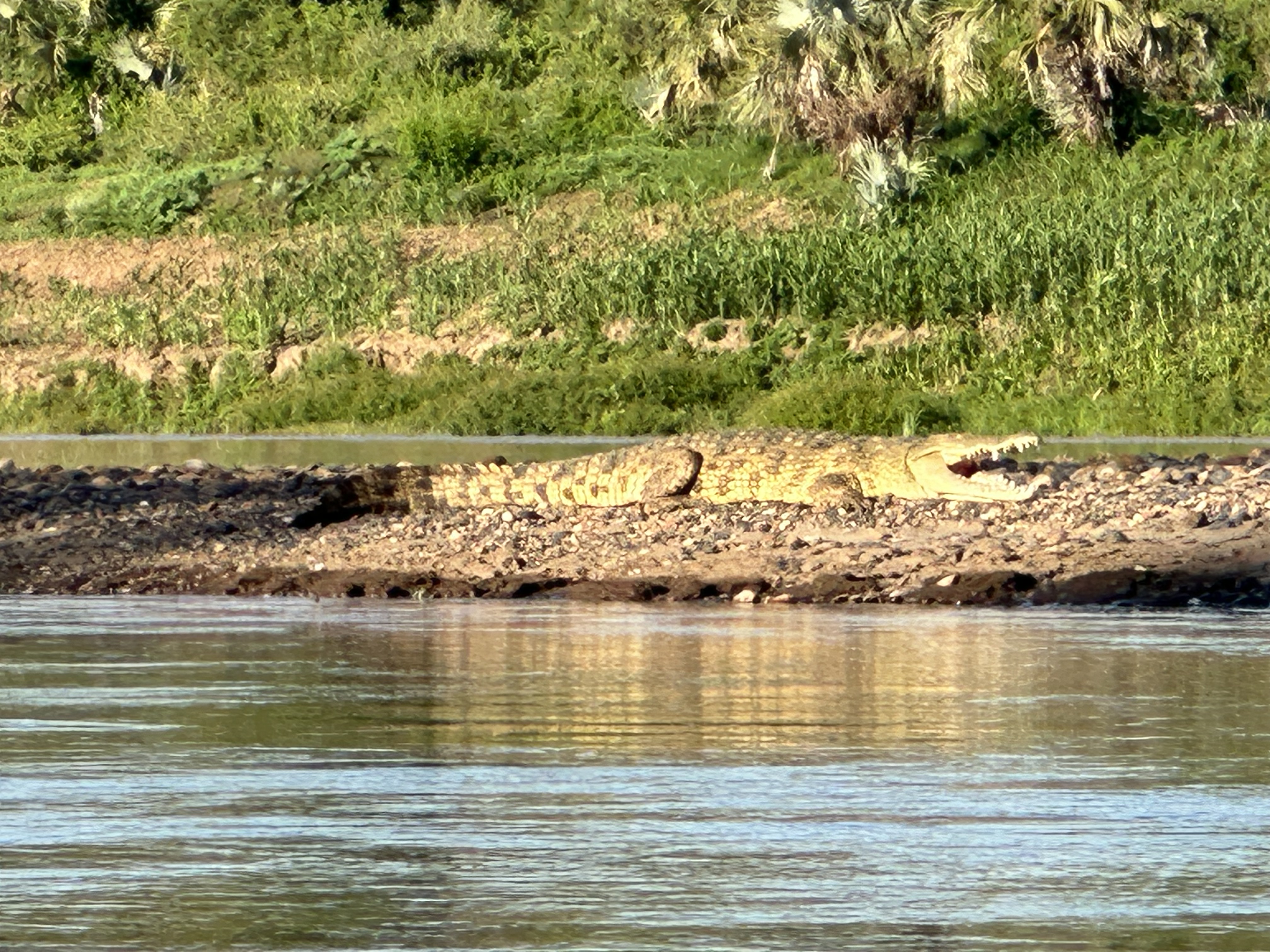 The landscape changed to fields of papaya, banana and open areas ready for planting. Anyone can rent the government owned land and plant crops. We followed that road in almost a straight line for an hour and finally reached our put in on the river. The group of people at the put in were members of a local tribe called Nyagatom. They were not friendly or welcoming, so we moved directly to the boat, where we met Graham, the camp and boat owner, and cast off. With the engine running and the wind in our faces, we were comfortable motoring upstream for the next couple of hours. Both sides of the river are covered with trees reaching down to the fast moving, light chocolate river. There were the usual birds and a few to add here: goliath heron, Egyptian plover, yellow-billed black kites and Northern Masked Weaver birds. We saw no hippo but there were several crocks along the riverbank. At last, we reached camp and moved into our tent under a large fig tree. The tent was a good size and had several screened air vents. The attached bathroom was open to the sky and had dried figs all over the floor. I pushed them out of the way, and we enjoyed the bucket shower with cool water. We were too hot to want a warm shower anyway. We slept well without bed covers most of the night.
