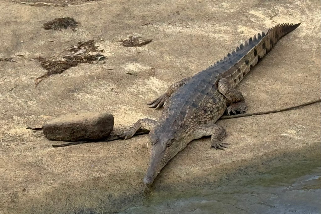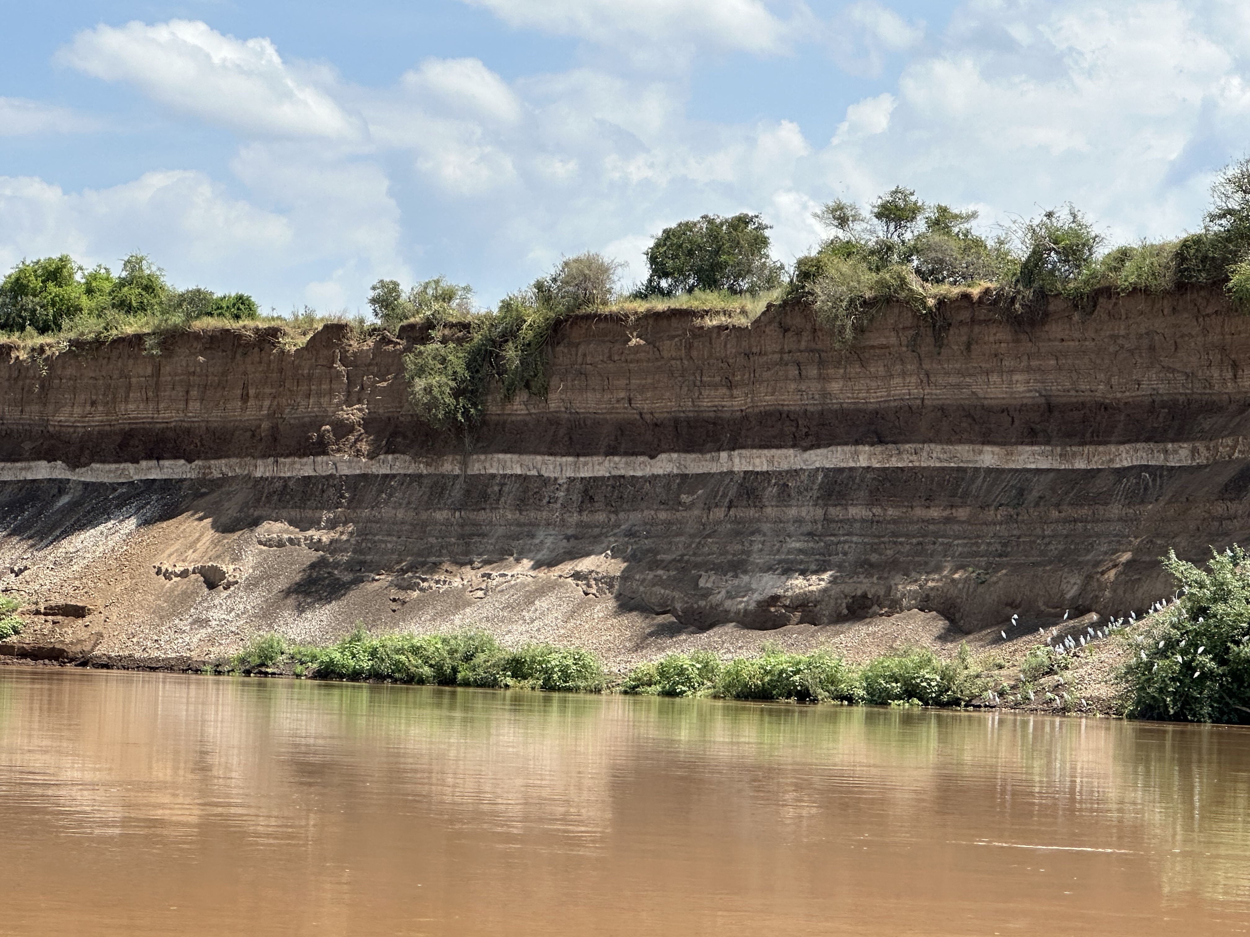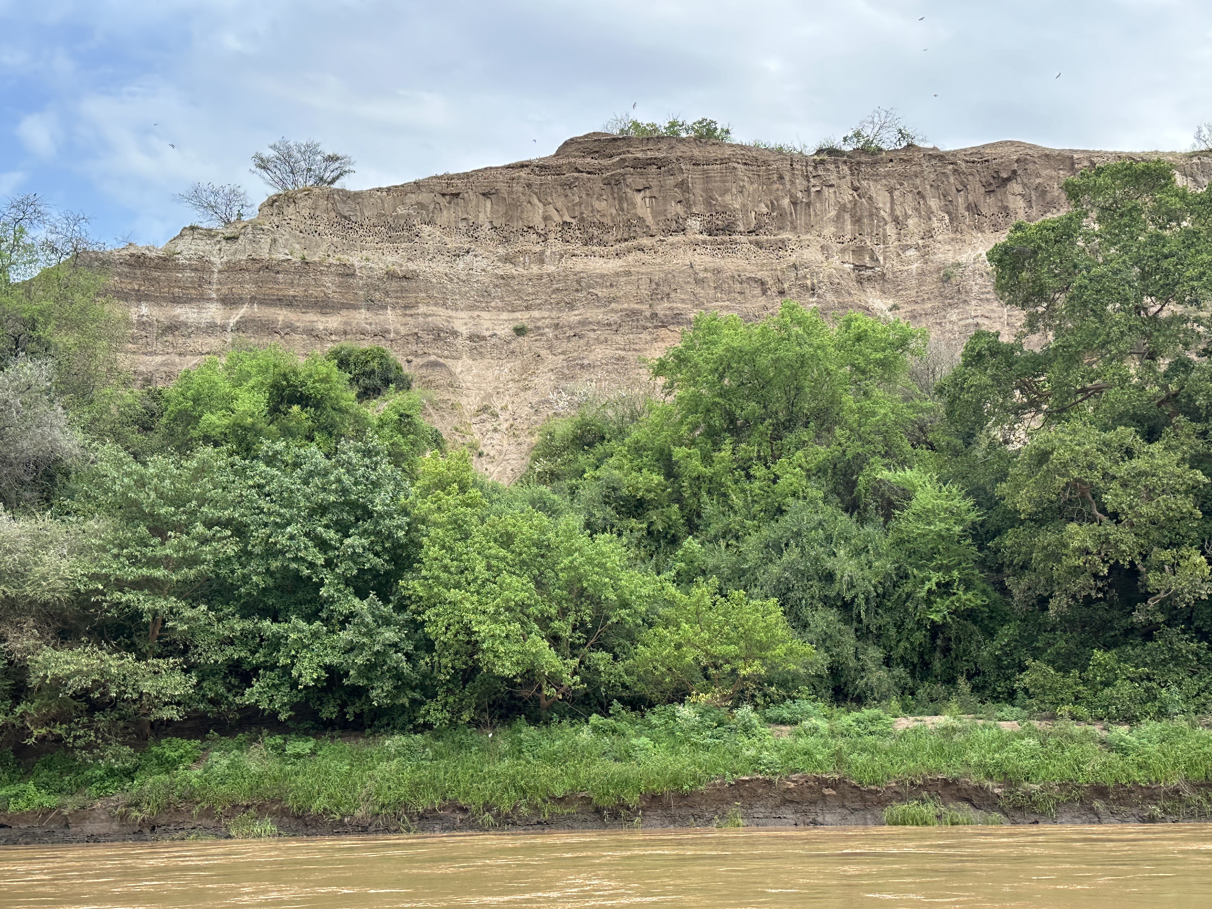 Breakfast and goodbyes to the Chen Camp staff at 8:30. Gave a special hug to Bardoley. Then we motored down river for an hour to the takeout where our cars were parked. So, we were off the boat and into cars for the next leg. Another bumpy dirt road followed by the paved highway for 1.5 hours to another 40-minute river trip, all to avoid an 8-hour serpentine river ride. Our boat was larger, and the next leg was pleasant. We saw a Sykes’ monkey in a tree and many bee eaters starting to build nests in the hillsides above the river. I was fascinated by the different striation in the cliffsides and wondered how old the hills were. Will thought they were at least 300 thousand years old.