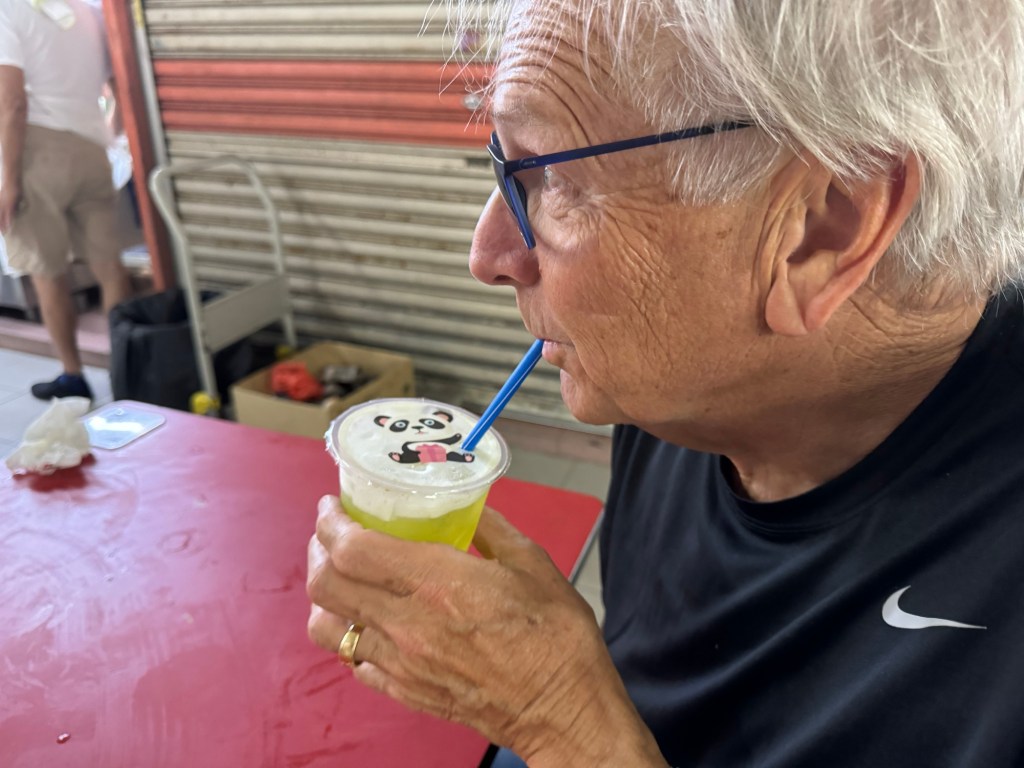 We took a taxi to Chinatown and went into a huge food vendor court. The place was packed with vendors, tables and people buying and eating various food items. Charlotte sat us down at a dirty table, which we cleaned ourselves, while she shopped for 3 different food items starting with a drink of freshly squeezed sugar cane juice. The first items she brought were a plate of Braised chicken and rice; Water cake made with rice flour and a spicy condiment; carrot cake made with daikon. Her next trip produced a dish called Popiah, made with a large, thin biscuit and Jicama; and Laksa, a soup bowl with rice noodles, soy beans, mushrooms and fish. That was enough already. My favorite was the Laksa. We wandered around the court looking at other food offerings, which we were too full to sample.