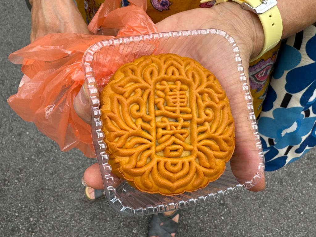 Then we took the subway to Little India where we sampled a version of hot Chai; a dish called Prata, a flat bread made with wheat flour, accompanied by a curry and lentil sauce; Appan, a large crepe made with coconut milk and rice with a dipping sauce of warm, sweetened coconut milk; and finally Thosai, another crepe made with fermented black dough and rice with a dipping sauce. Prata was Mark’s favorite food. For dessert, Charlotte gave us a moon cake to split. It was filled with lotus paste.