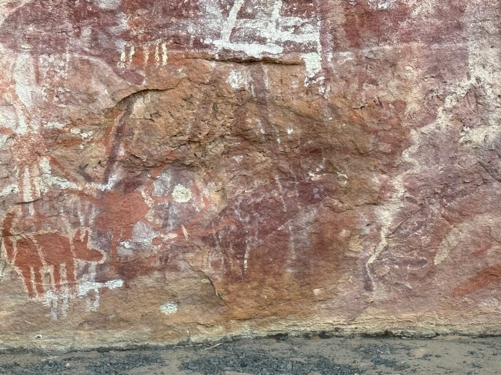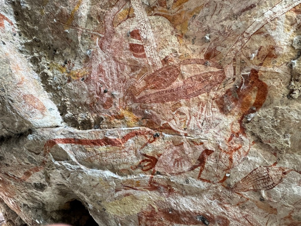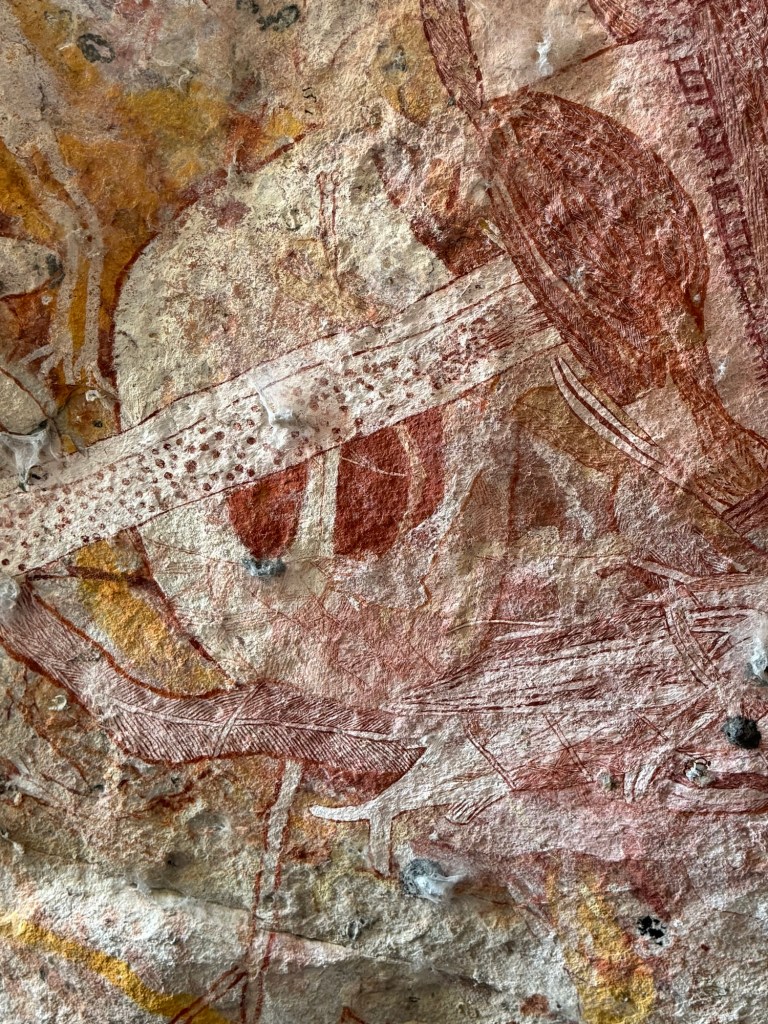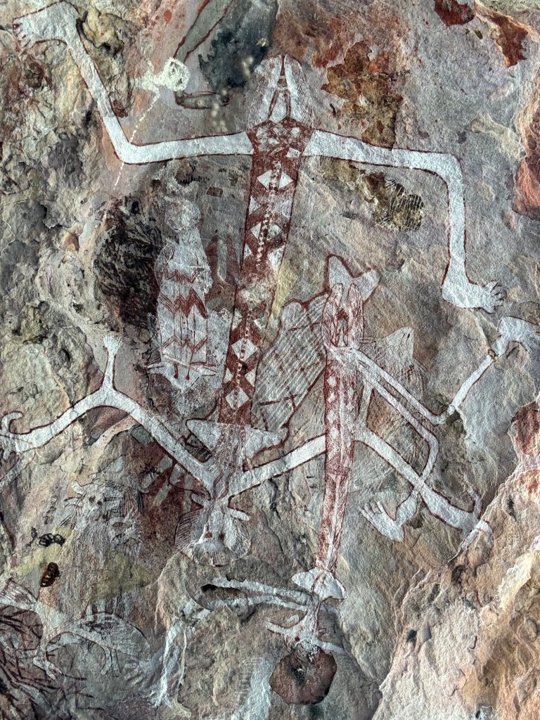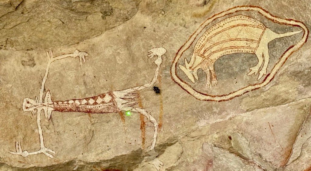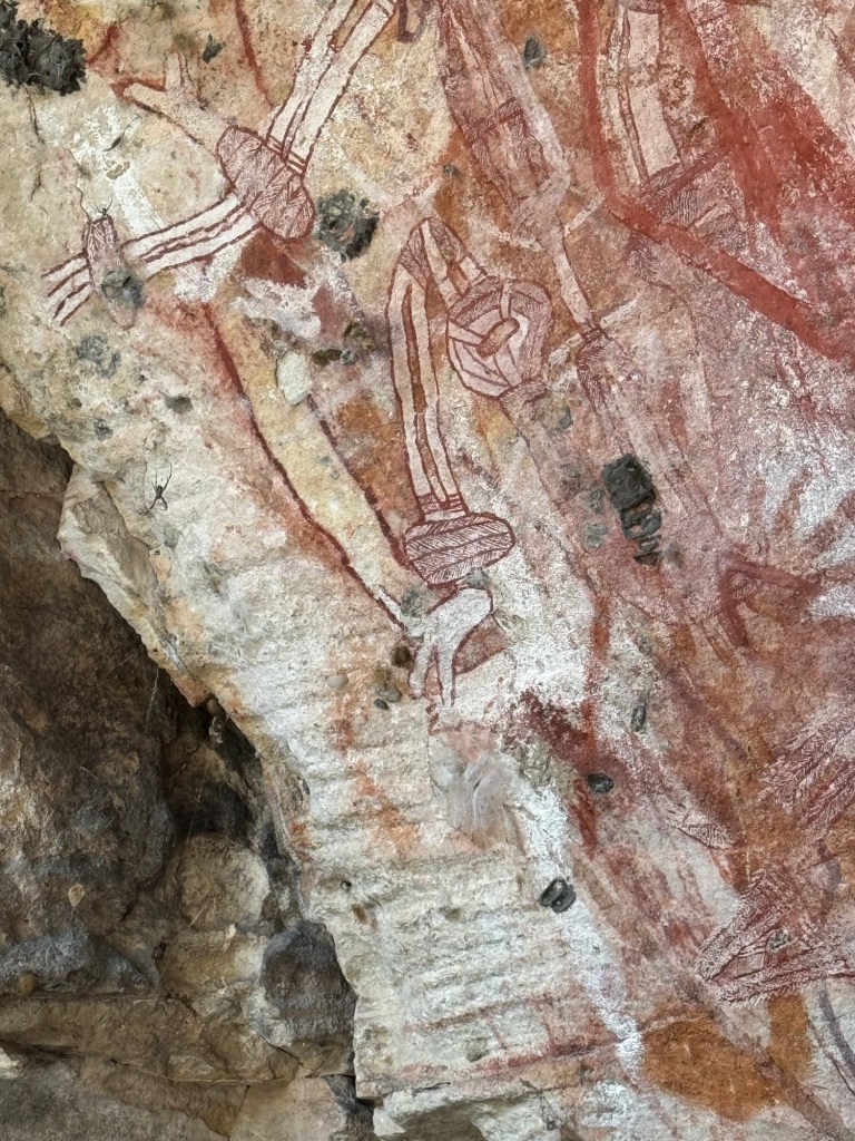After 2 hours we arrived at Injalak Hill, an iconic indigenous rock art site, that protrudes above the landscape. Sab introduced us to a local aboriginal guide named Dallas, who led us up the boulder strewn hill to see the art. It was a bit rough going in the heat, but, with Mark’s help, I managed. Dallas spoke very little but was clearly proud of his ancestors’ work. He seemed content with his quiet life and uninterested in changing. I couldn’t help comparing him to our Native Americans, many of whom are independent, industrious and participating in American society.