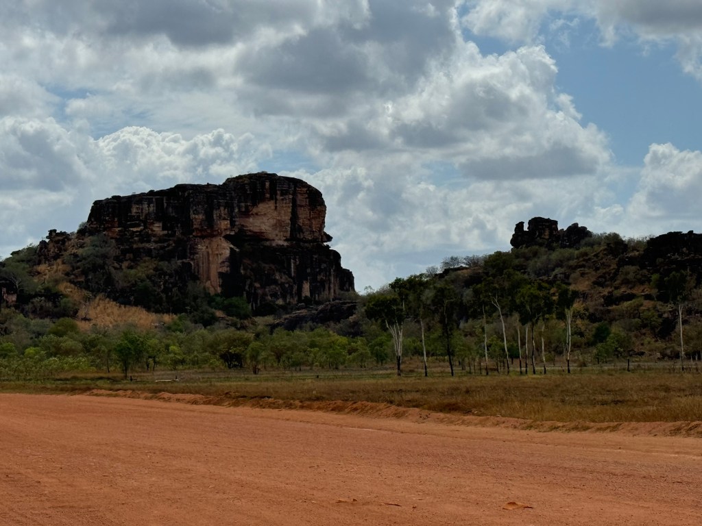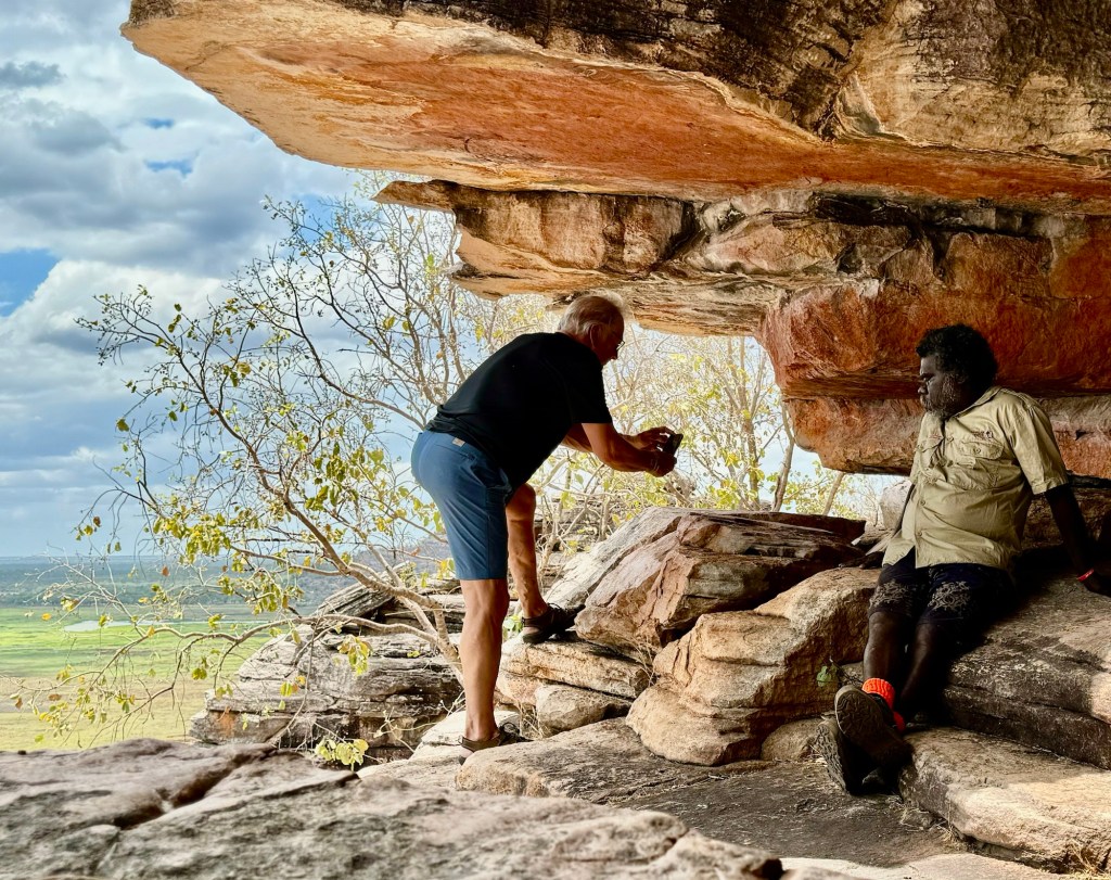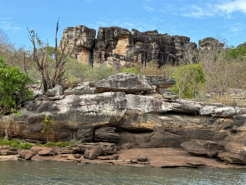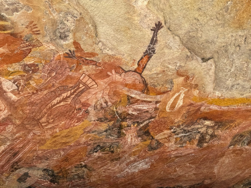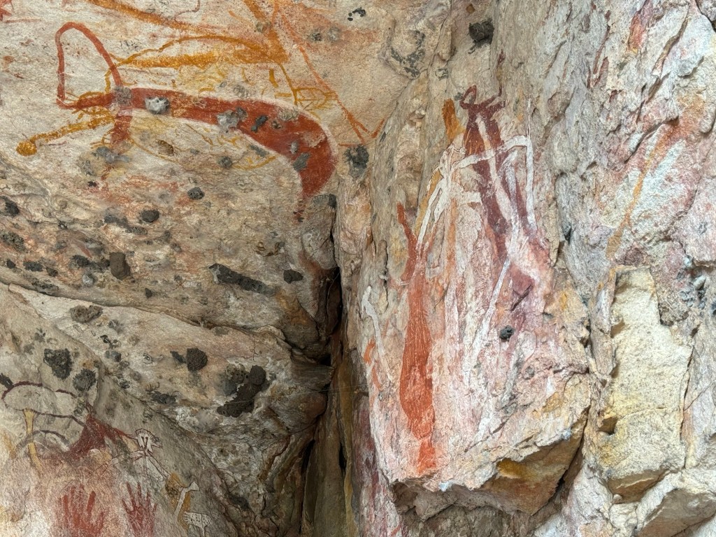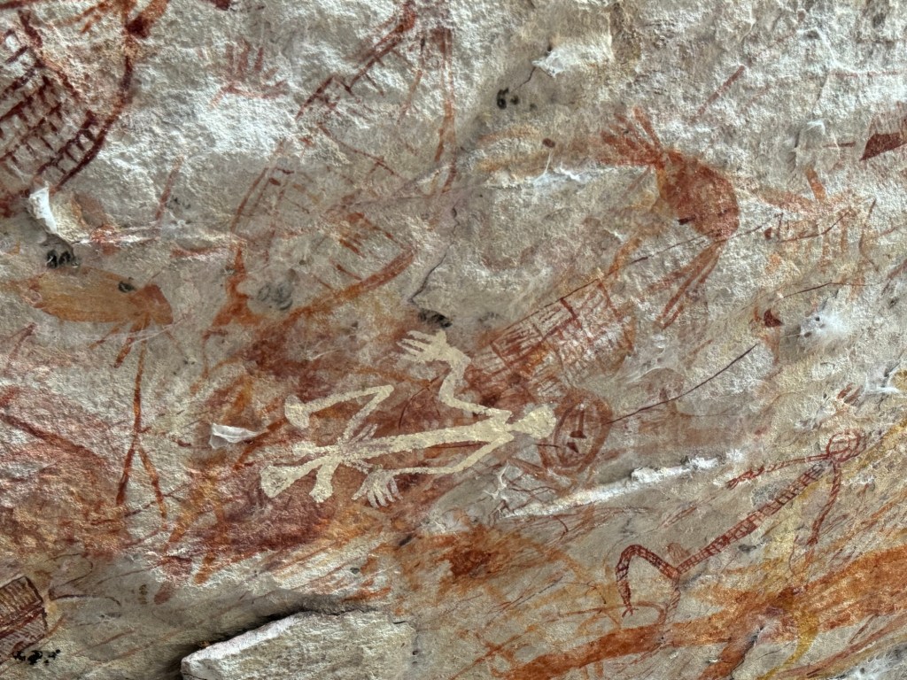 After 2 hours we arrived at Injalak Hill, an iconic indigenous rock art site, that protrudes above the landscape. Sab introduced us to a local aboriginal guide named Dallas, who led us up the boulder strewn hill to see the art. It was a bit rough going in the heat, but, with Mark’s help, I managed. Dallas spoke very little but was clearly proud of his ancestors’ work. He seemed content with his quiet life and uninterested in changing. I couldn’t help comparing him to our Native Americans, many of whom are independent, industrious and participating in American society.