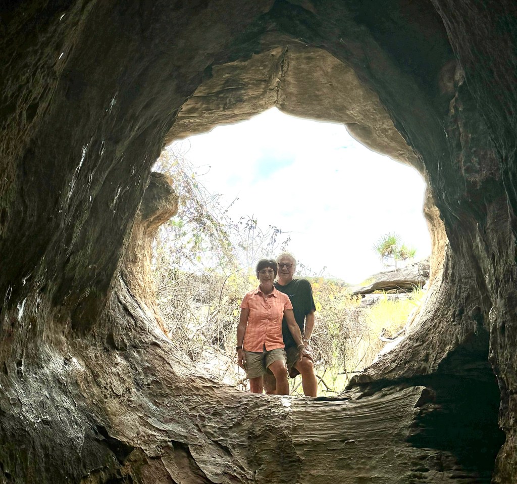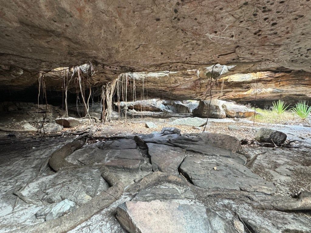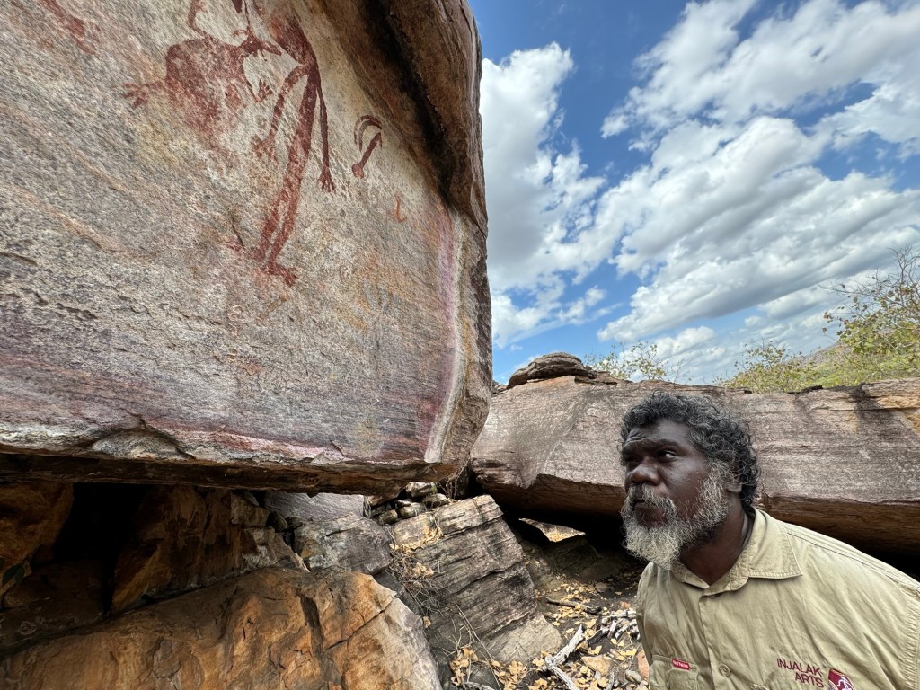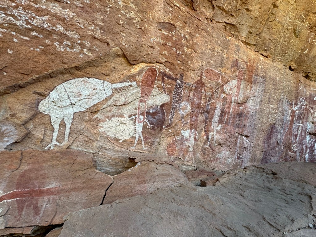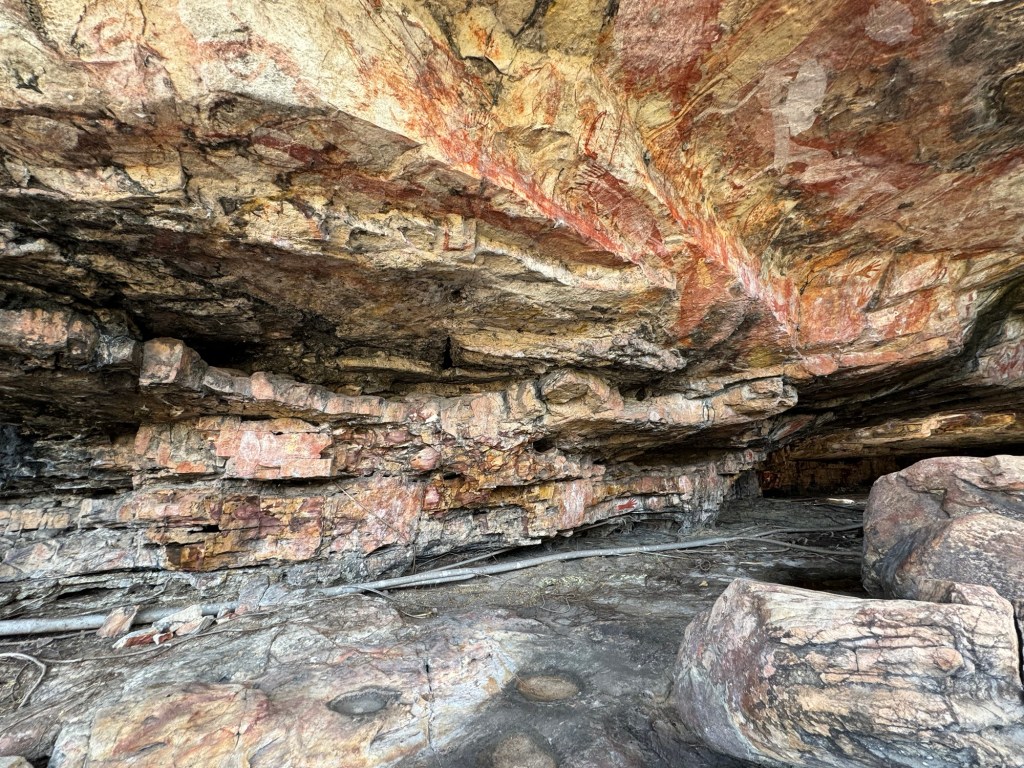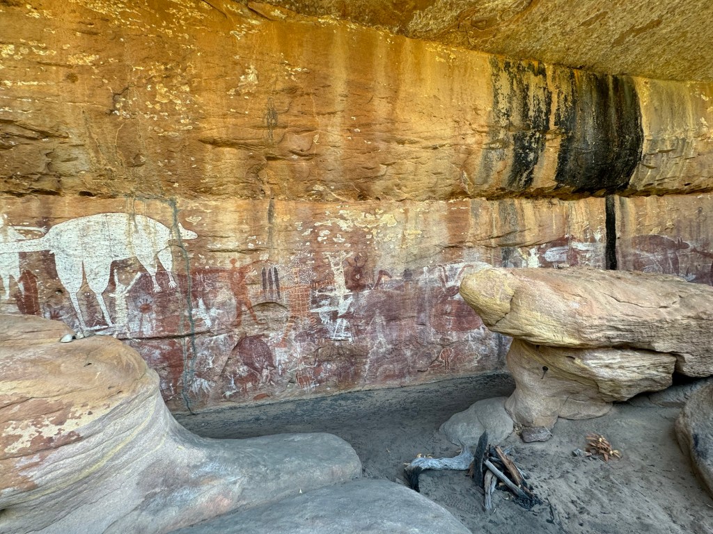 After 2 hours we arrived at Injalak Hill, an iconic indigenous rock art site, that protrudes above the landscape. Sab introduced us to a local aboriginal guide named Dallas, who led us up the boulder strewn hill to see the art. It was a bit rough going in the heat, but, with Mark’s help, I managed. Dallas spoke very little but was clearly proud of his ancestors’ work. He seemed content with his quiet life and uninterested in changing. I couldn’t help comparing him to our Native Americans, many of whom are independent, industrious and participating in American society.