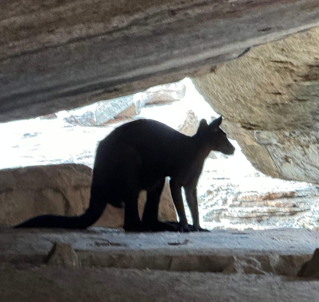 Near the top of the hill we stopped for lunch in a rock cove. Sab put out a delicious sandwich spread and we each made our own. I learned that Sab stands for Sebastian. Just as we finished lunch, we spotted a black Walaroo, somewhat rare,which is slightly larger than a Kangaroo and captured a decent photo of it.